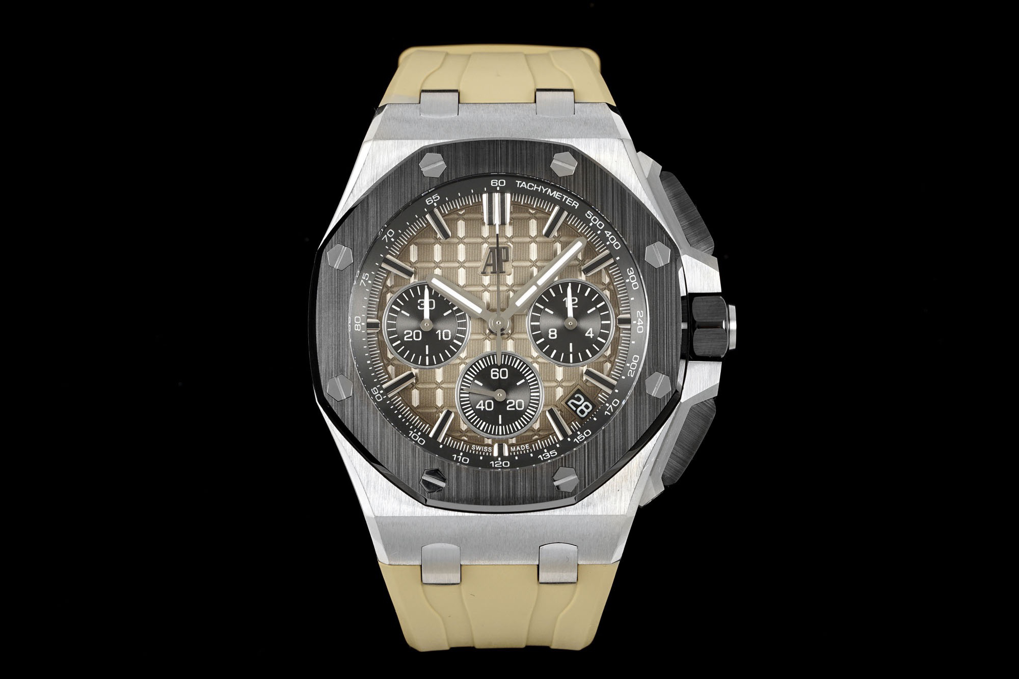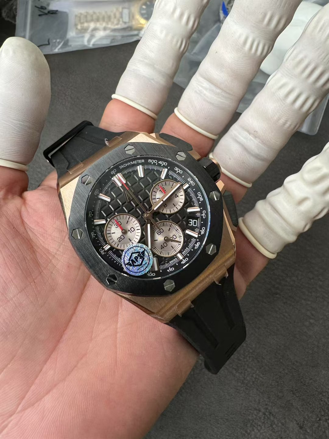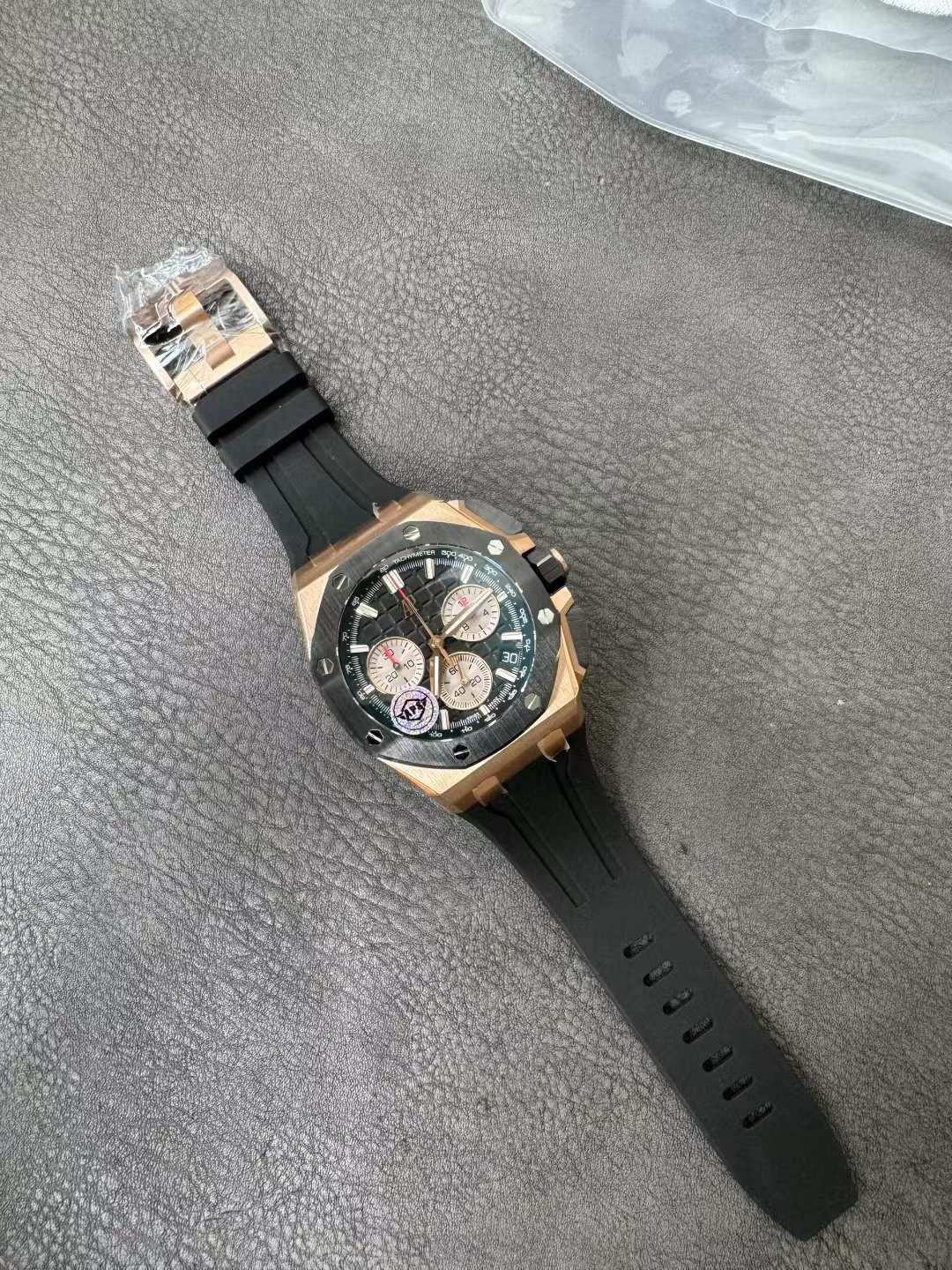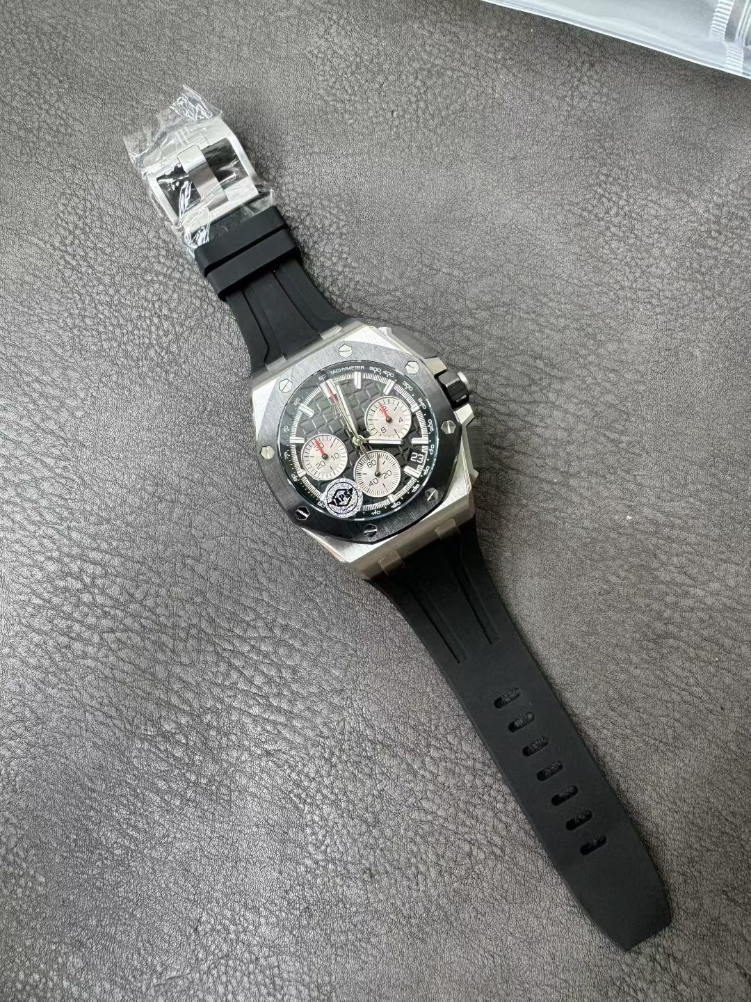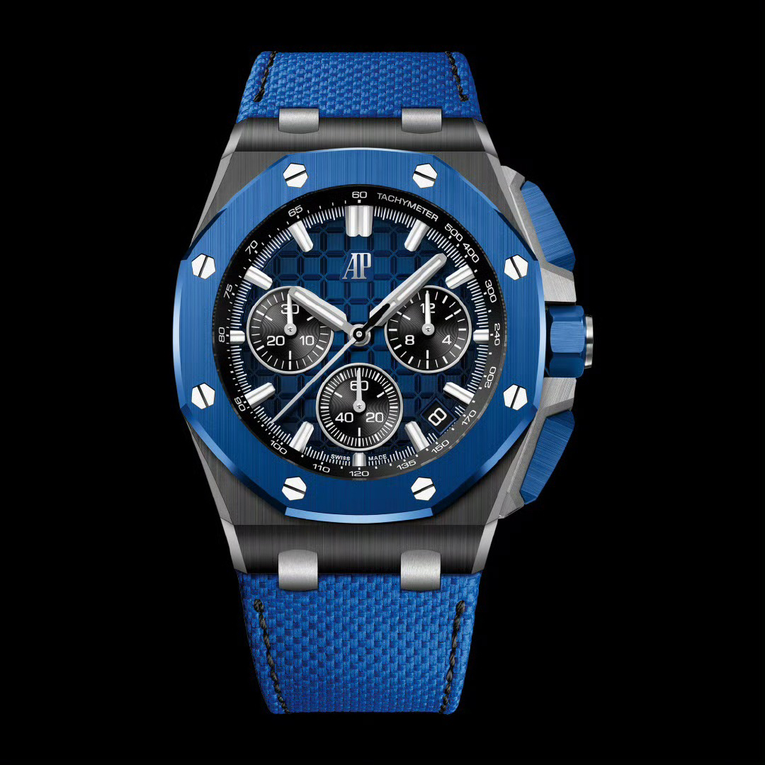 In addition to the titanium version, the Royal Oak Offshore Chronograph 43mm features a black ceramic bezel that creates a sharp contrast in material and color. The crown and buttons are also made of ceramic material. We have purchased genuine second-hand watches and made super copies of the original molds. The craftsmanship is exquisite and the polishing is fine, making it one of the finest pieces in the world ❕❕❕
