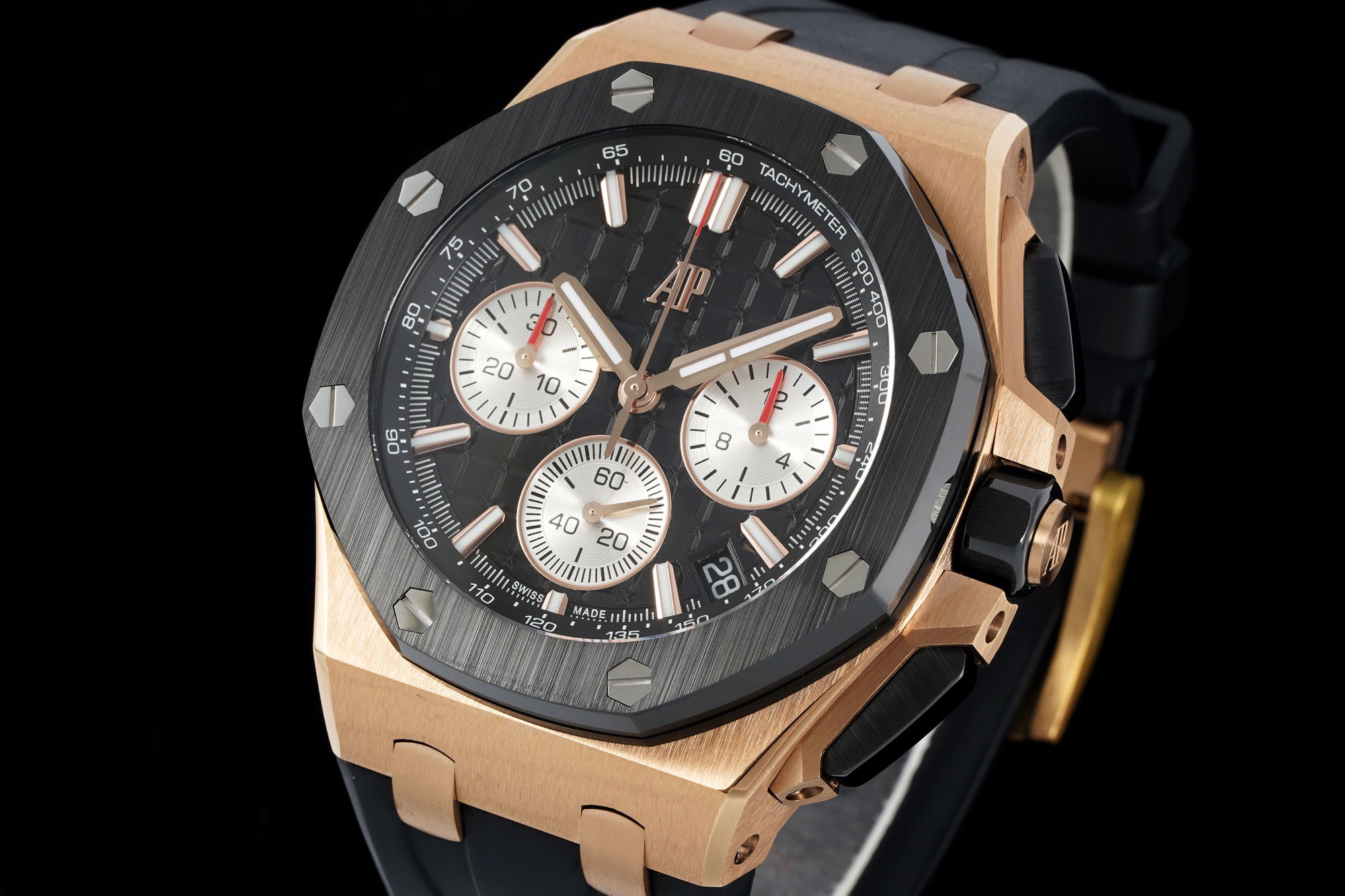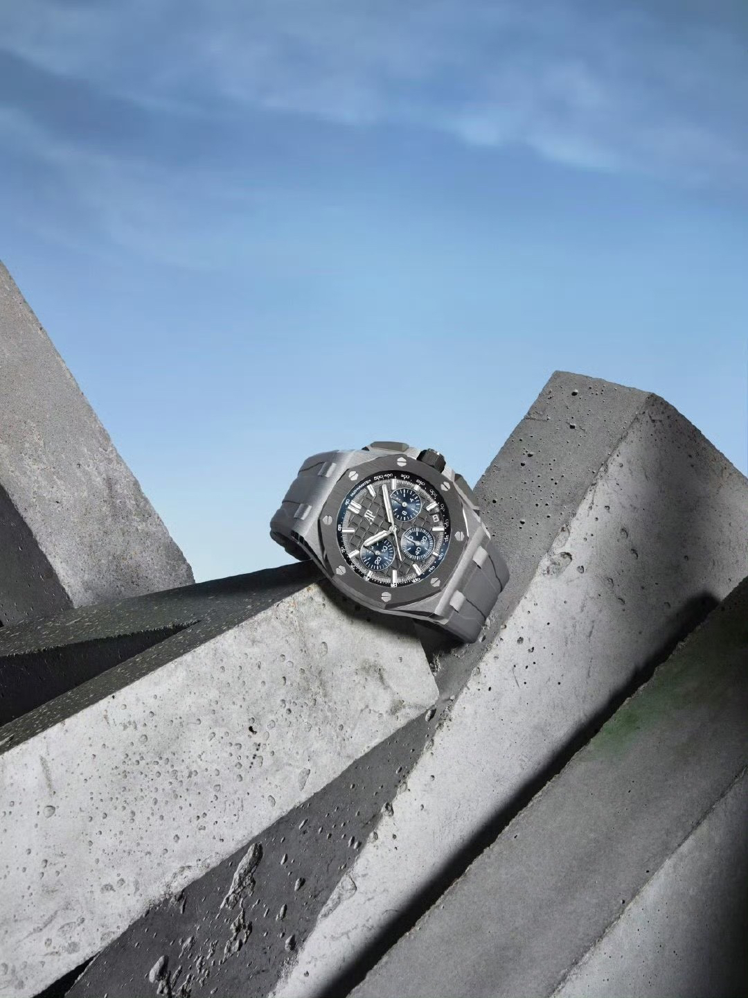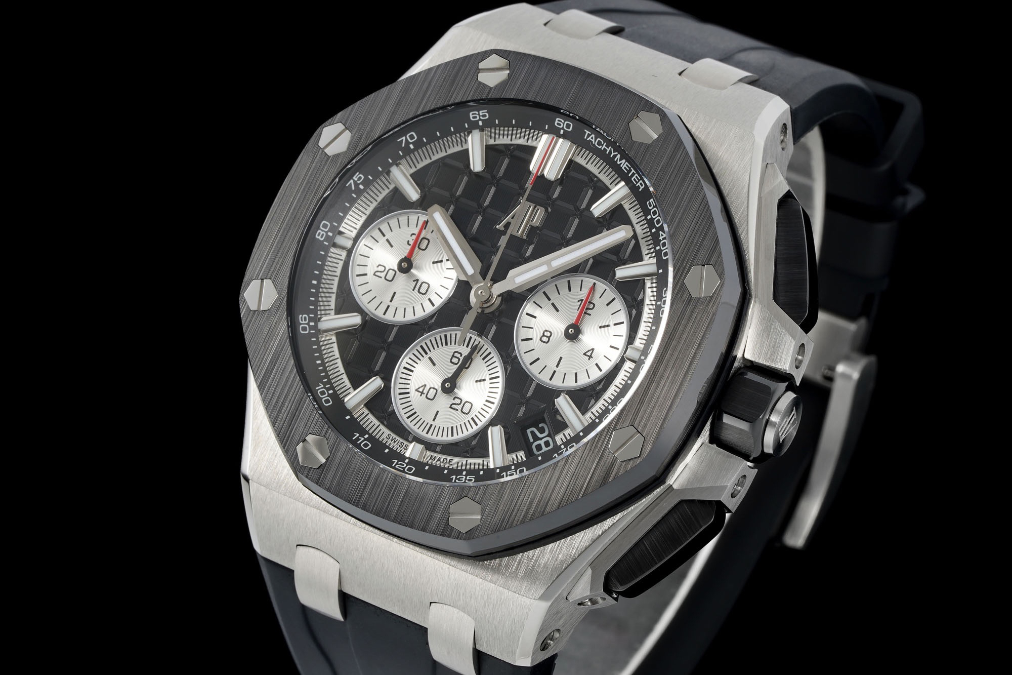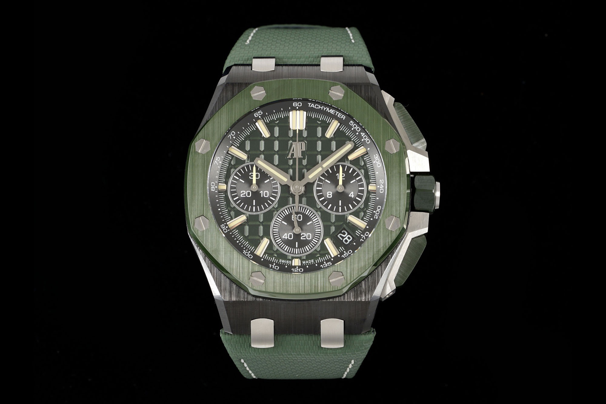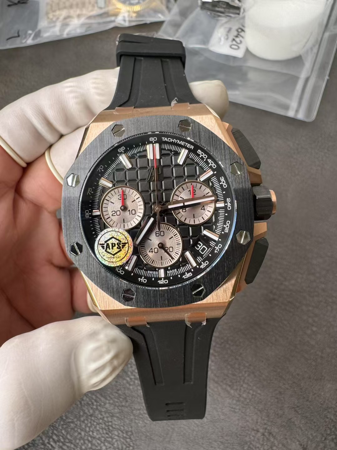 In addition to the titanium version, the Royal Oak Offshore Chronograph 43mm features a black ceramic bezel that creates a sharp contrast in material and color. The crown and buttons are also made of ceramic material. We have purchased genuine second-hand watches and made super copies of the original molds. The craftsmanship is exquisite and the polishing is fine, making it one of the finest pieces in the world ❕❕❕