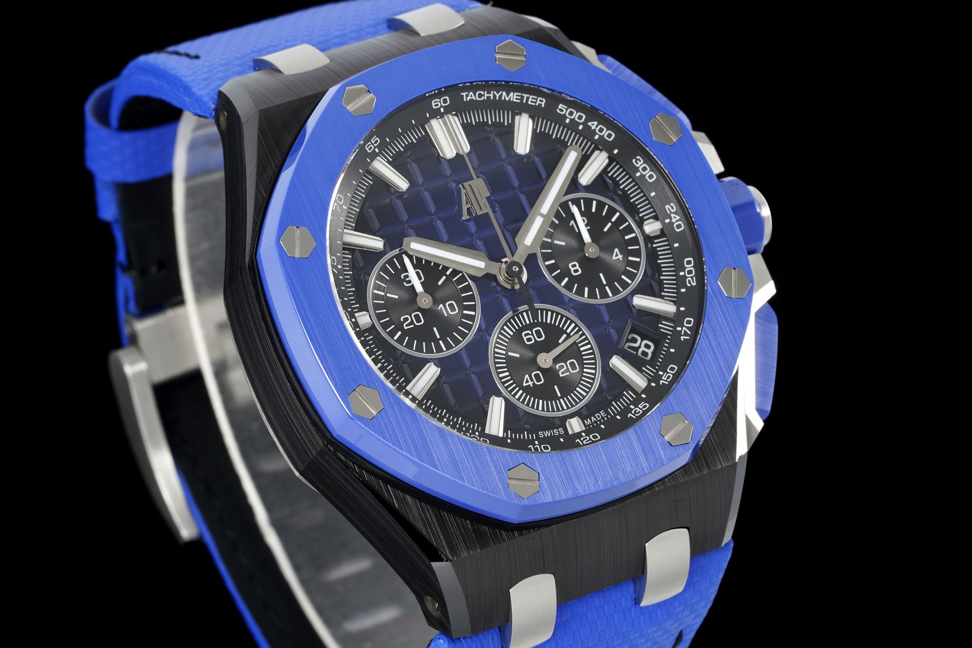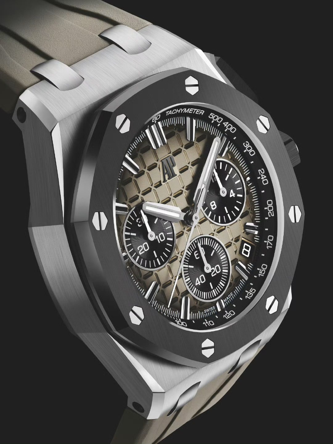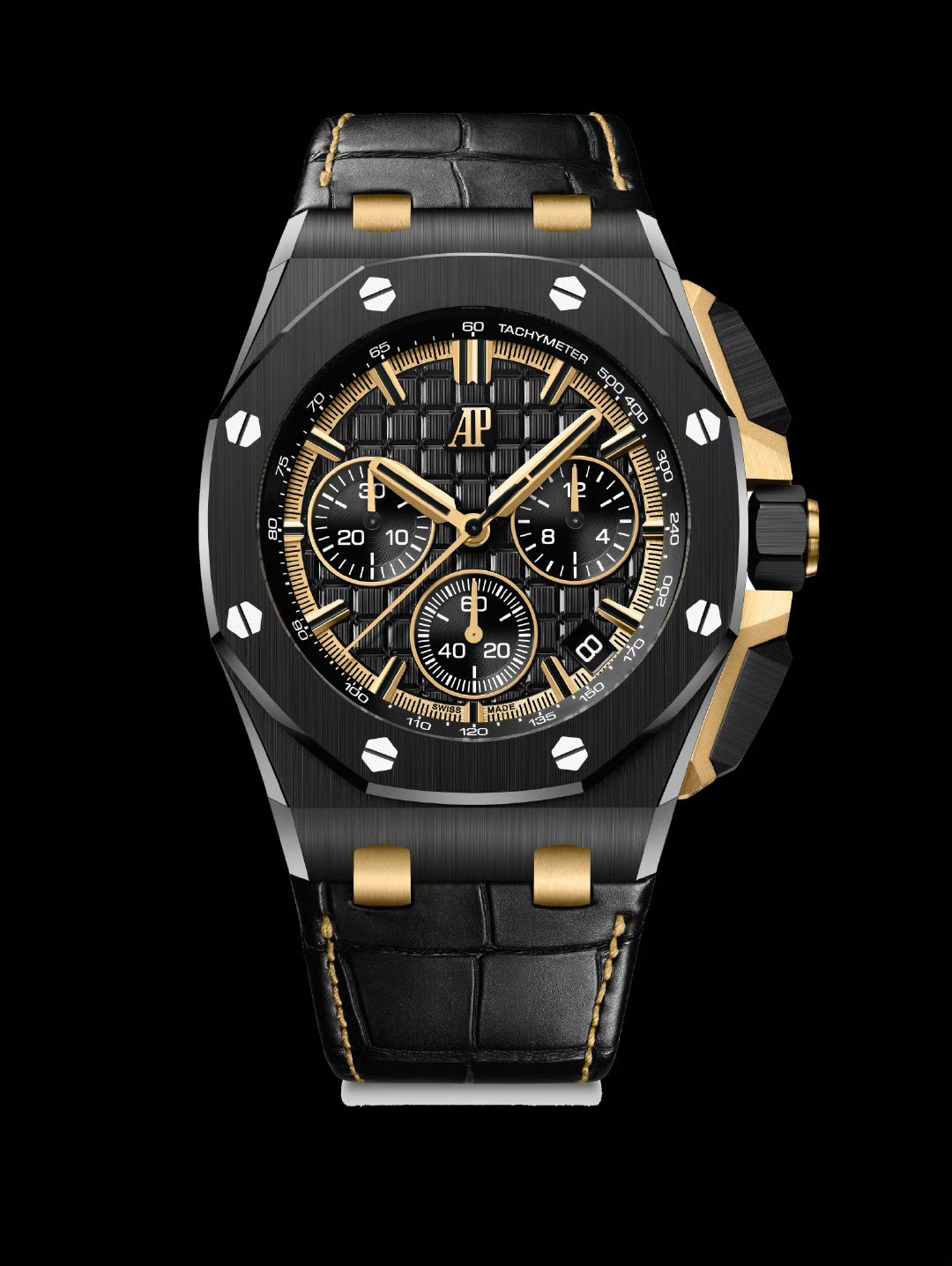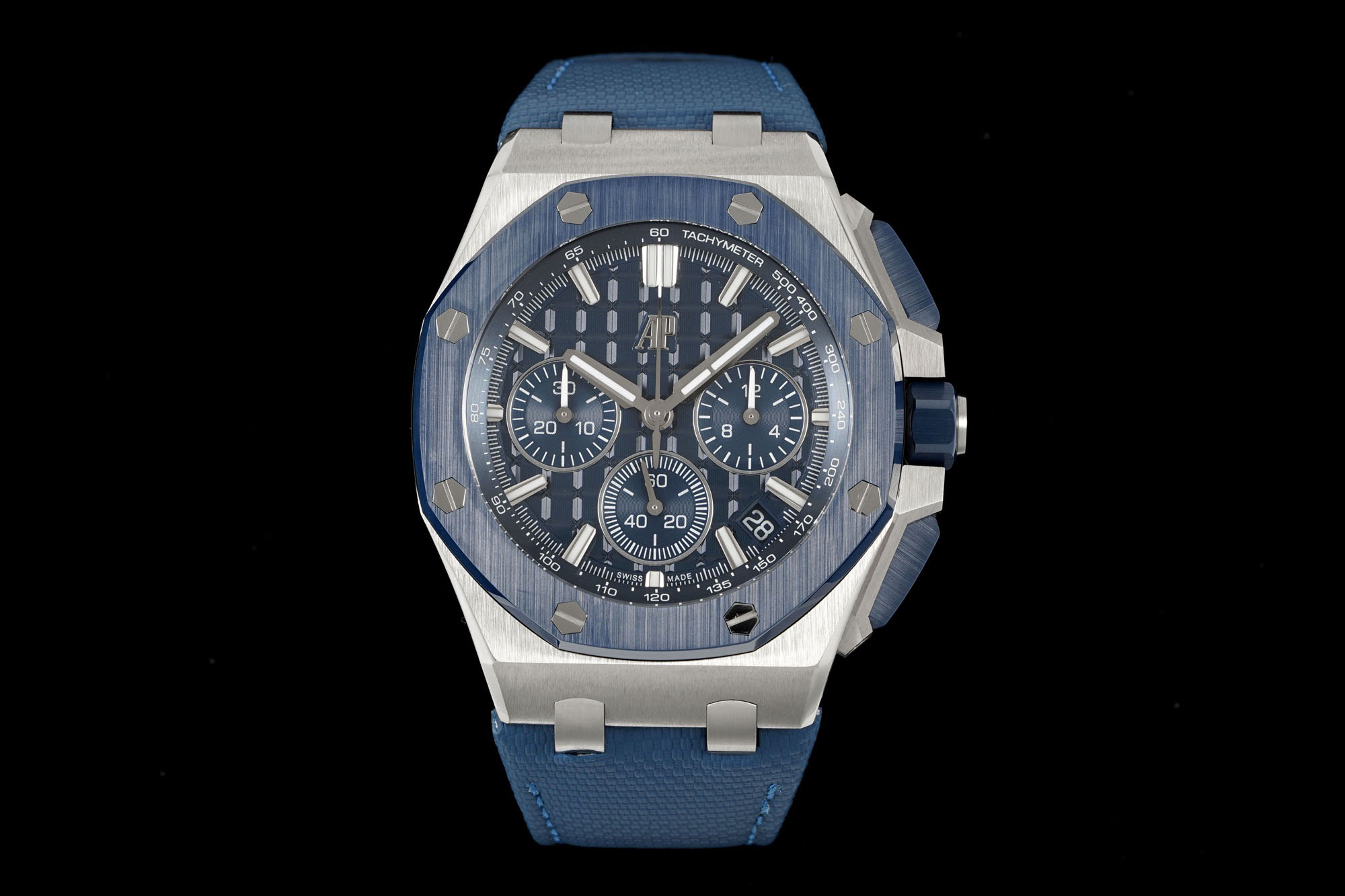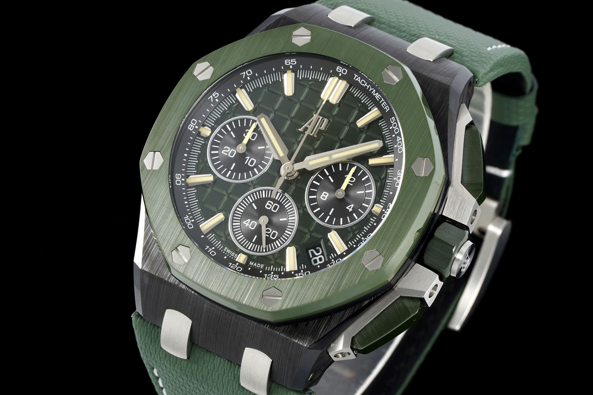 In addition to the titanium version, the Royal Oak Offshore Chronograph 43mm features a black ceramic bezel that creates a sharp contrast in material and color. The crown and buttons are also made of ceramic material. We have purchased genuine second-hand watches and made super copies of the original molds. The craftsmanship is exquisite and the polishing is fine, making it one of the finest pieces in the world ❕❕❕