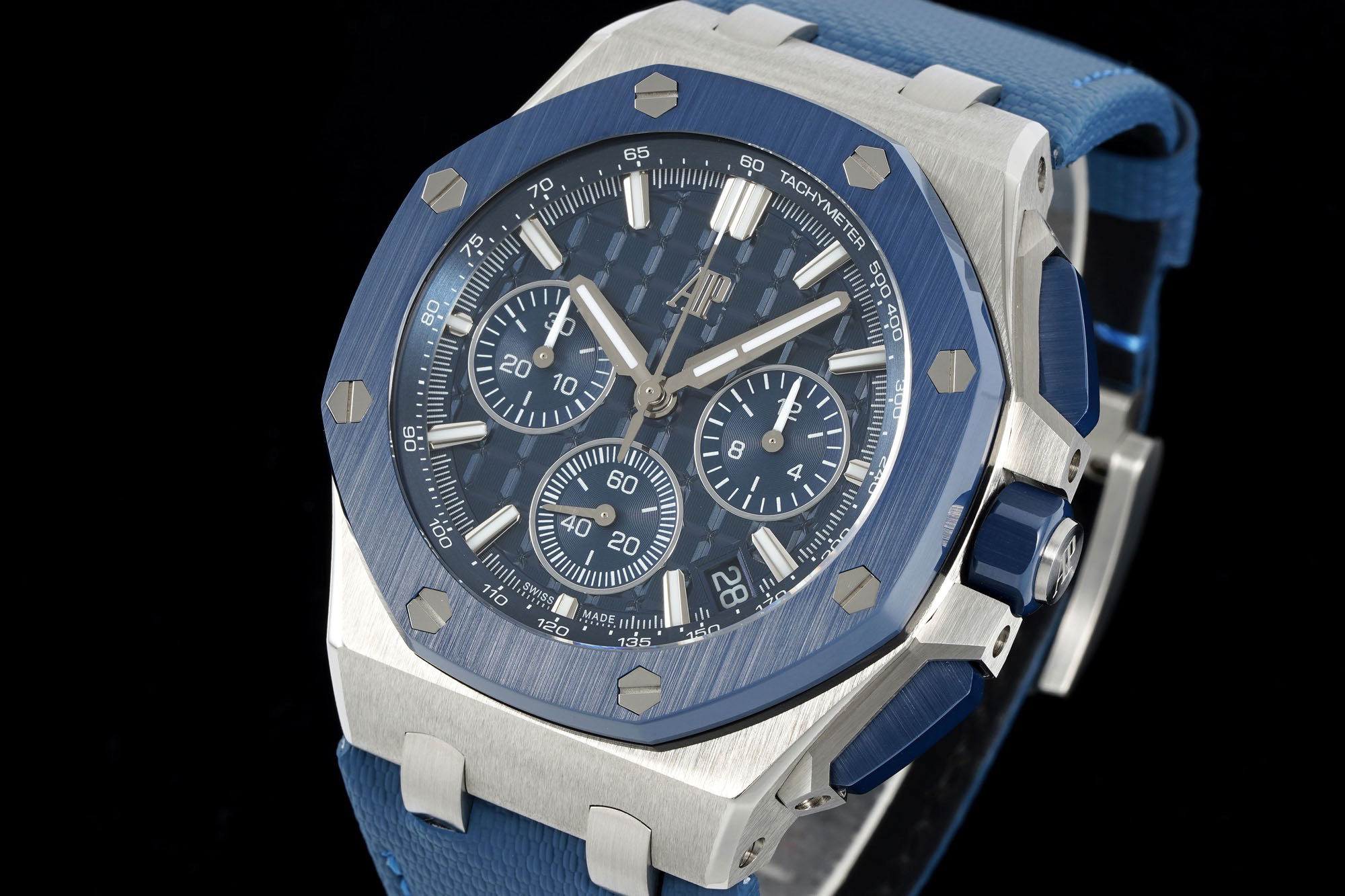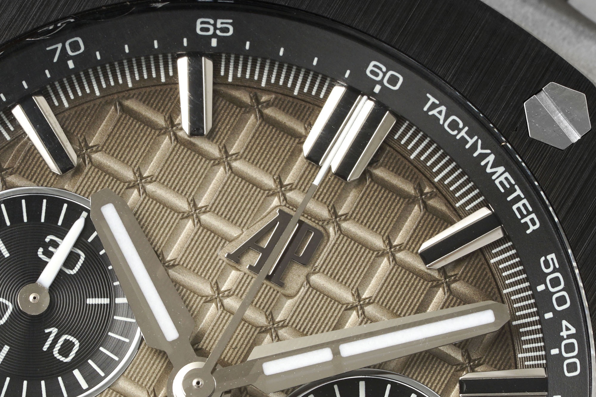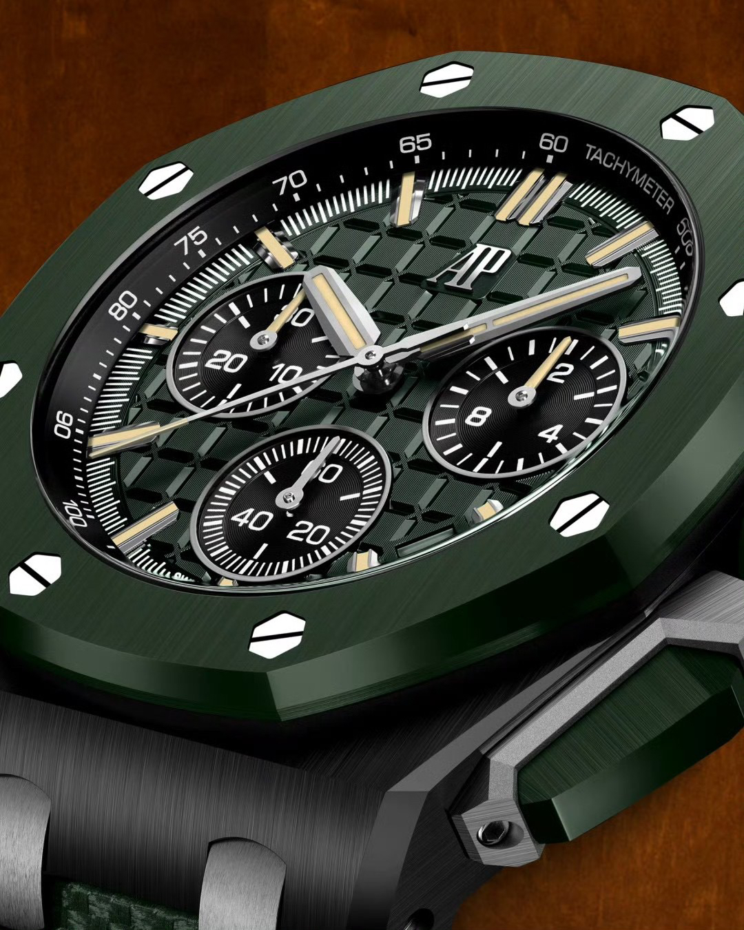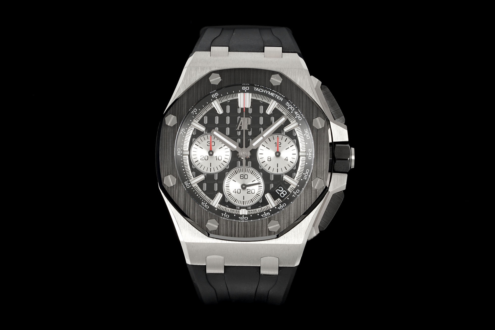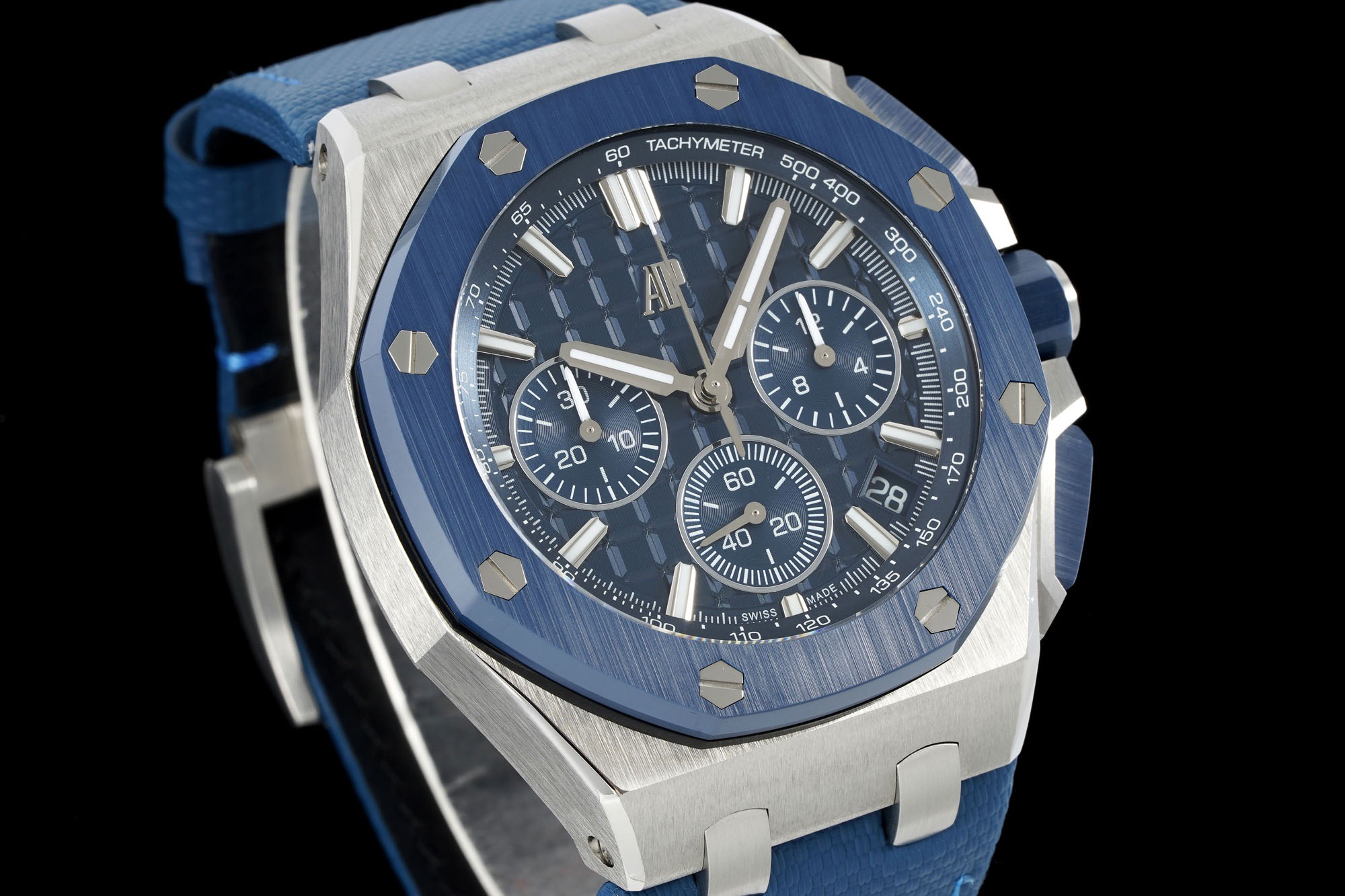 In addition to the titanium version, the Royal Oak Offshore Chronograph 43mm features a black ceramic bezel that creates a sharp contrast in material and color. The crown and buttons are also made of ceramic material. We have purchased genuine second-hand watches and made super copies of the original molds. The craftsmanship is exquisite and the polishing is fine, making it one of the finest pieces in the world ❕❕❕