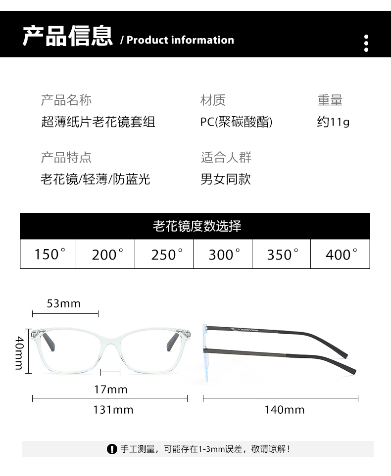 马踏飞燕极薄纸片老花镜,多种度数可选,买一副再赠送同款一副 (到手2副),再赠送本蒸汽热敷眼罩1盒,眼镜设计超轻超薄,防蓝光,防紫外线,充分保护中老年的眼睛健康M