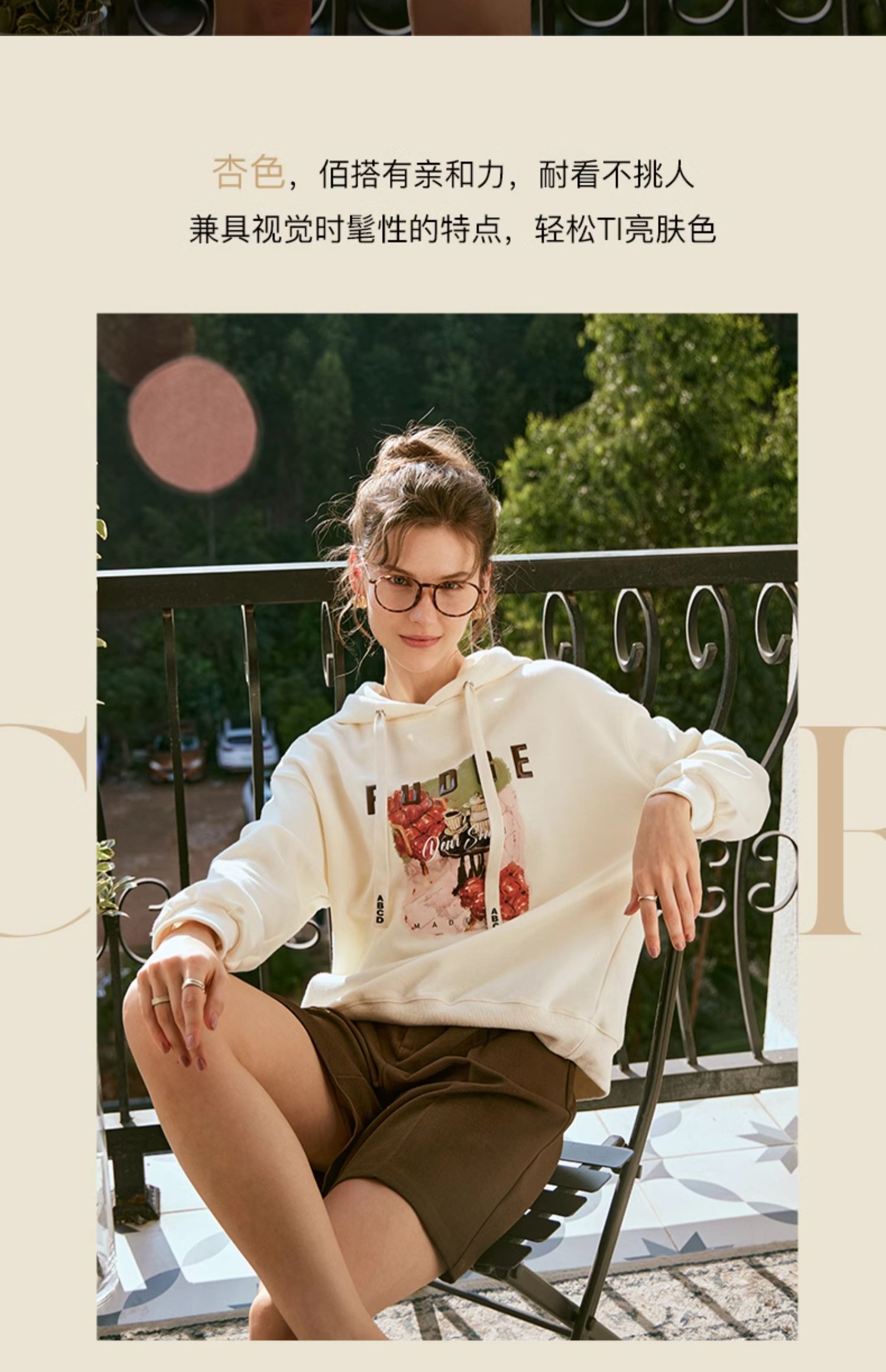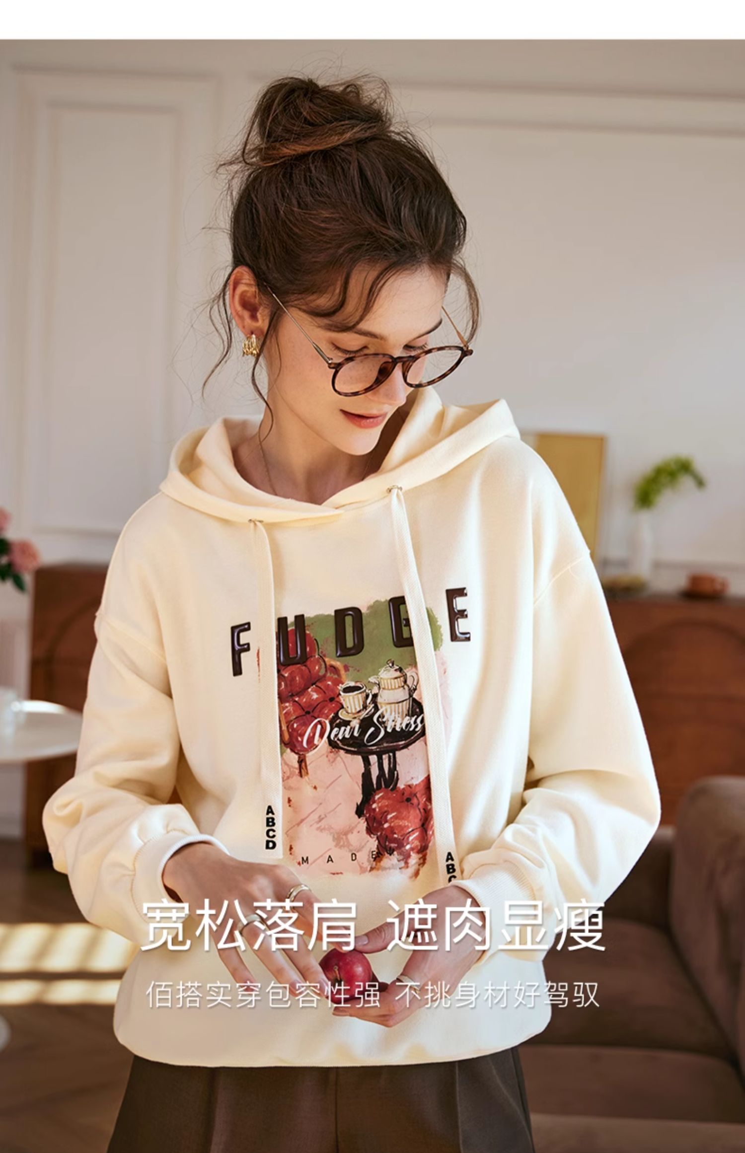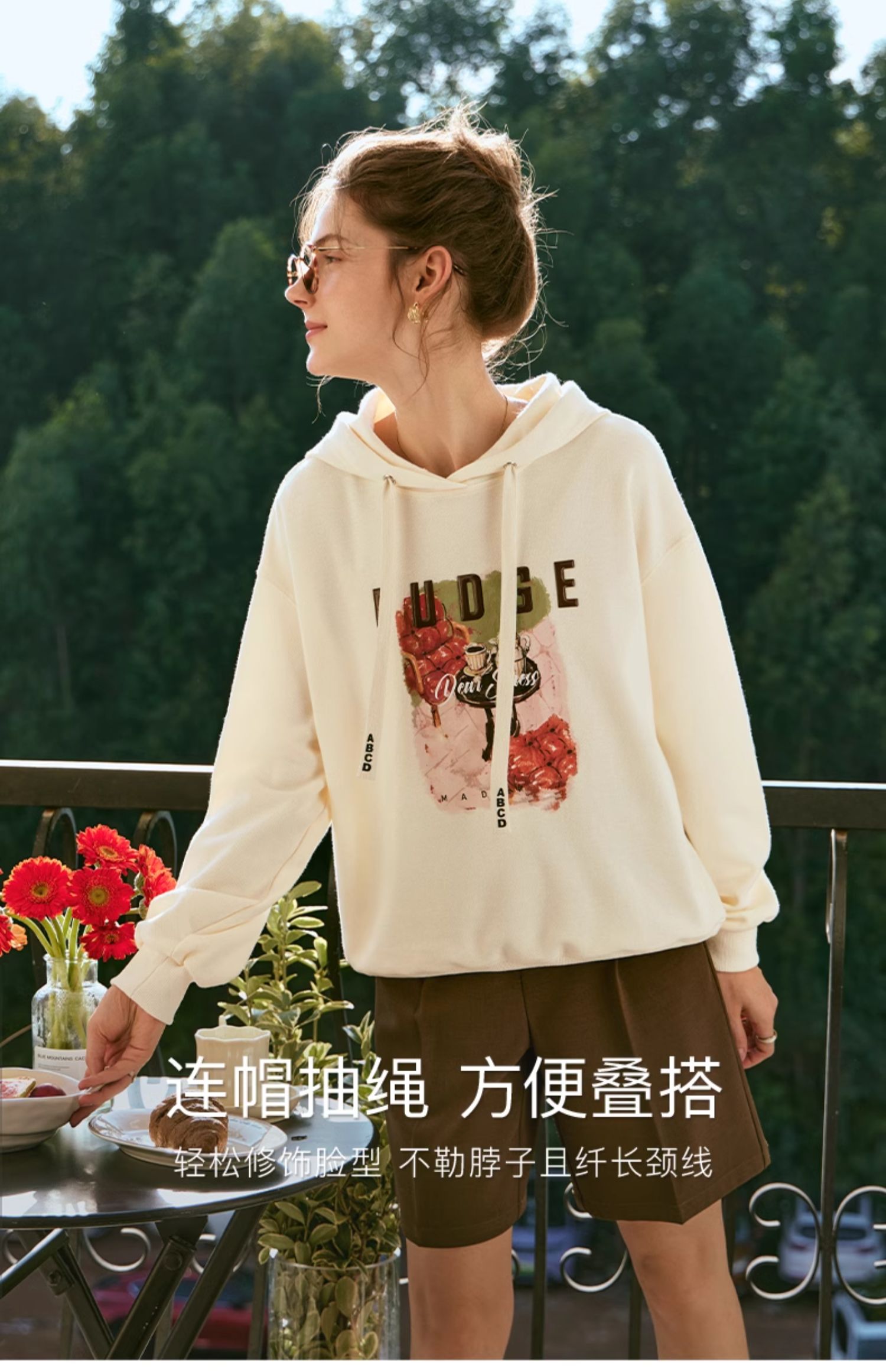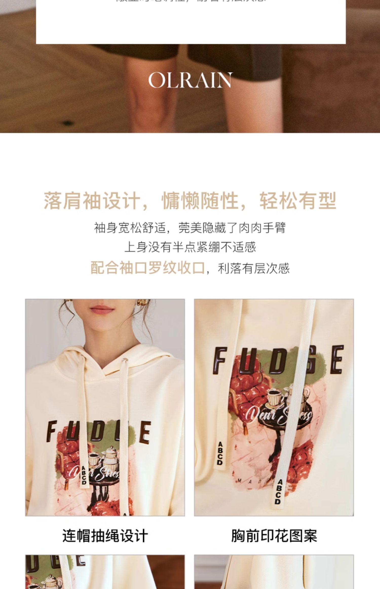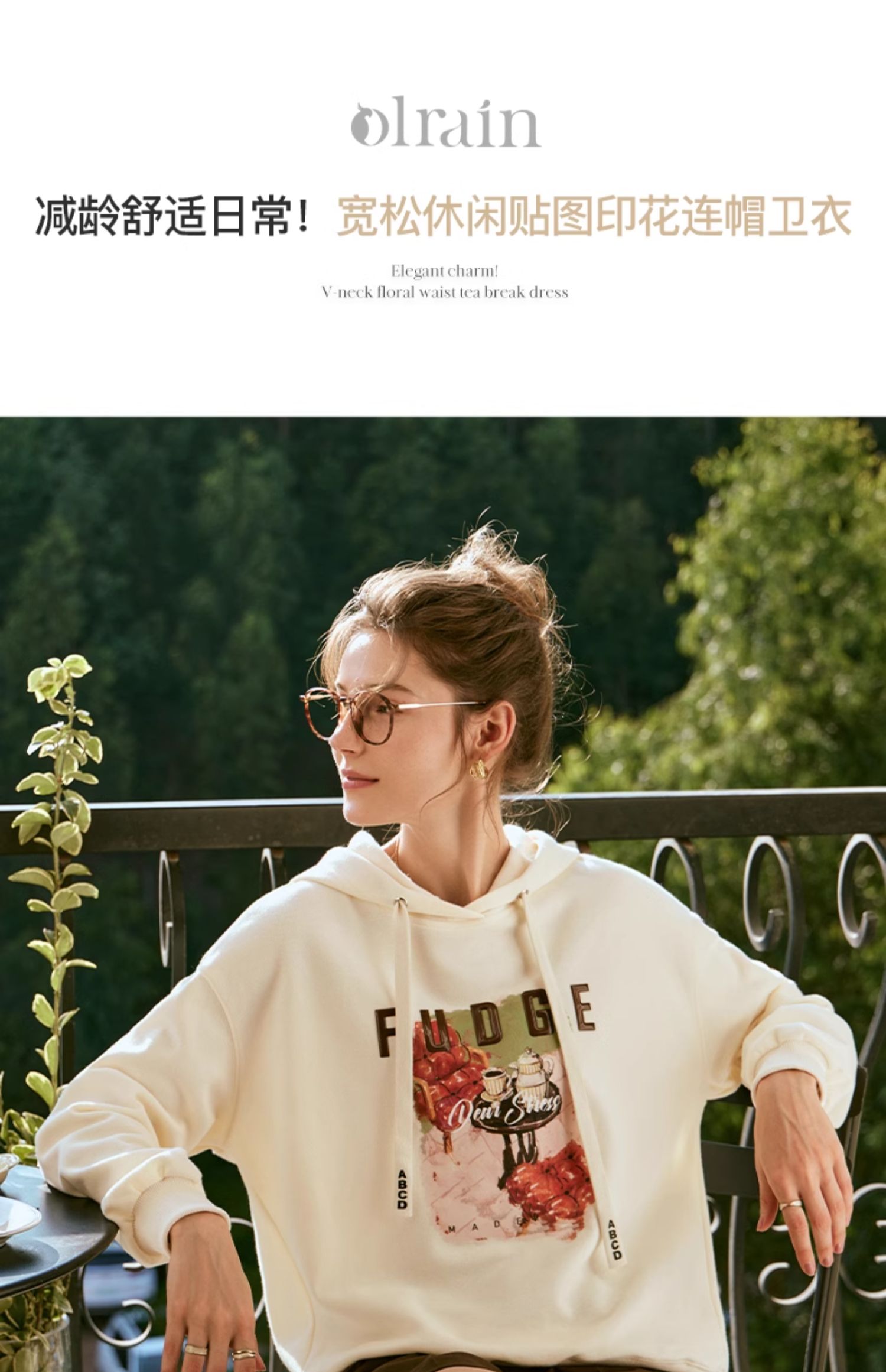 OLrain欧芮儿杏色连帽卫衣女早春2024新款宽松休闲贴图印花长袖