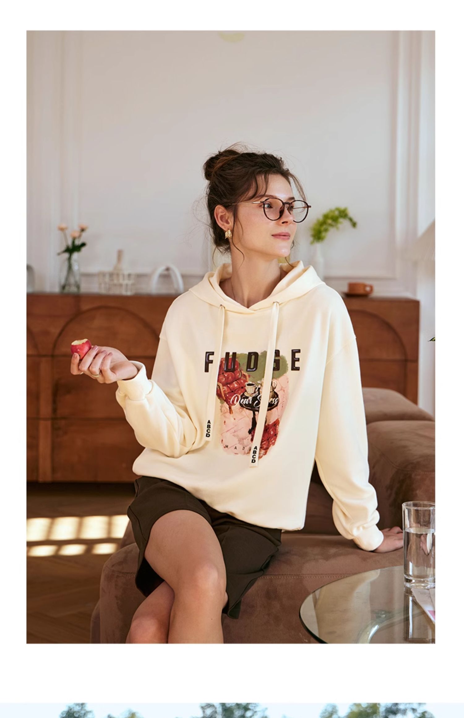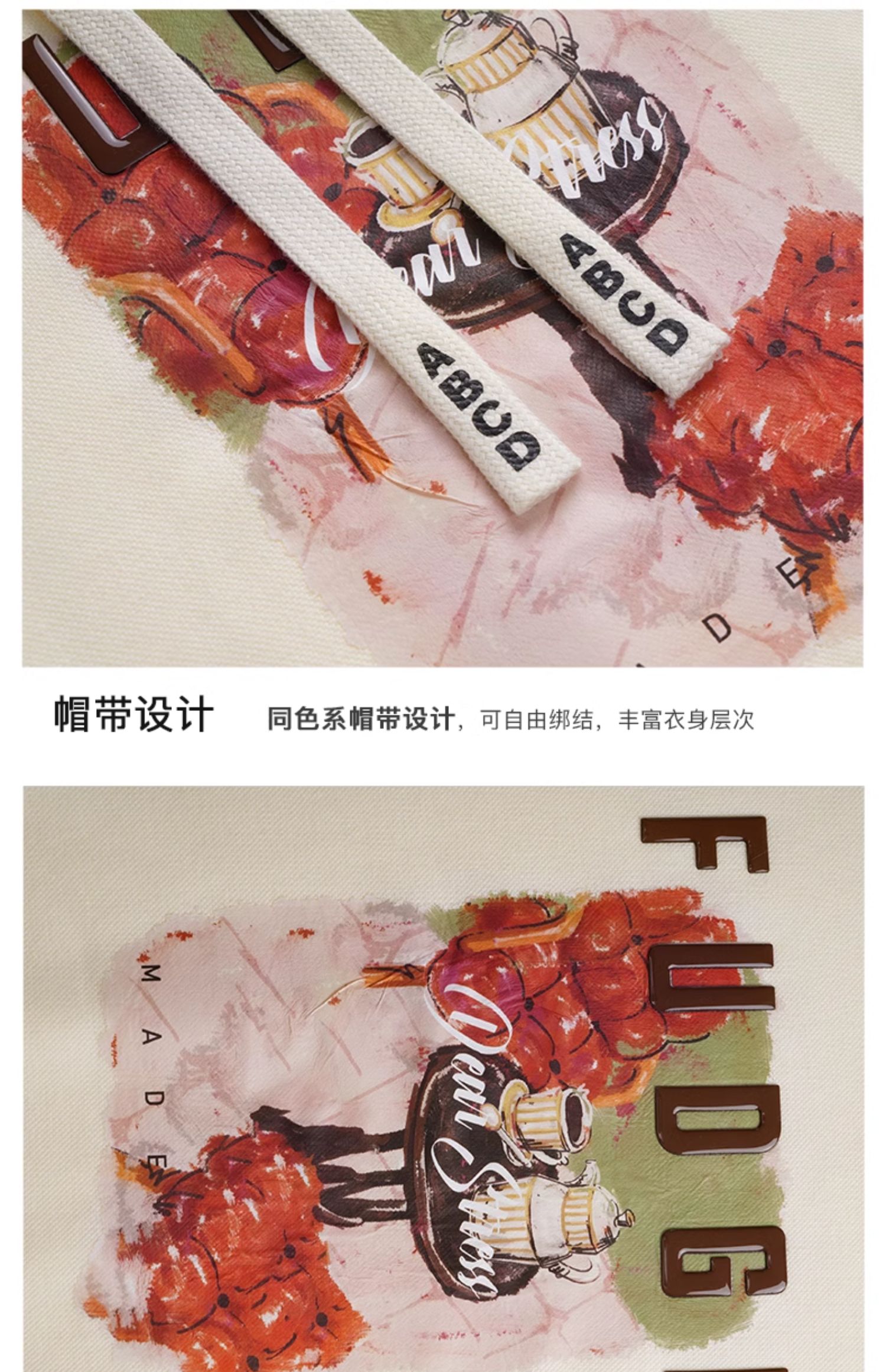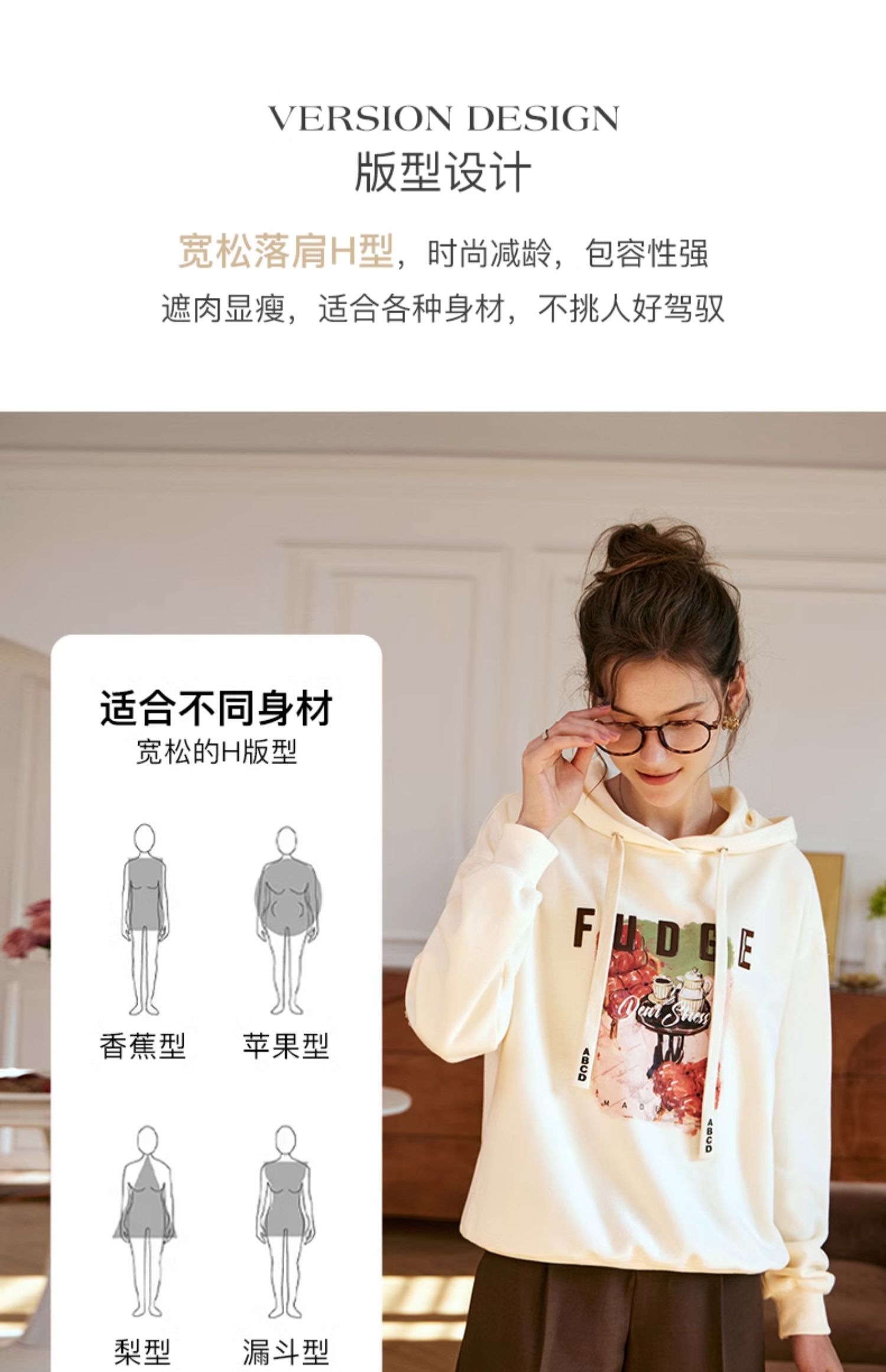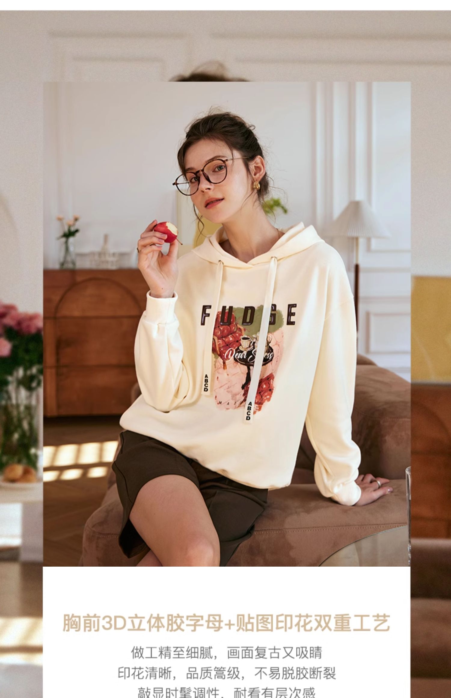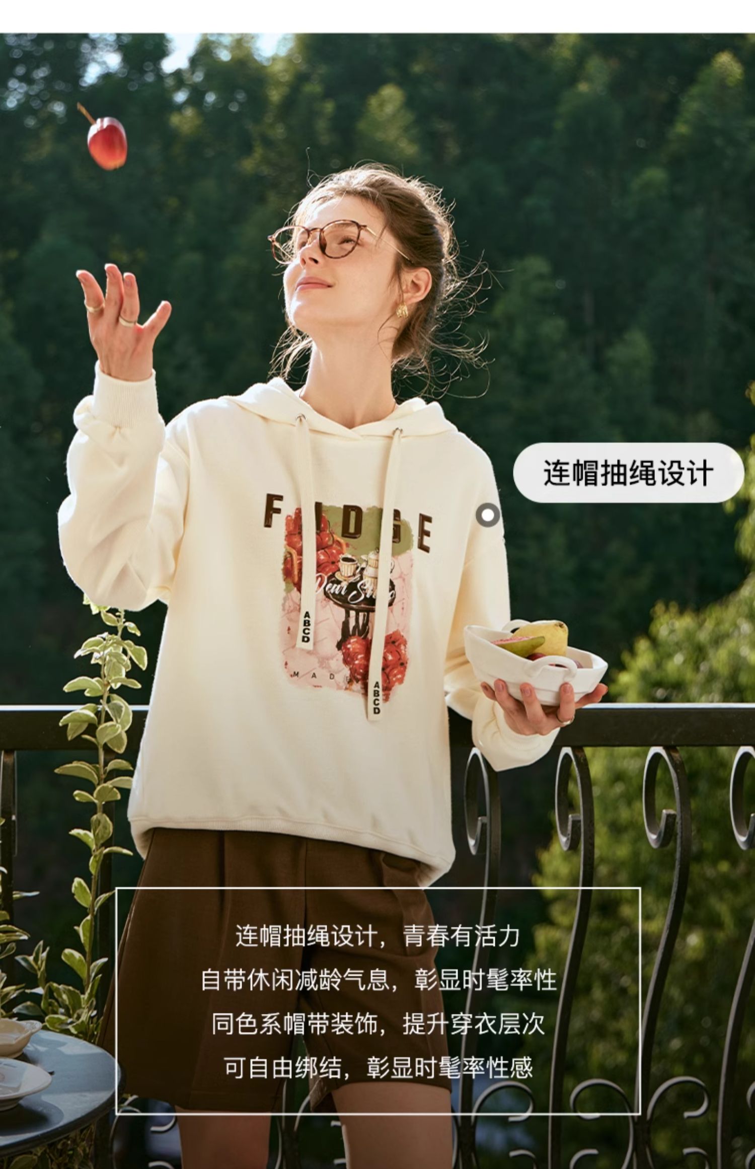 OLrain欧芮儿杏色连帽卫衣女早春2024新款宽松休闲贴图印花长袖