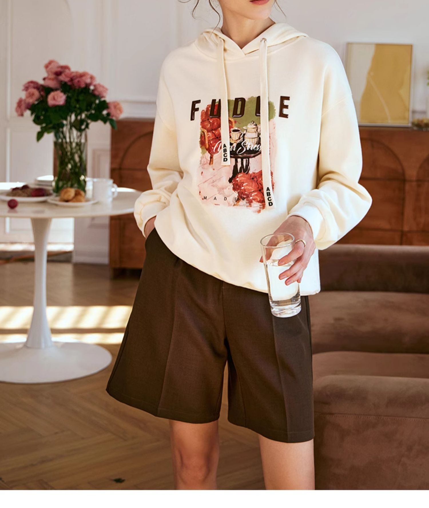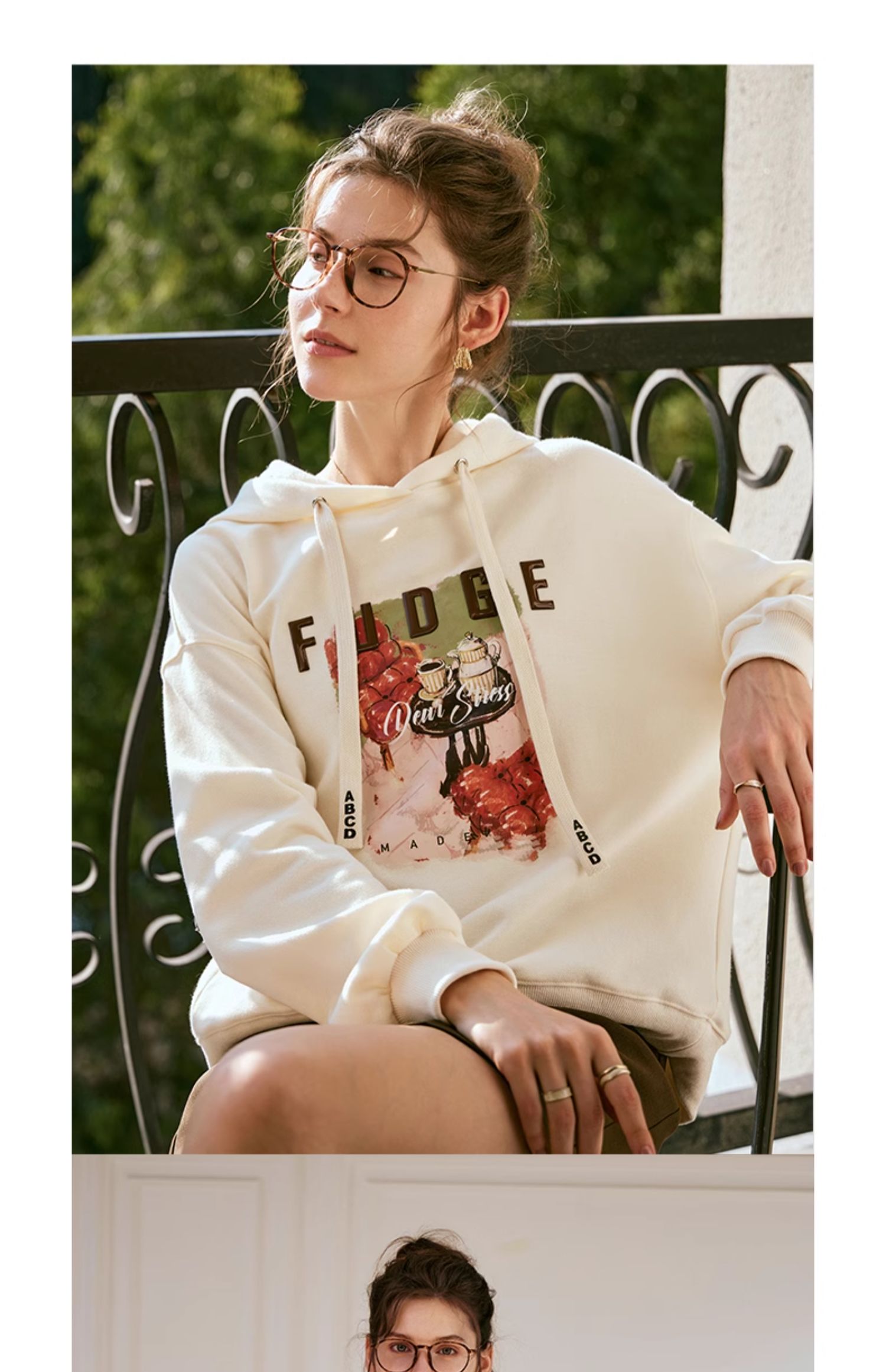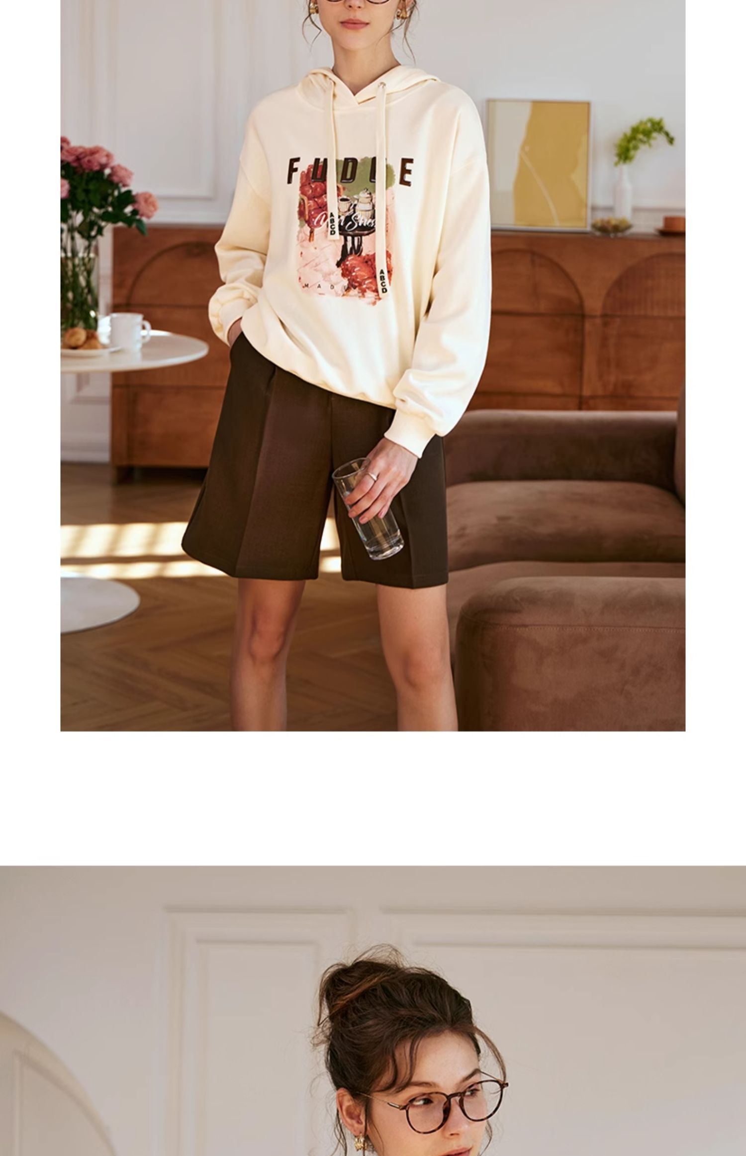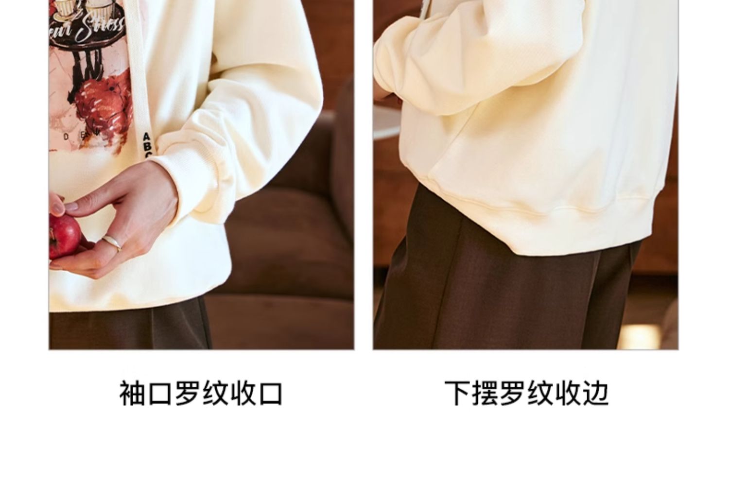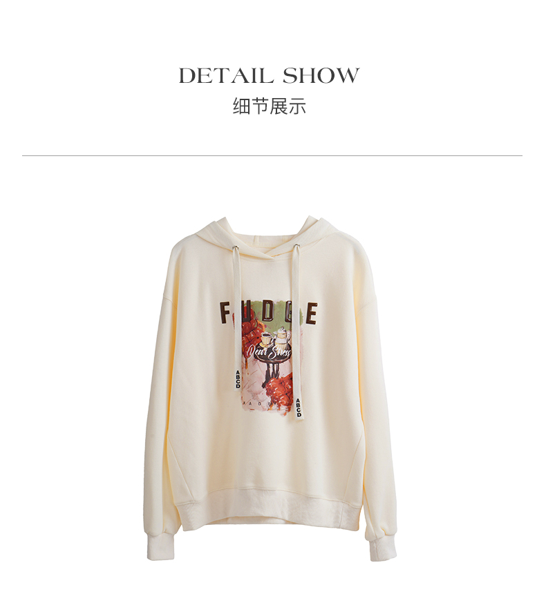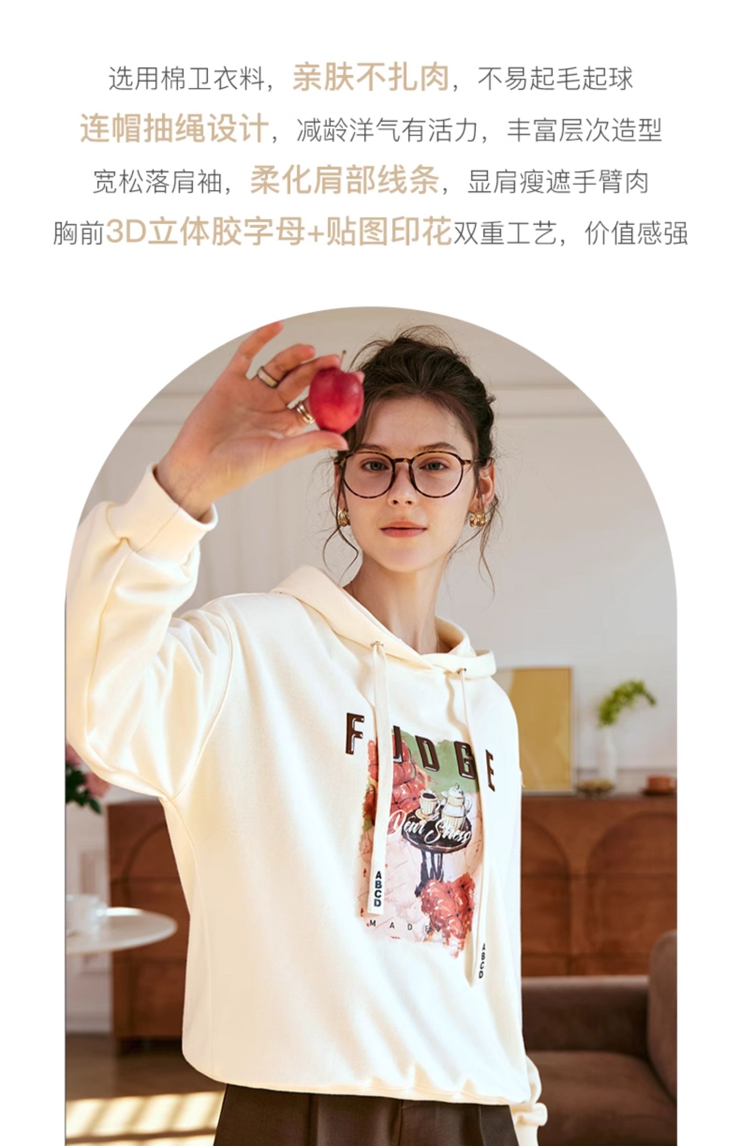 OLrain欧芮儿杏色连帽卫衣女早春2024新款宽松休闲贴图印花长袖