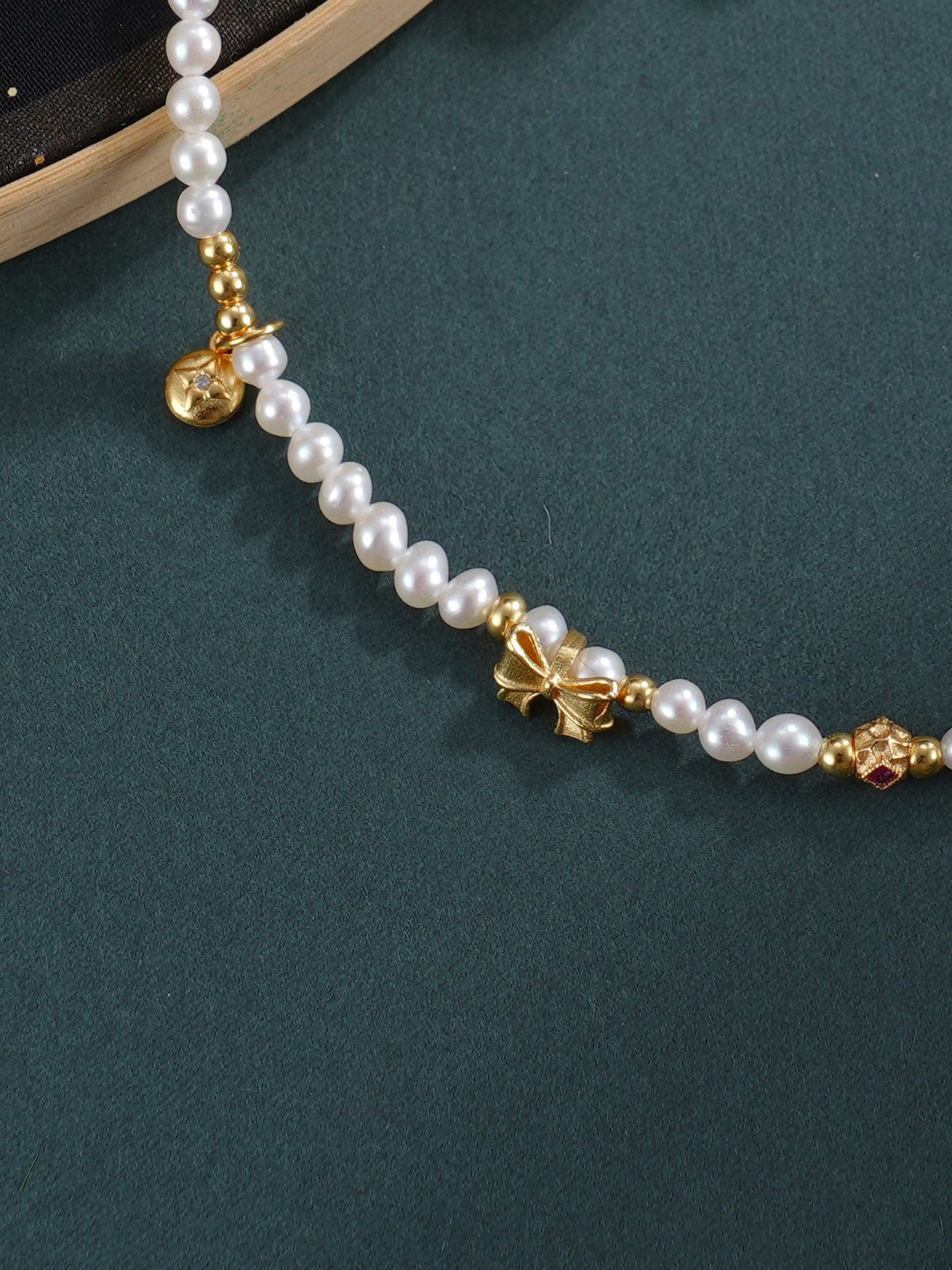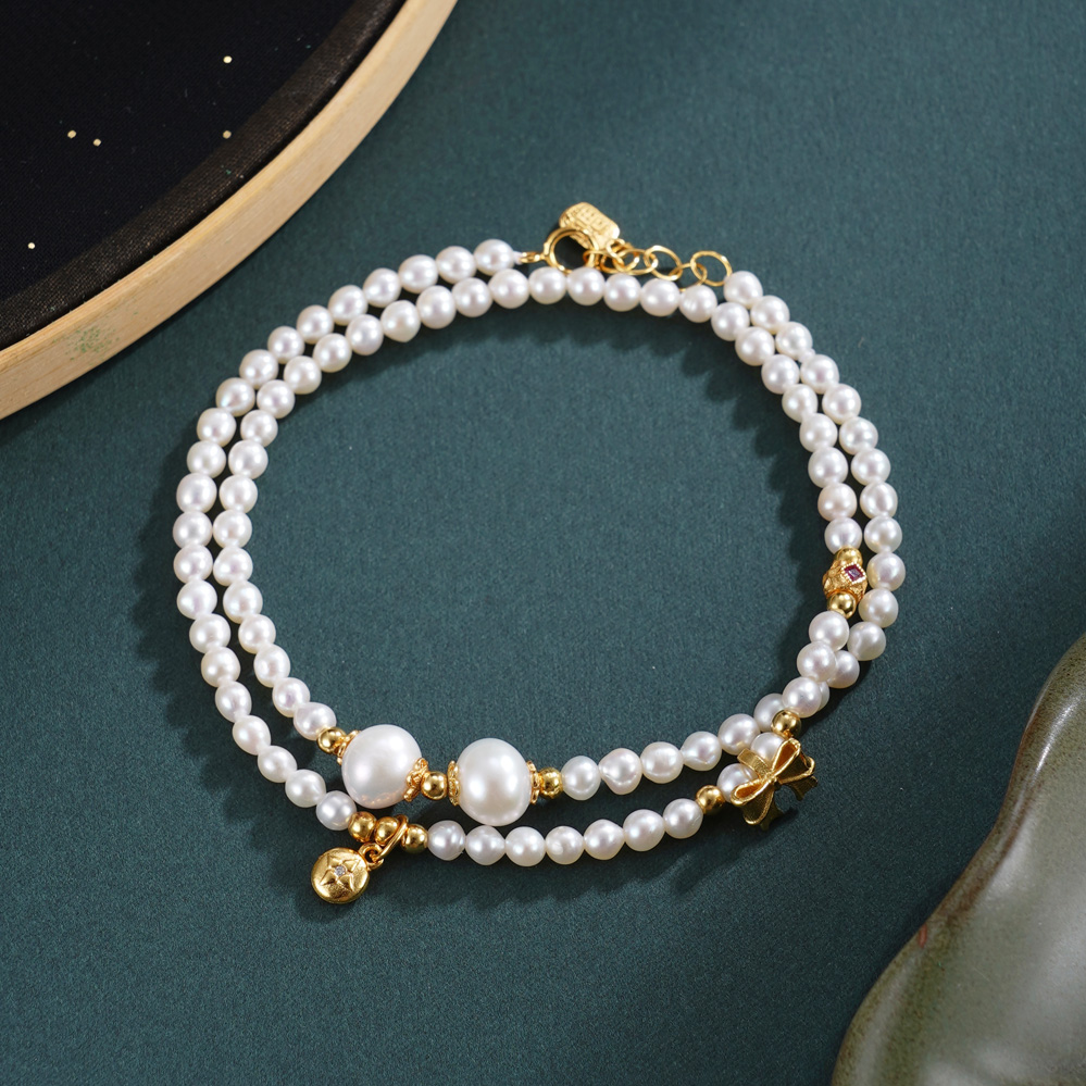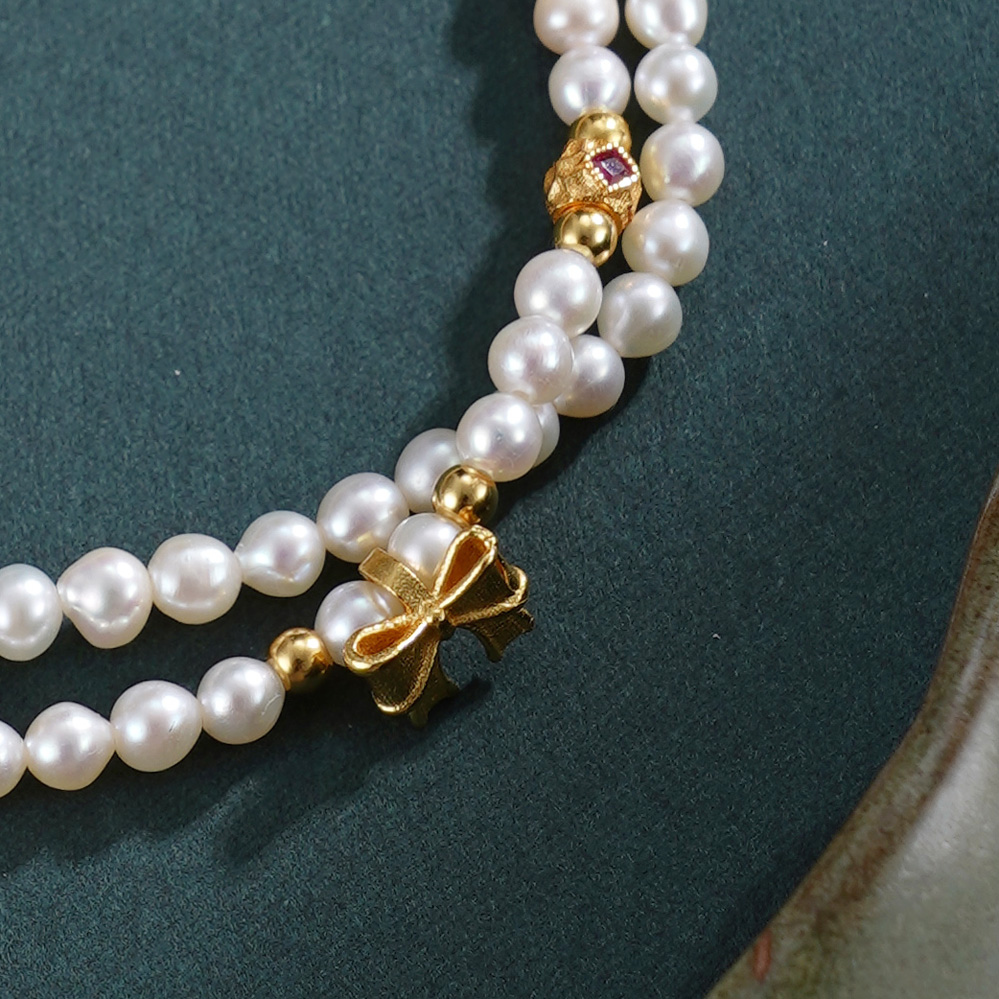 子佩集【依恋情结】银S925珍珠惜王妃手链【QNS0020】3mm珠镀金蝴蝶结2601