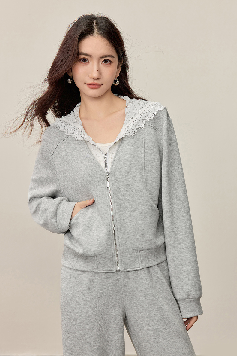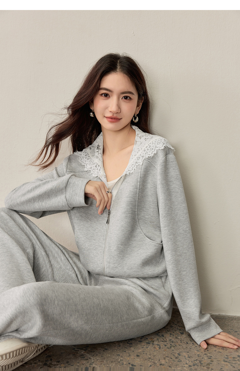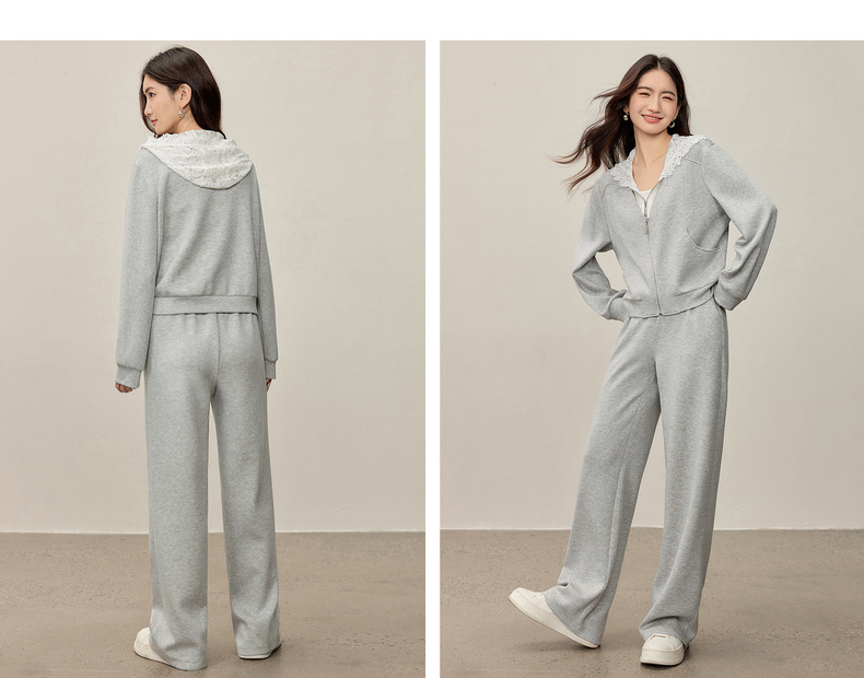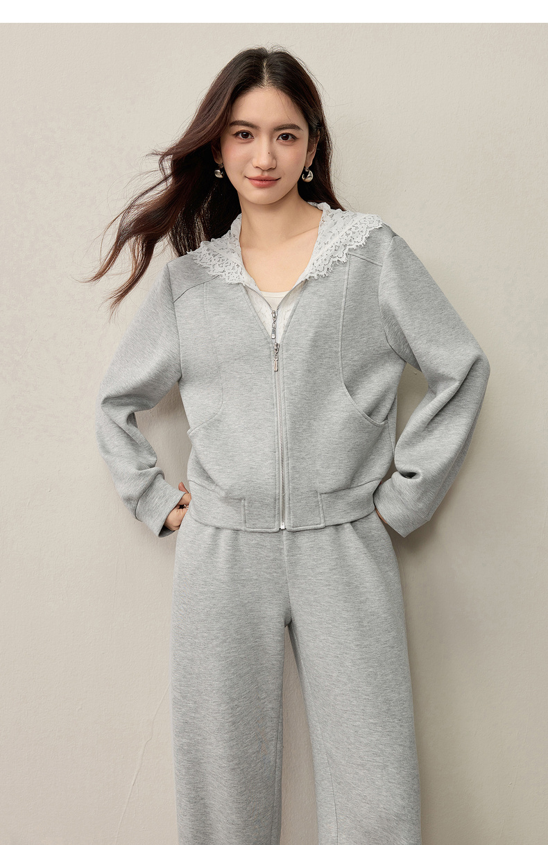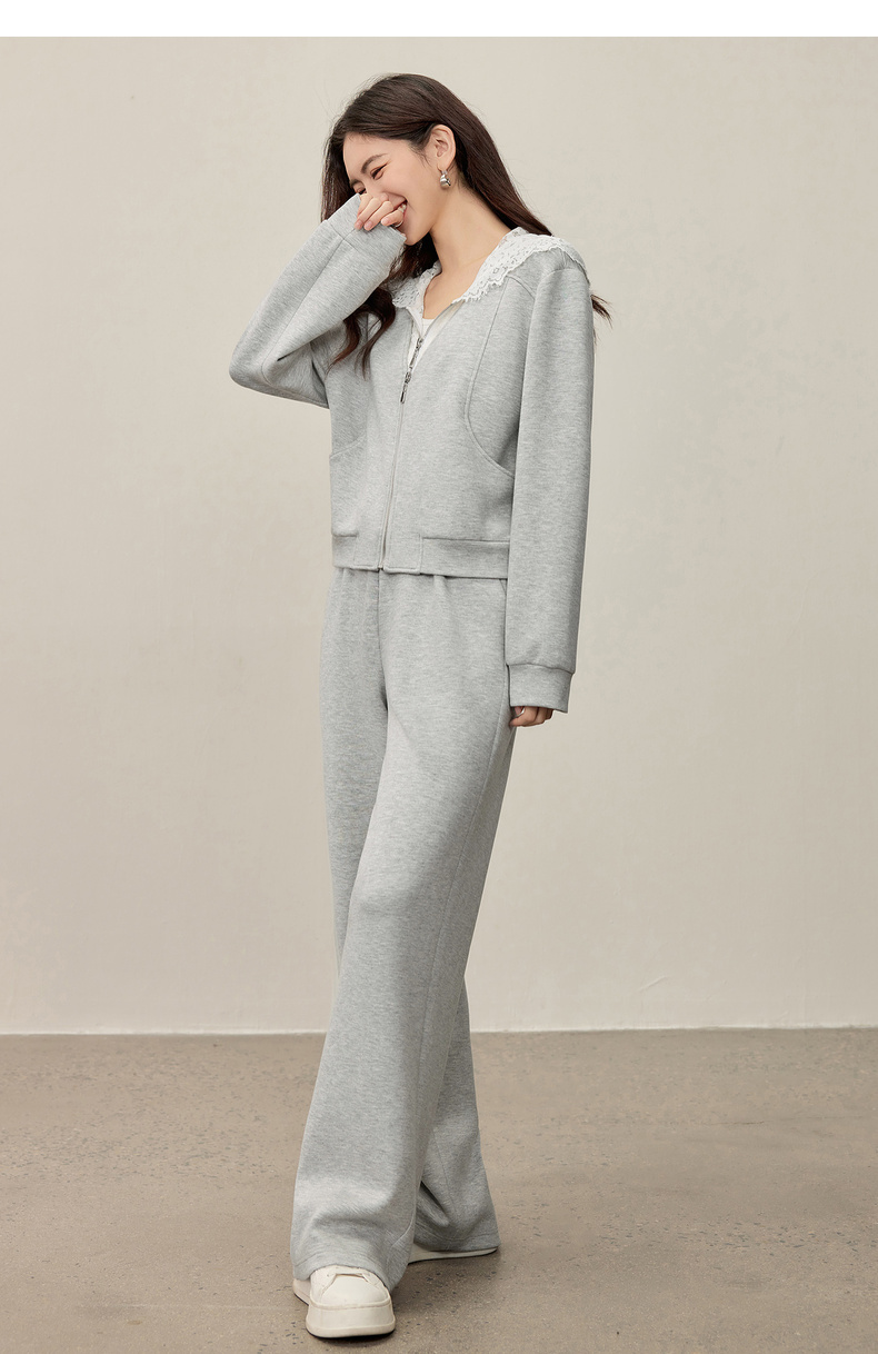【内购】【免搭配套装】蕾丝连帽双门襟拉链卫衣外套&松紧腰直筒长裤-153ZH2491