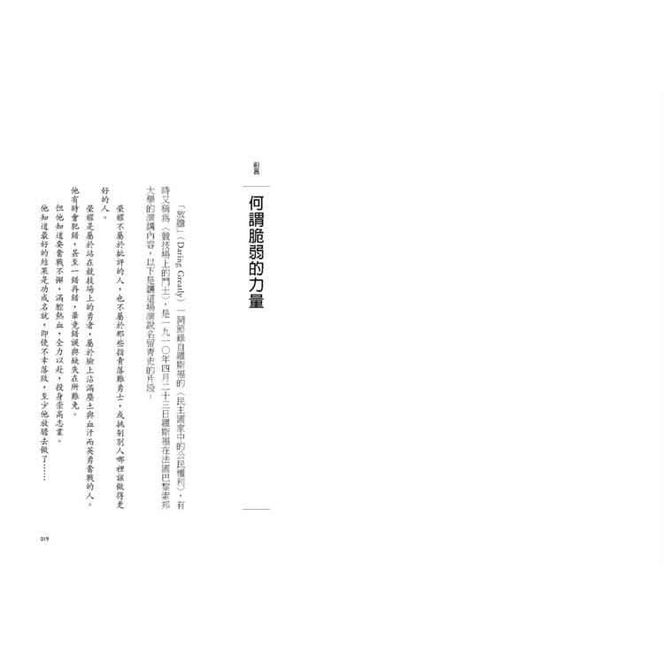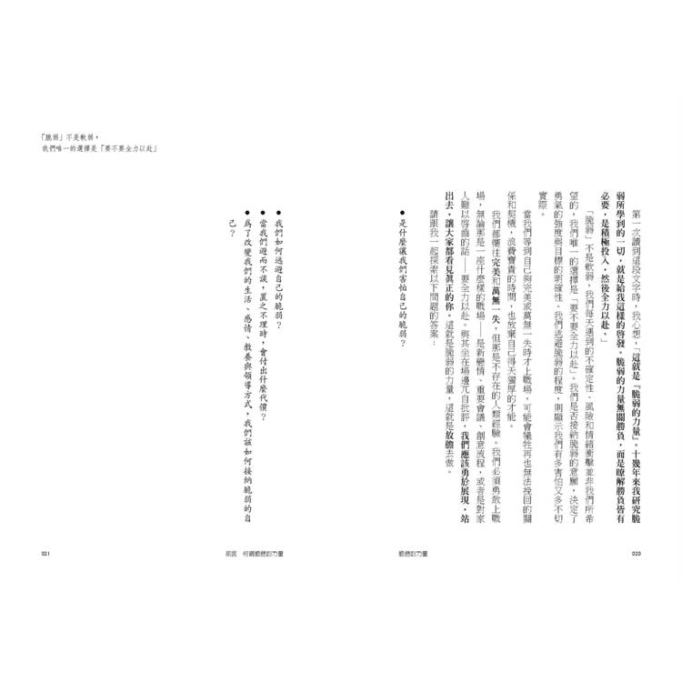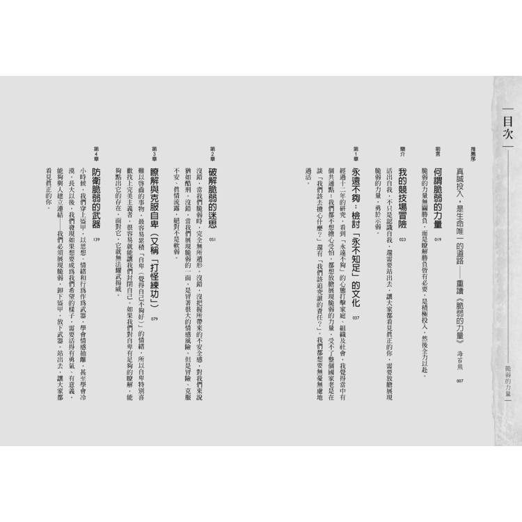 「脆弱」不是軟弱,不是輸的感覺,更不是毫無保留──沒有走過脆弱,不可能獲得真正的勇敢。當我們願意在生命每個當下直視脆弱,同時也撬開了自信、喜樂、創造力與一切可能性。
