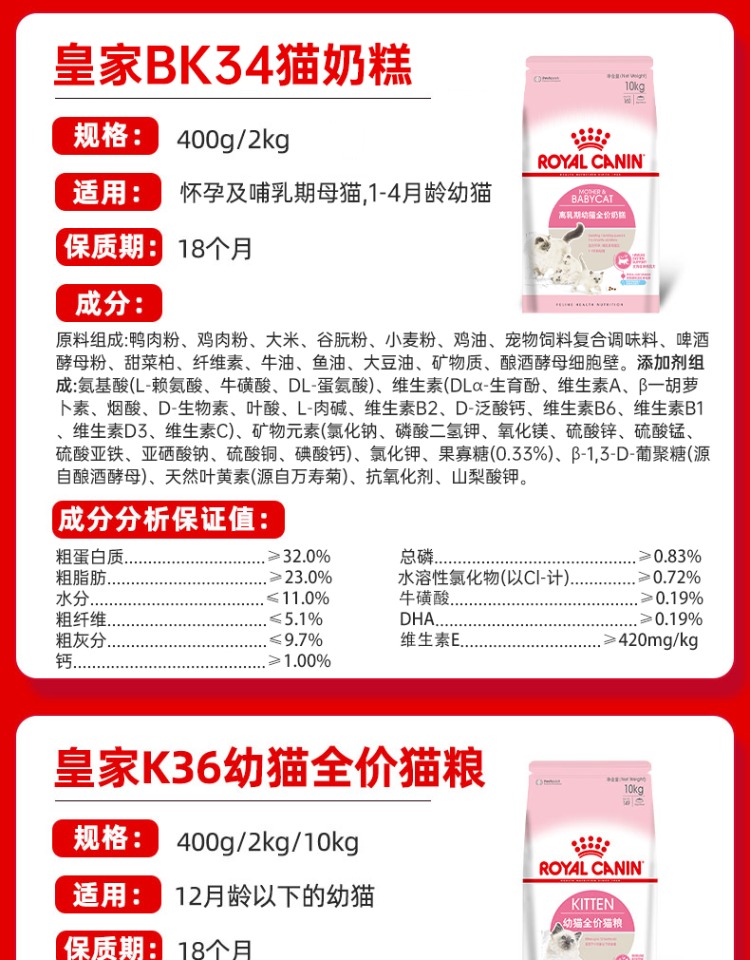 皇家猫粮K36/BK34幼猫奶糕专用小猫母孕猫离乳全价粮