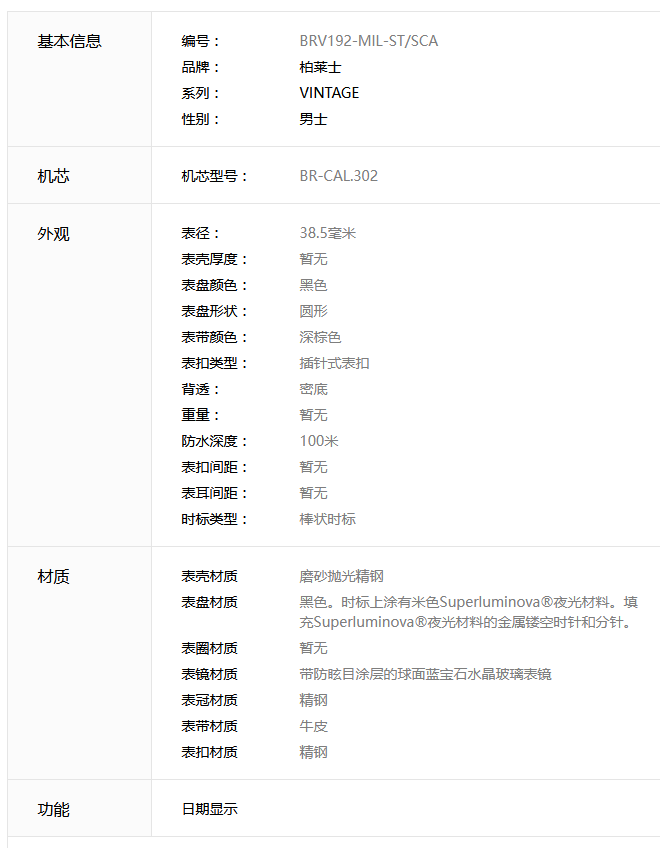 Bell & Ross 柏莱士 VINTAGE 系列 BRV192-MIL-ST/SCA 腕表