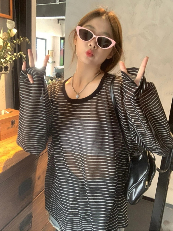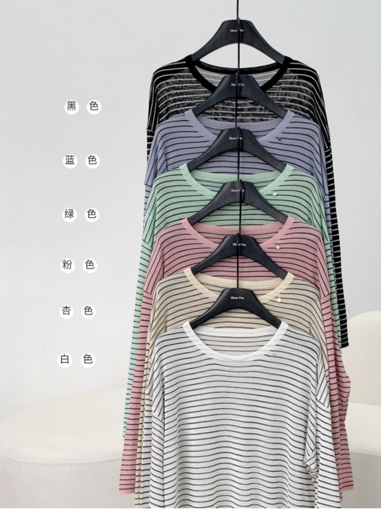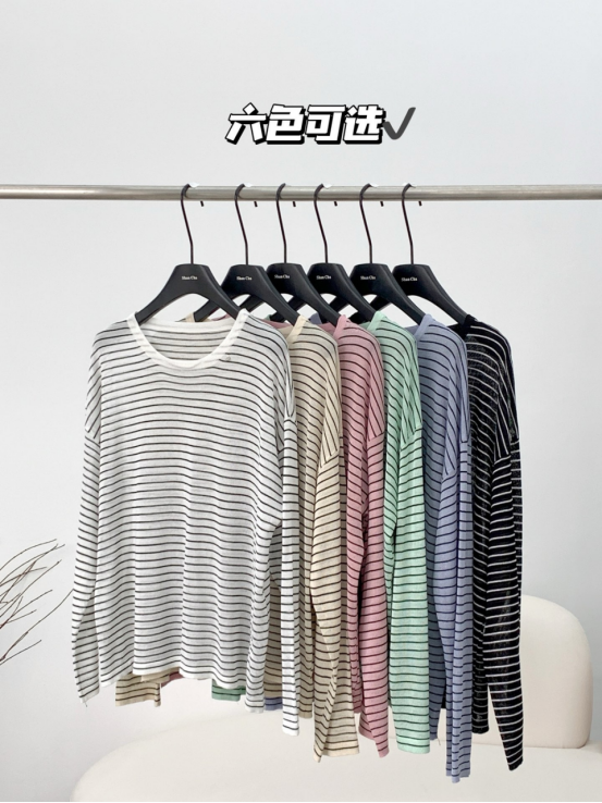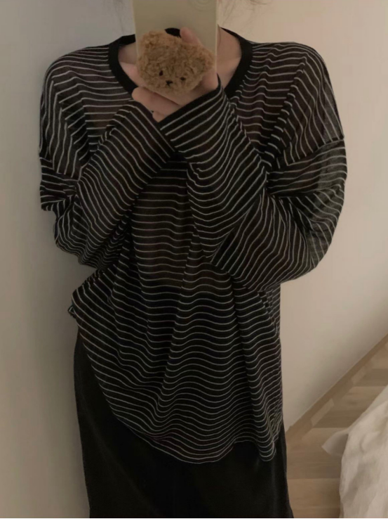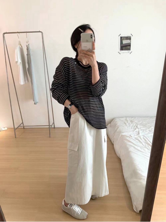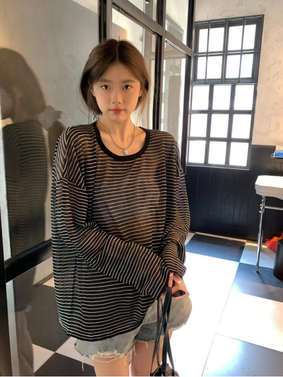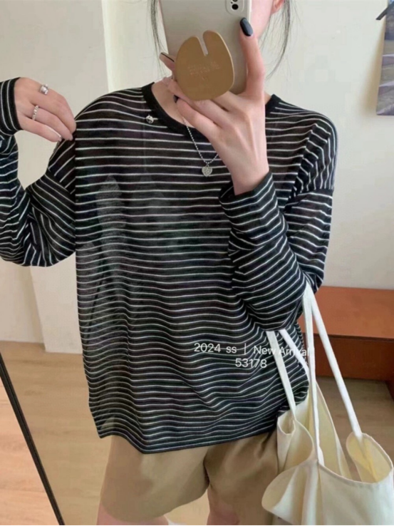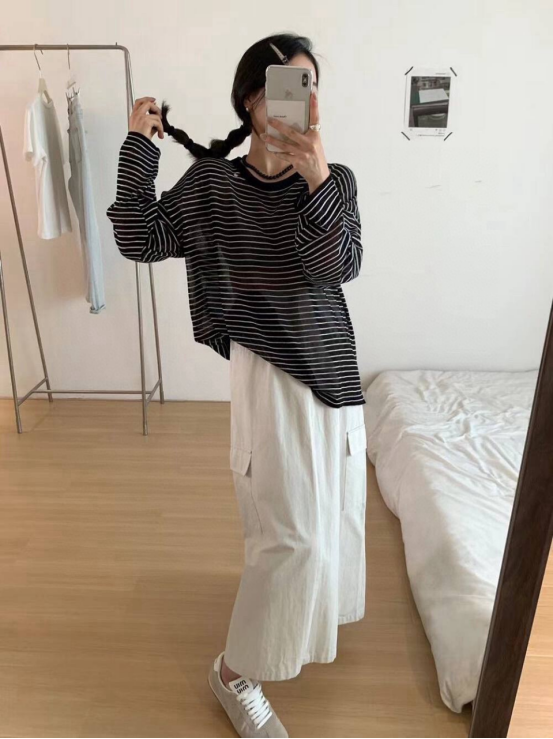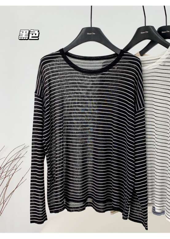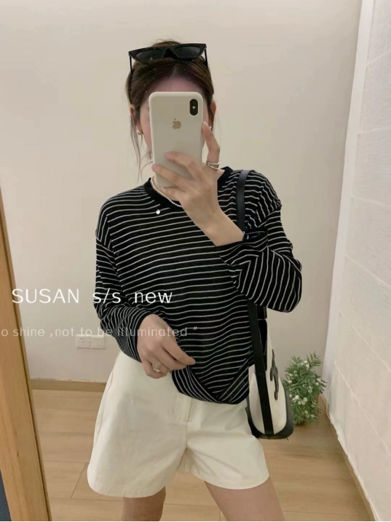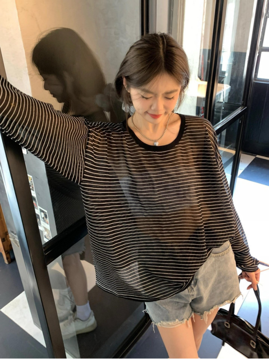 hin慵懒范的条纹长袖T 啥拜拜肉小肚子都看不到巨巨巨显瘦 随意搭个短裤or休闲裤 慵懒范立马就有了 hhhh~ 实穿好穿让人一眼记住的防晒条纹T! 经典条纹元素永不过时! 比起纯色更具有时髦的造型感 从职场通勤到运动休闲都能 HOLD住! 夏季实穿top防晒条纹 Tee 松弛慵懒感根本穿不腻~ 宽松版型!对身材没有限制 遮肉显瘦的效果HEN好!!爱了爱了! 🖤#黑色 基础日常百搭显瘦~ 里面可以穿各种美背bra 防晒T真的是懒人挚爱 慵懒随意 上身纸片人既视感的宽松条纹T恤!