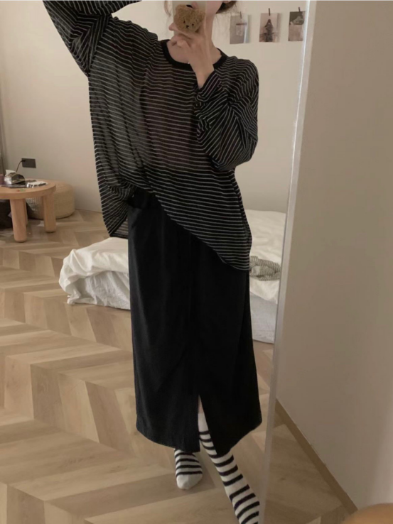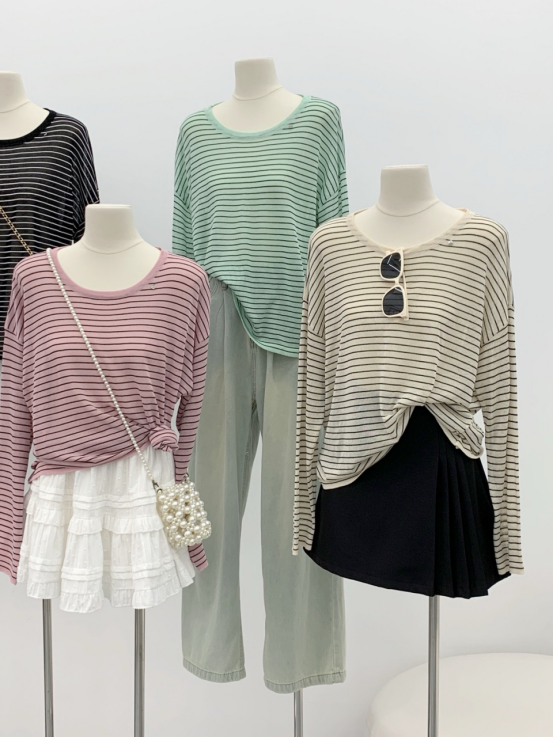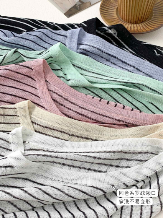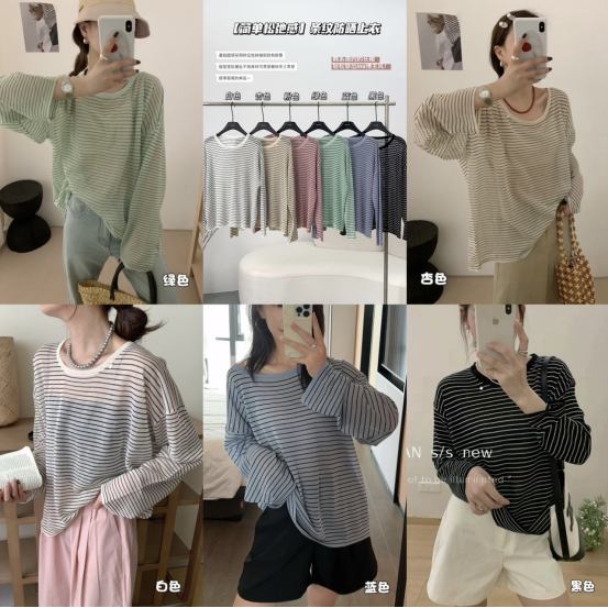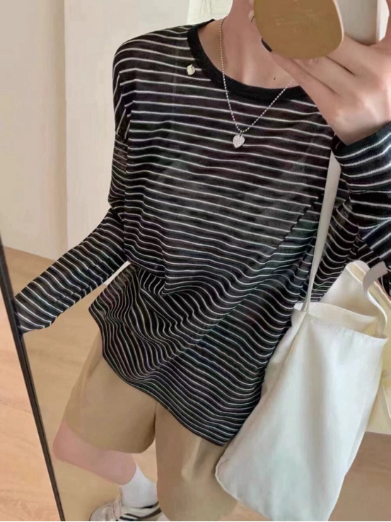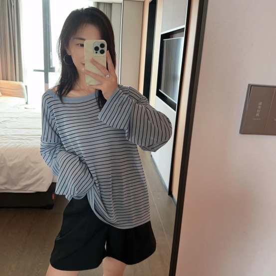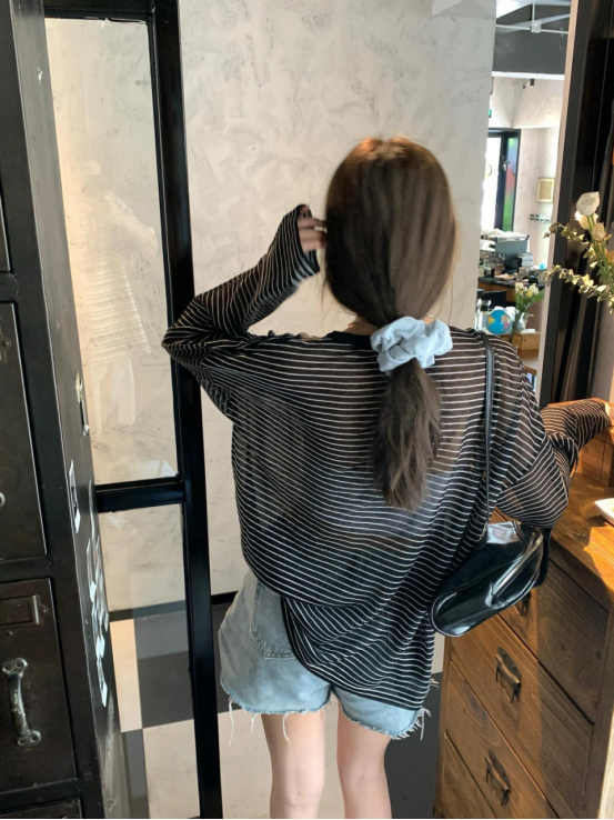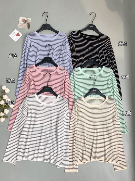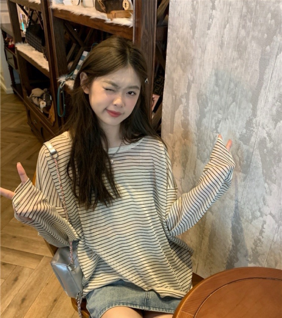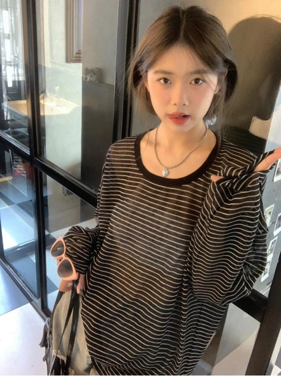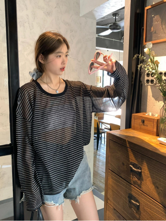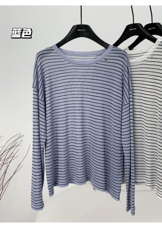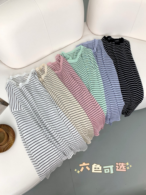 hin慵懒范的条纹长袖T 啥拜拜肉小肚子都看不到巨巨巨显瘦 随意搭个短裤or休闲裤 慵懒范立马就有了 hhhh~ 实穿好穿让人一眼记住的防晒条纹T! 经典条纹元素永不过时! 比起纯色更具有时髦的造型感 从职场通勤到运动休闲都能 HOLD住! 夏季实穿top防晒条纹 Tee 松弛慵懒感根本穿不腻~ 宽松版型!对身材没有限制 遮肉显瘦的效果HEN好!!爱了爱了! 🖤#黑色 基础日常百搭显瘦~ 里面可以穿各种美背bra 防晒T真的是懒人挚爱 慵懒随意 上身纸片人既视感的宽松条纹T恤!