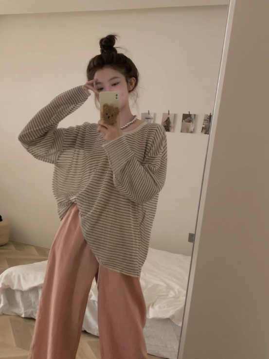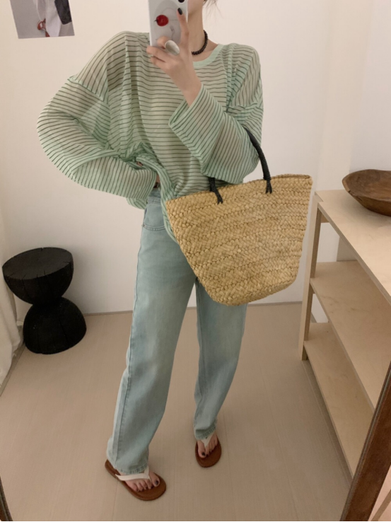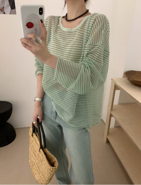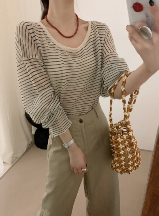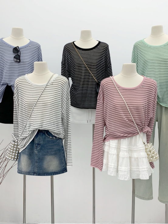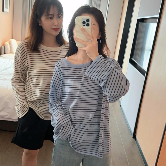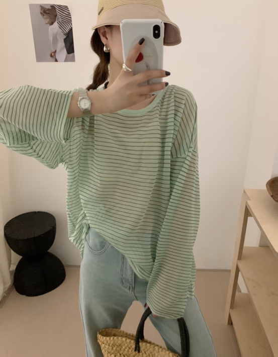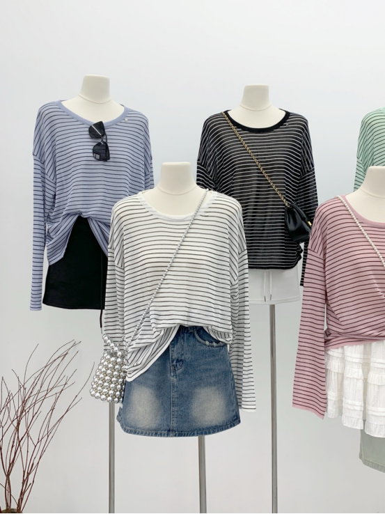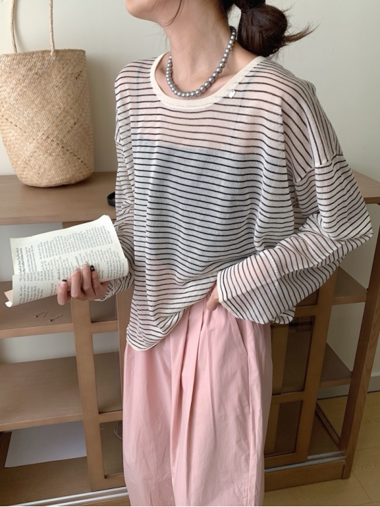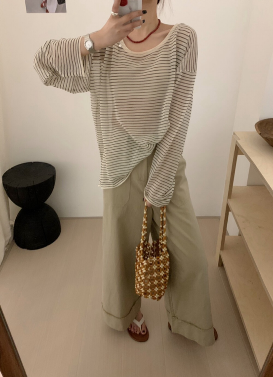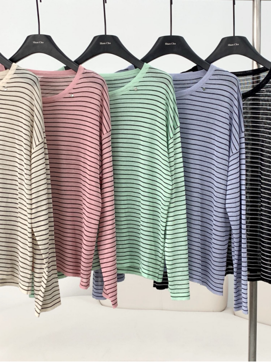 hin慵懒范的条纹长袖T 啥拜拜肉小肚子都看不到巨巨巨显瘦 随意搭个短裤or休闲裤 慵懒范立马就有了 hhhh~ 实穿好穿让人一眼记住的防晒条纹T! 经典条纹元素永不过时! 比起纯色更具有时髦的造型感 从职场通勤到运动休闲都能 HOLD住! 夏季实穿top防晒条纹 Tee 松弛慵懒感根本穿不腻~ 宽松版型!对身材没有限制 遮肉显瘦的效果HEN好!!爱了爱了! 🖤#黑色 基础日常百搭显瘦~ 里面可以穿各种美背bra 防晒T真的是懒人挚爱 慵懒随意 上身纸片人既视感的宽松条纹T恤!