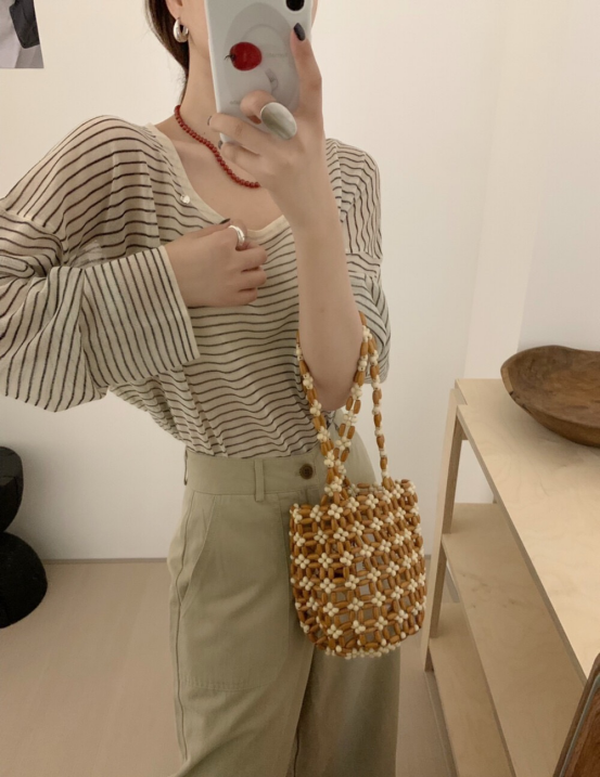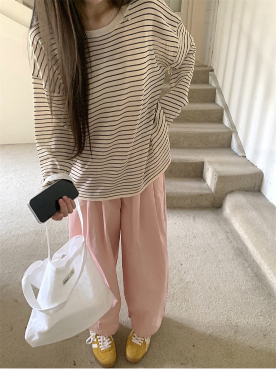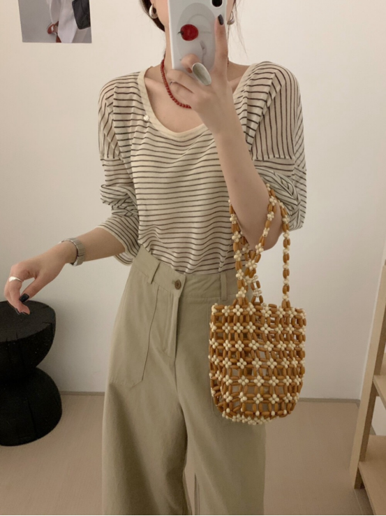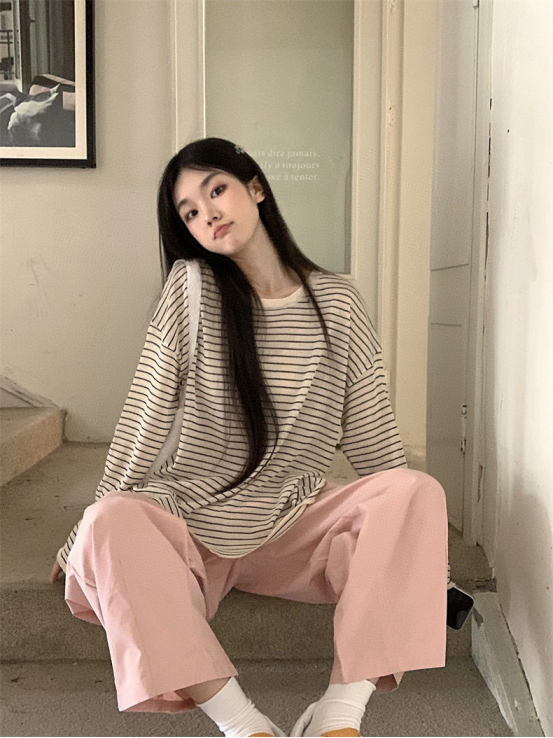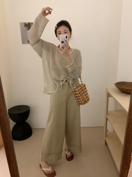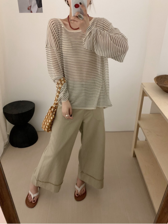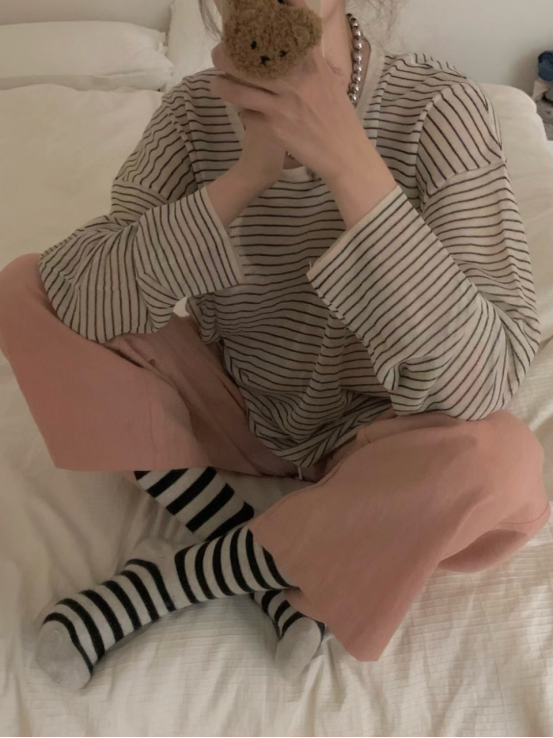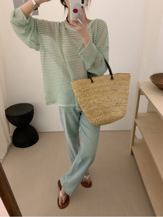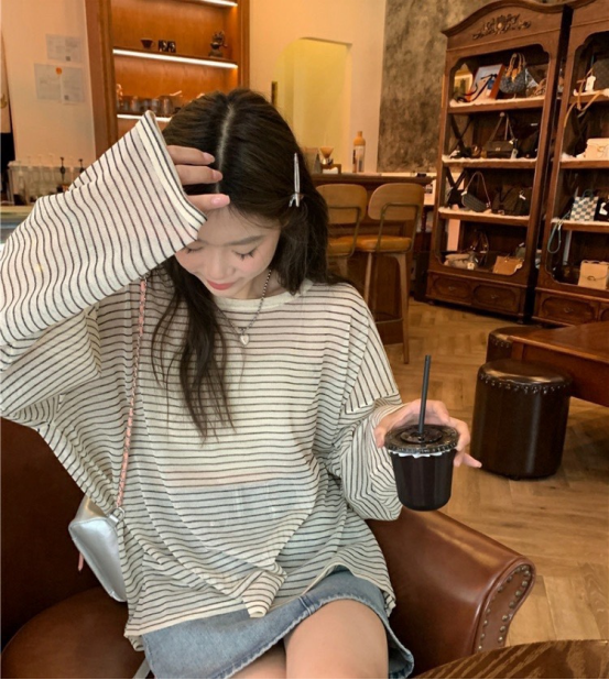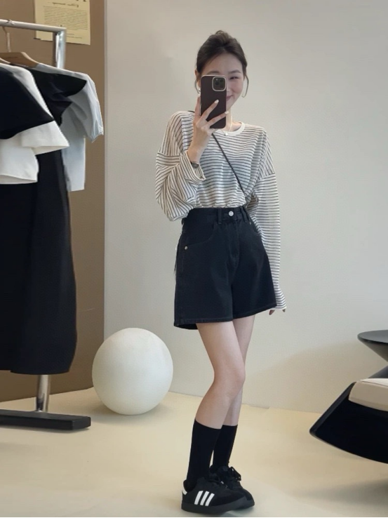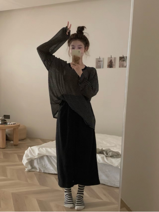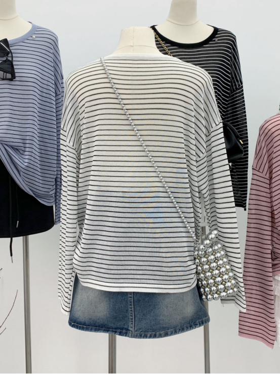 hin慵懒范的条纹长袖T 啥拜拜肉小肚子都看不到巨巨巨显瘦 随意搭个短裤or休闲裤 慵懒范立马就有了 hhhh~ 实穿好穿让人一眼记住的防晒条纹T! 经典条纹元素永不过时! 比起纯色更具有时髦的造型感 从职场通勤到运动休闲都能 HOLD住! 夏季实穿top防晒条纹 Tee 松弛慵懒感根本穿不腻~ 宽松版型!对身材没有限制 遮肉显瘦的效果HEN好!!爱了爱了! 🖤#黑色 基础日常百搭显瘦~ 里面可以穿各种美背bra 防晒T真的是懒人挚爱 慵懒随意 上身纸片人既视感的宽松条纹T恤!