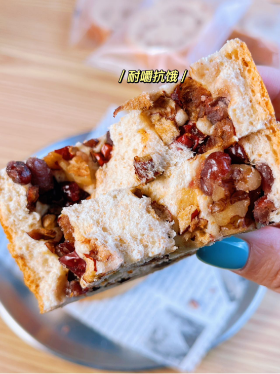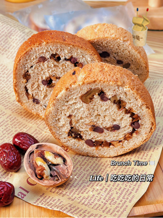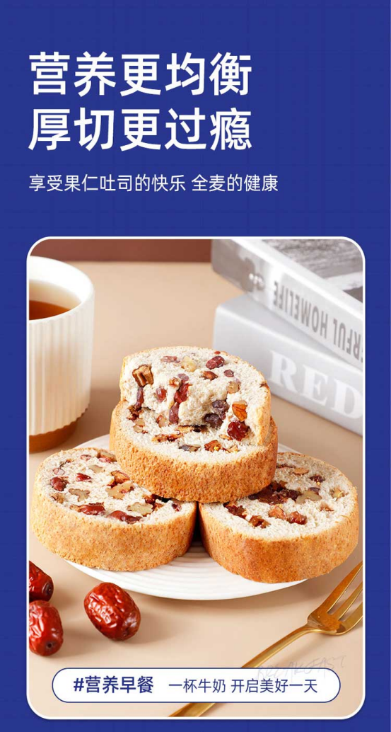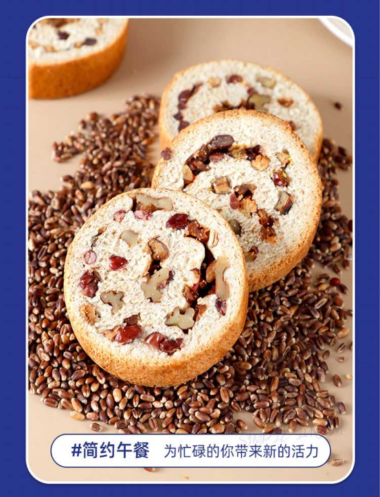 口感细腻:经过精心烘焙工艺处理,使得全麦核桃仁吐司面包保持松软而不失嚼劲的口感 既不甜腻又能让人品尝到谷物原有的香醇滋味。