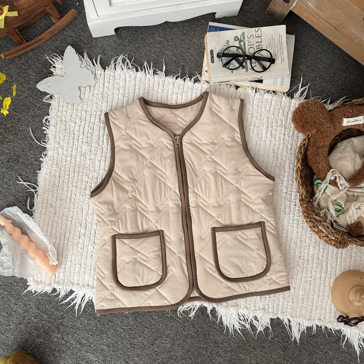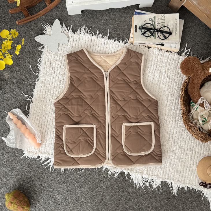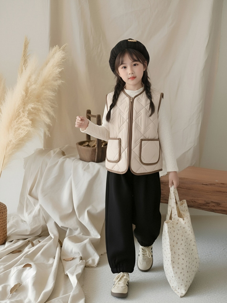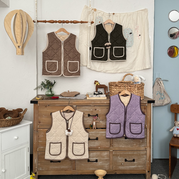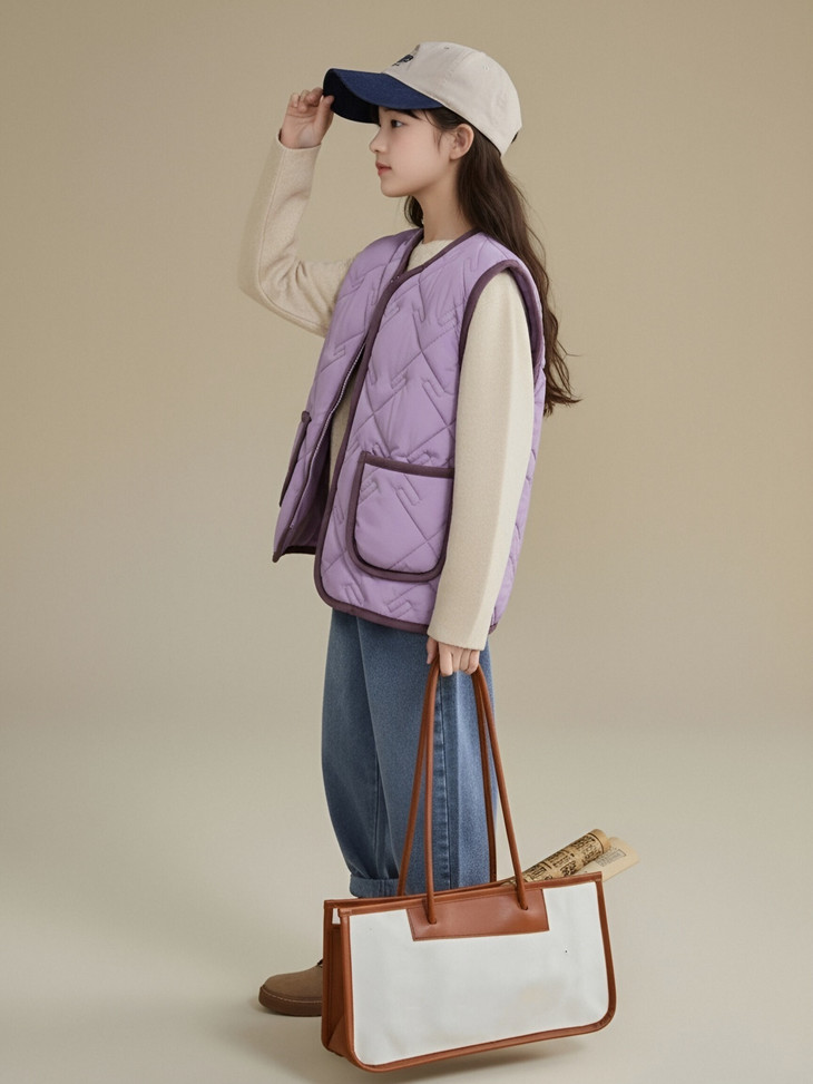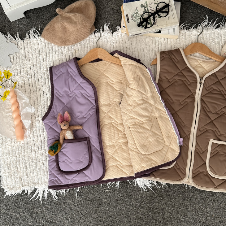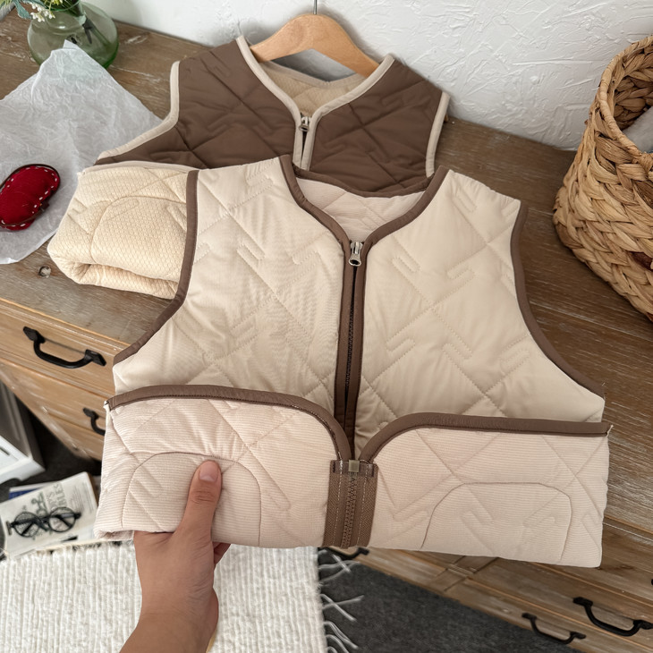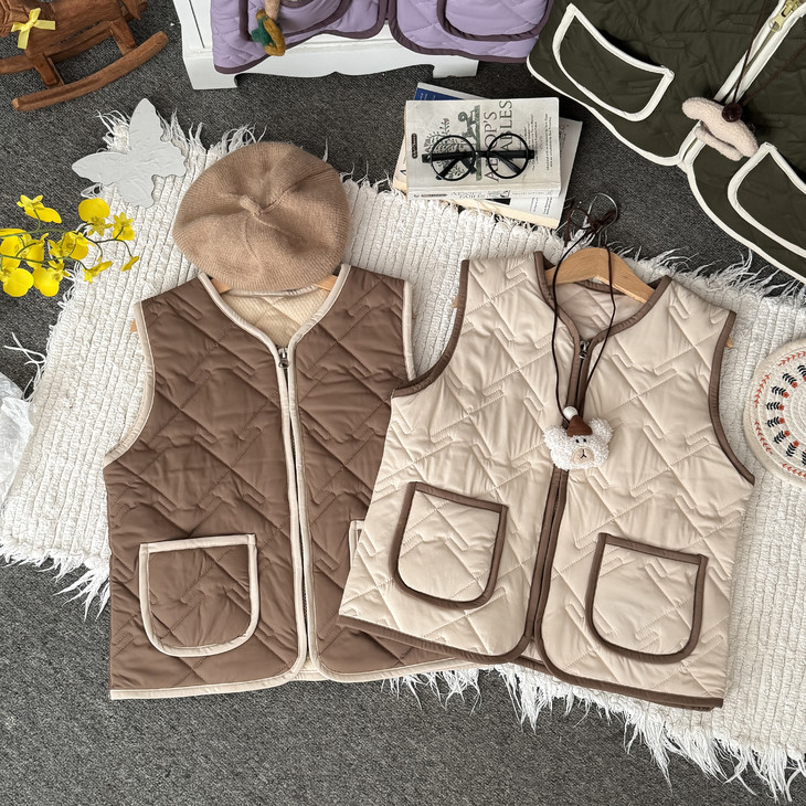 款式①撞色边外套 款式②撞色边马甲 衣领和口袋用反差色包边 细致到连拉链和拉链头都是反差色撞色 独特又时尚 小桃心领口,修饰脸型 灵活叠穿,保暖不臃肿