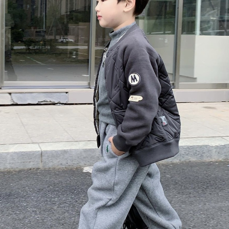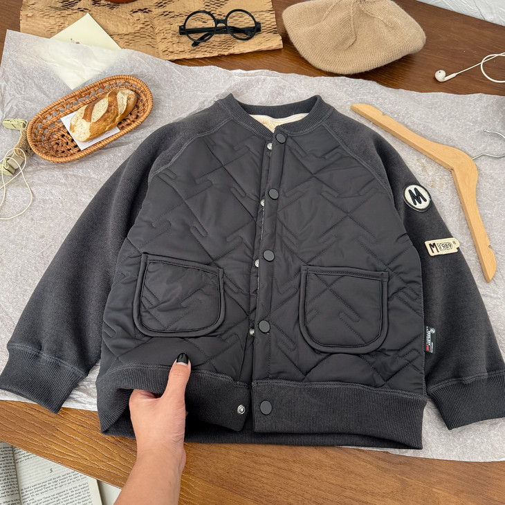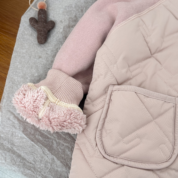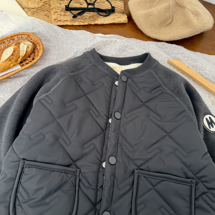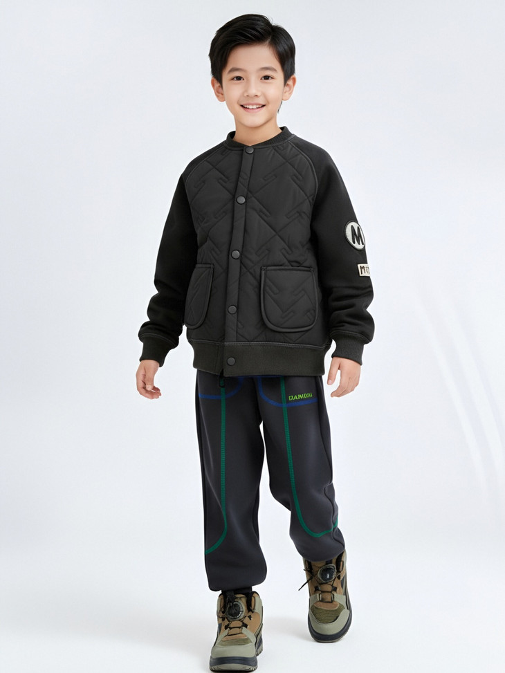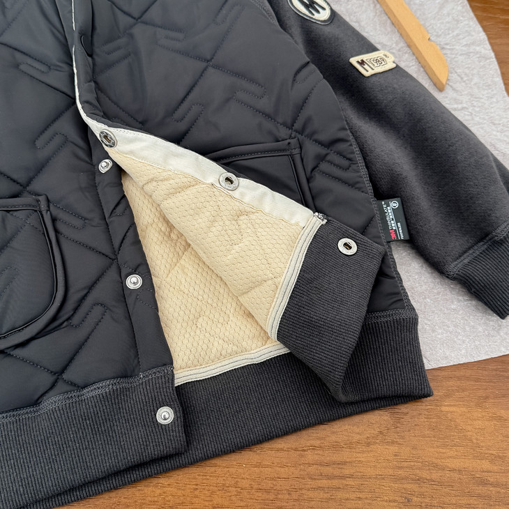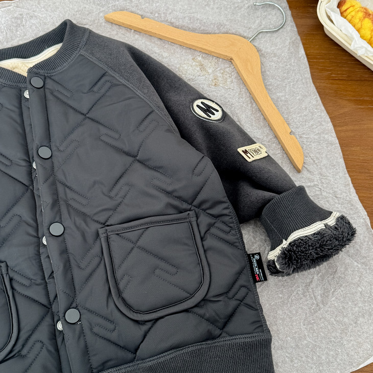 外套袖子是针织面料,超柔软贴合 袖子里加了绒绒内里,舒适包裹 左边袖子还有两个小袖章 螺纹袖口和下摆,防风防寒 同色系按扣设计,方便穿脱