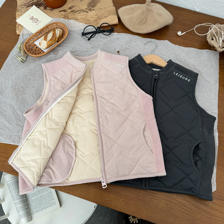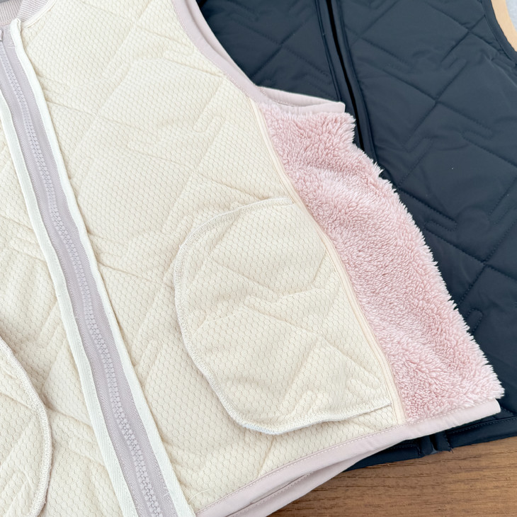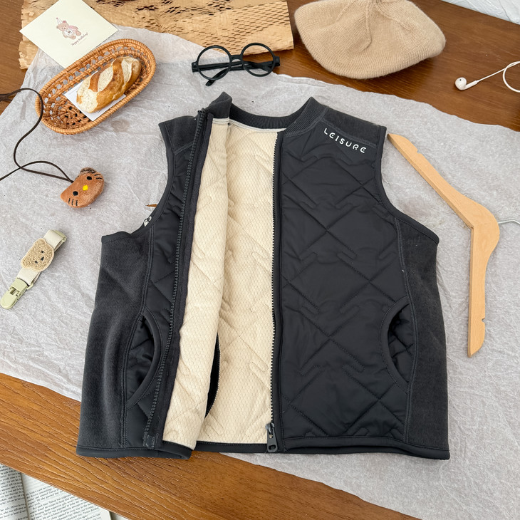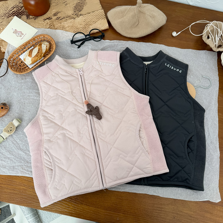 马甲是同色系拉链是开合 螺纹立领领口防风护颈 侧缝是针织外里,内里加绒设计 微弹侧缝,内搭可紧可松