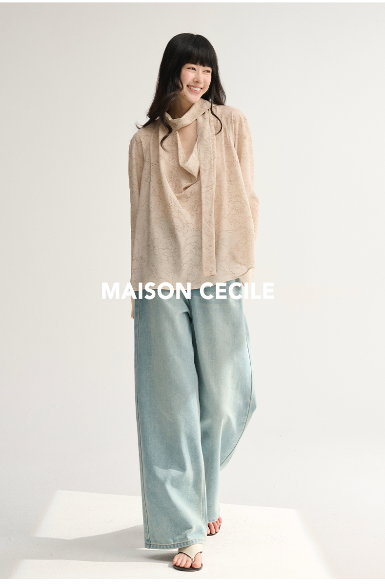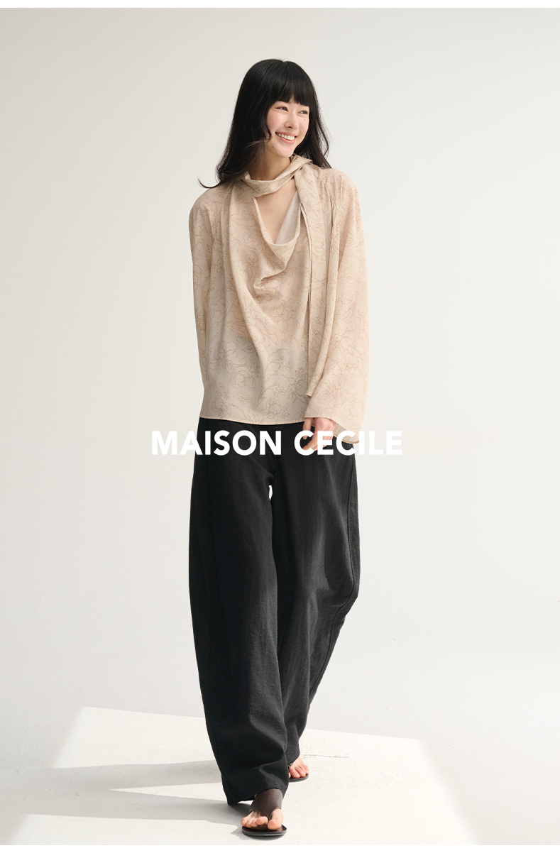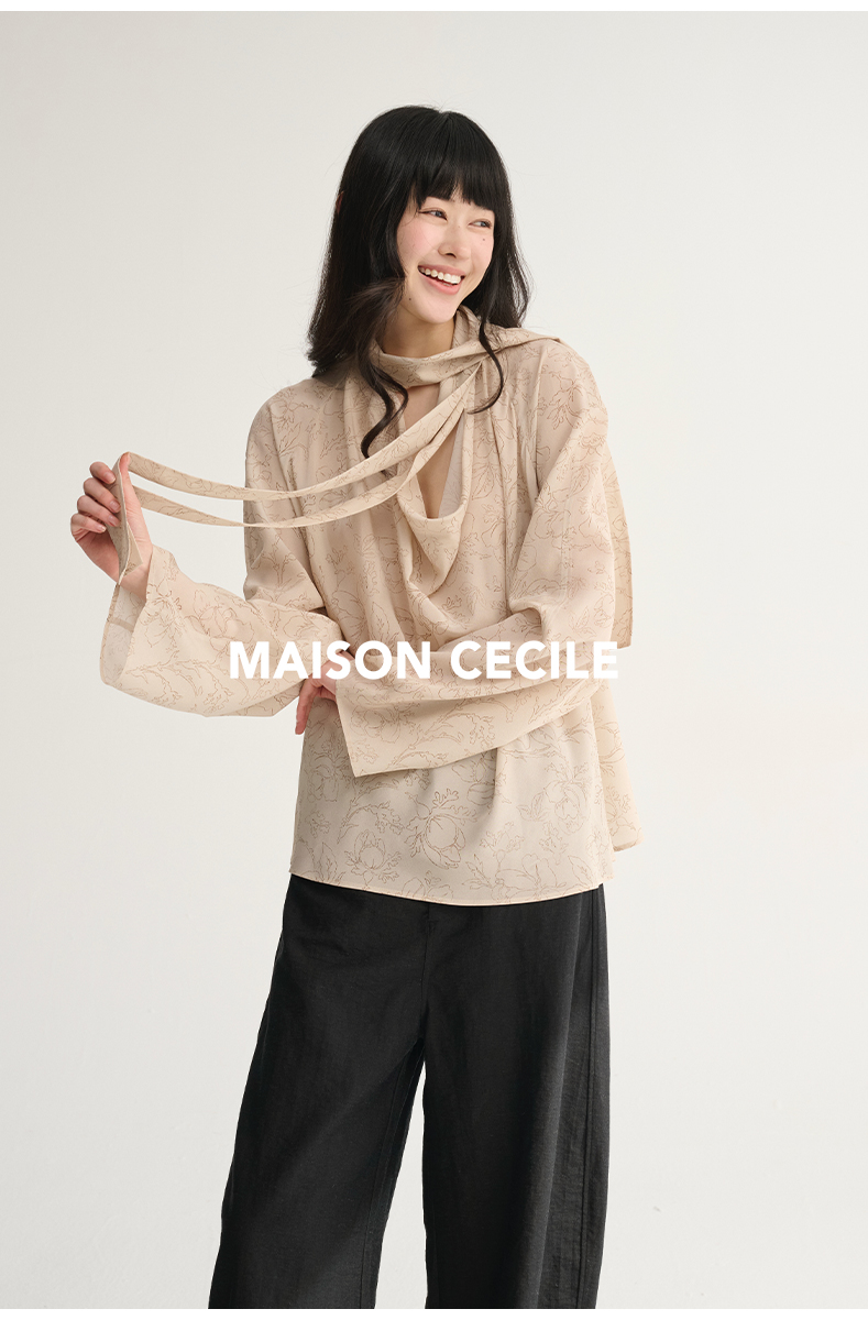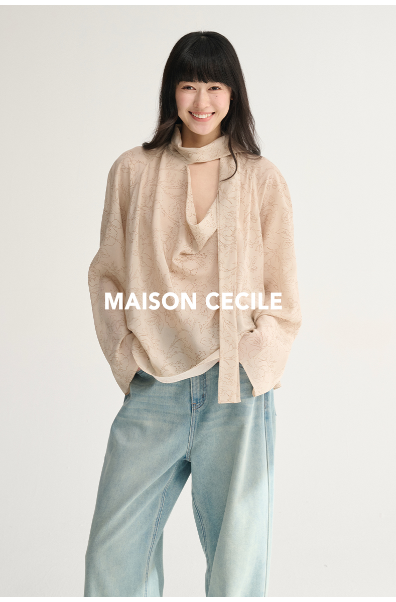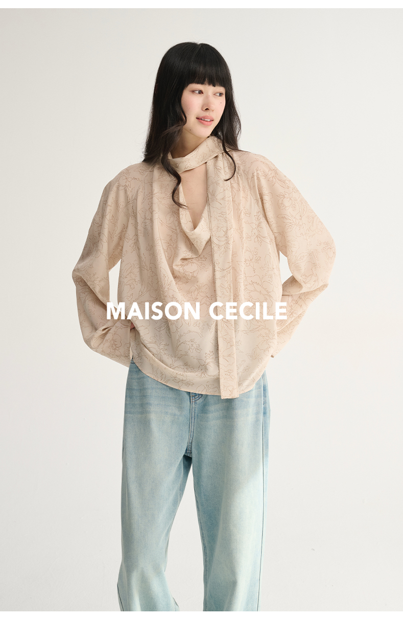 MAISON CECILE设计师印花桑蚕丝定染线条花朵优雅荡感飘带衬衫