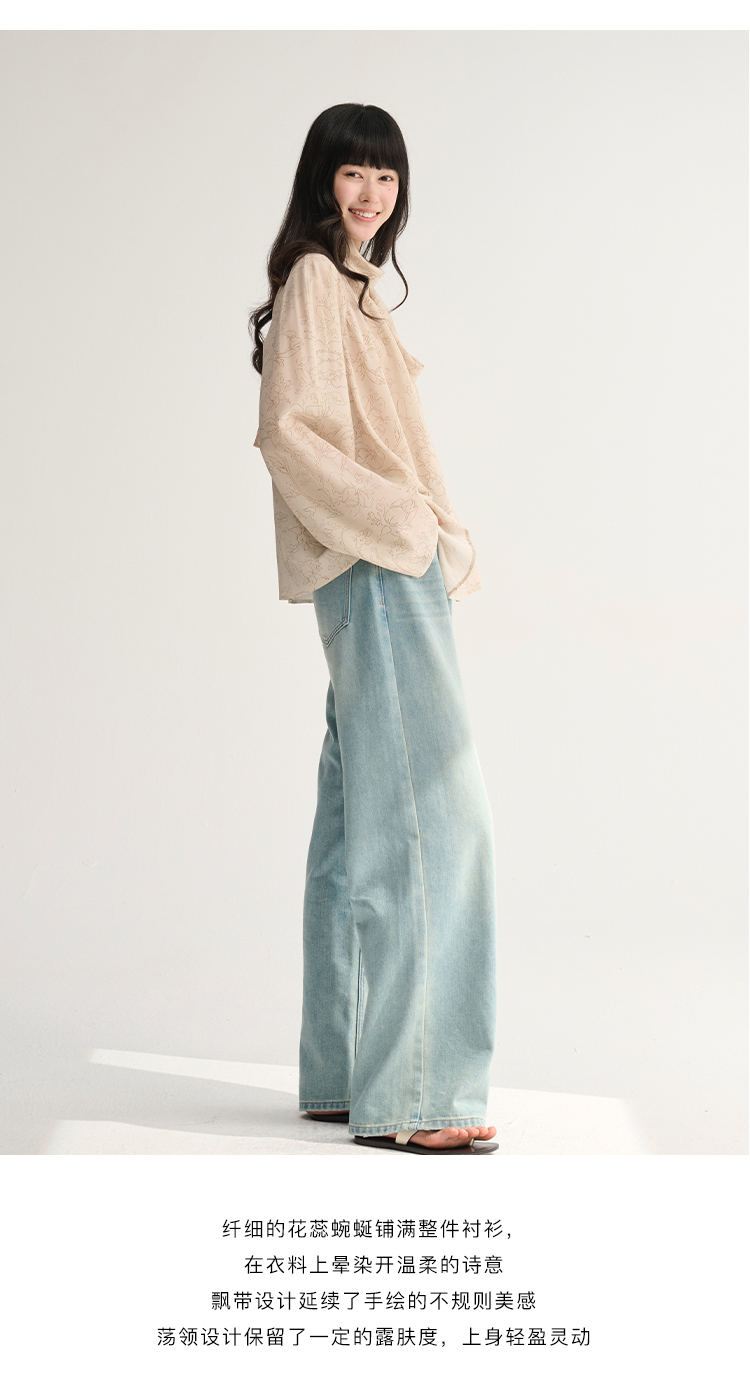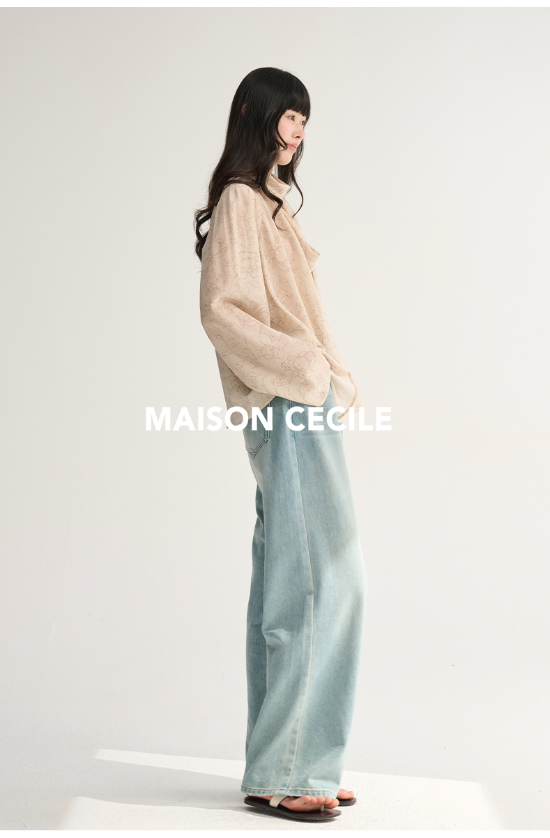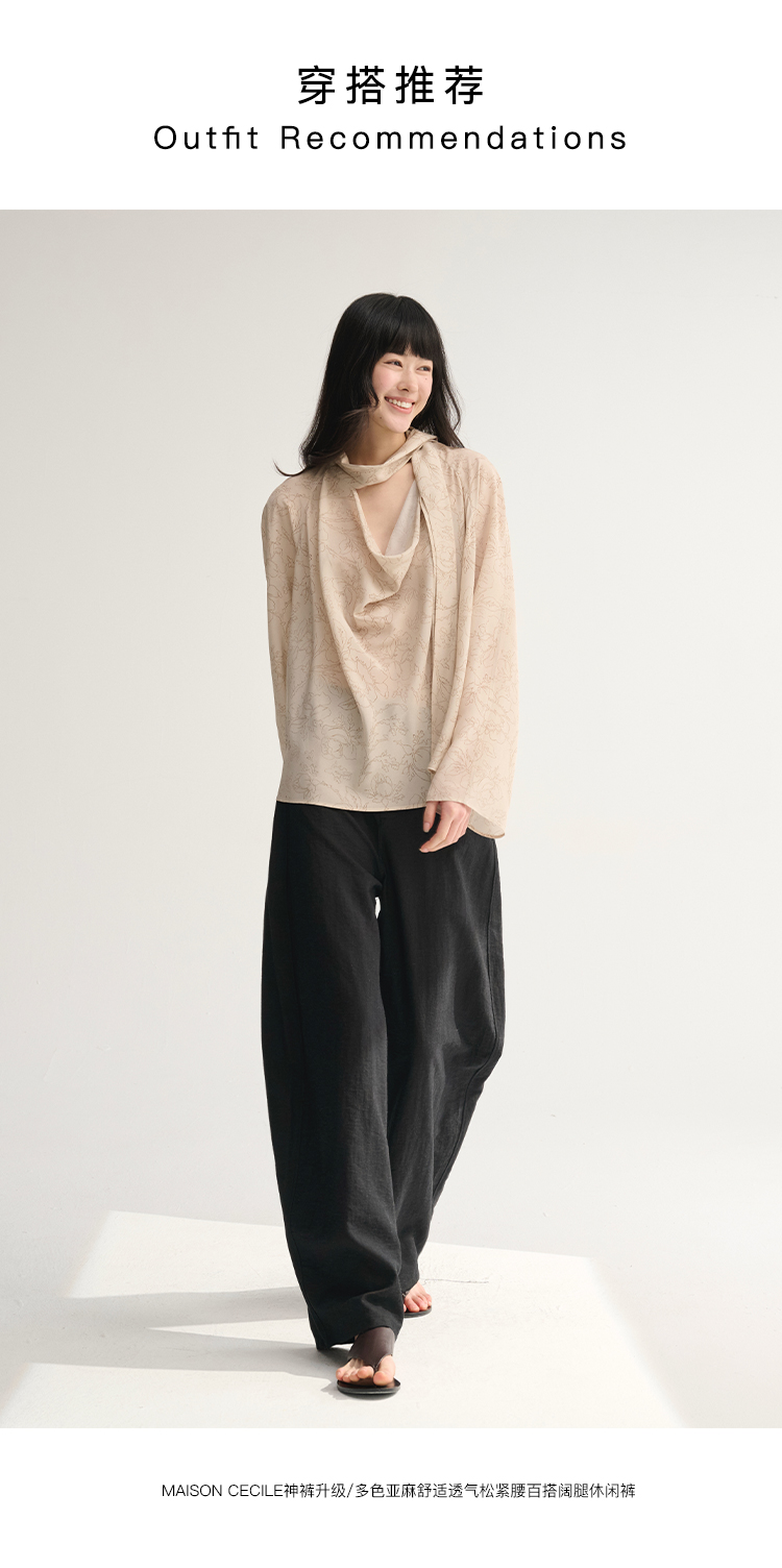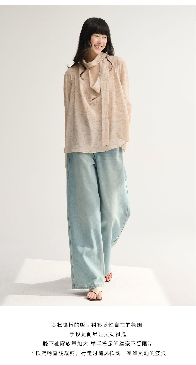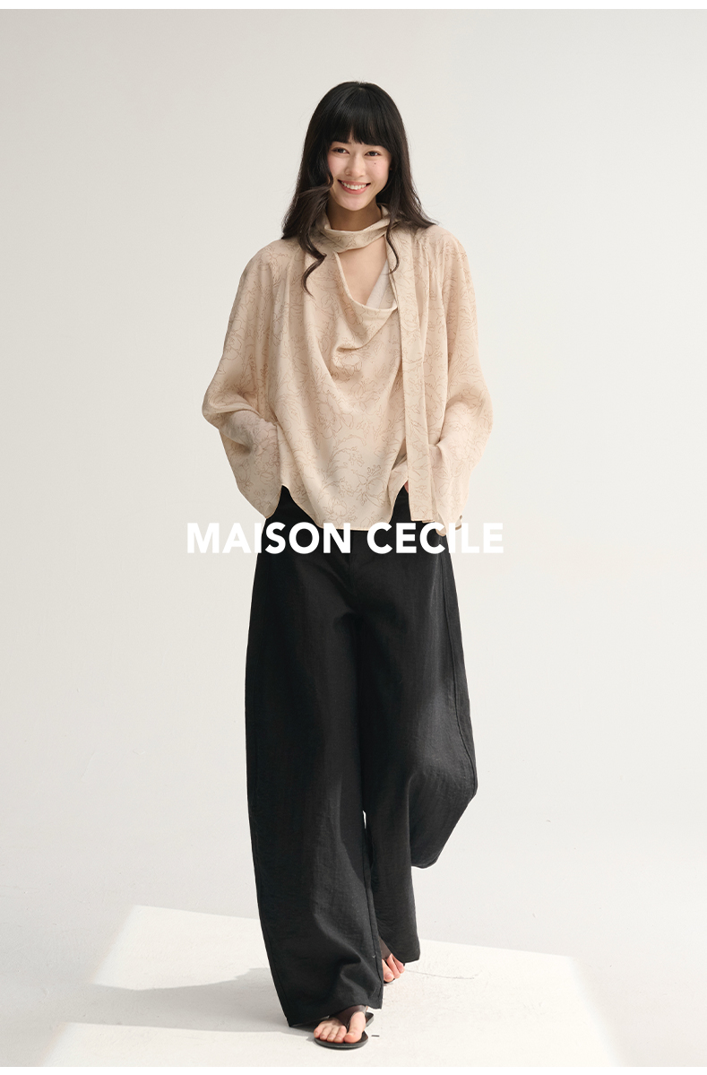 MAISON CECILE设计师印花桑蚕丝定染线条花朵优雅荡感飘带衬衫