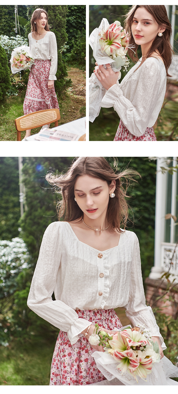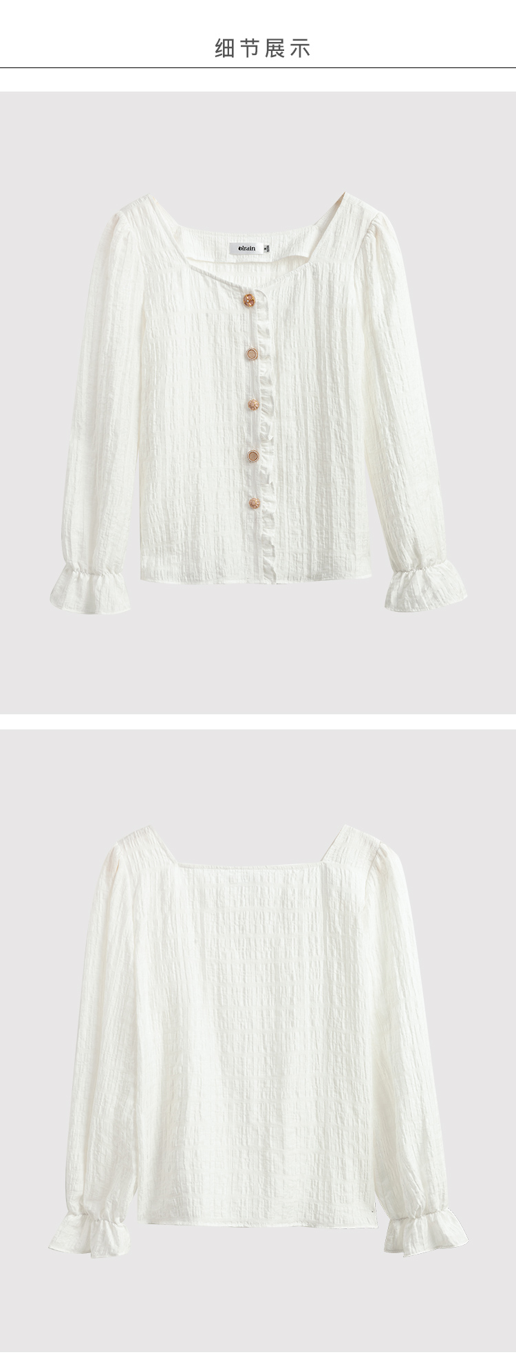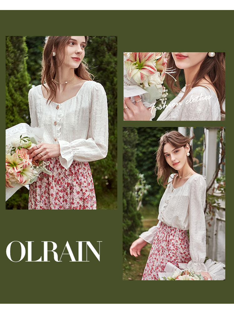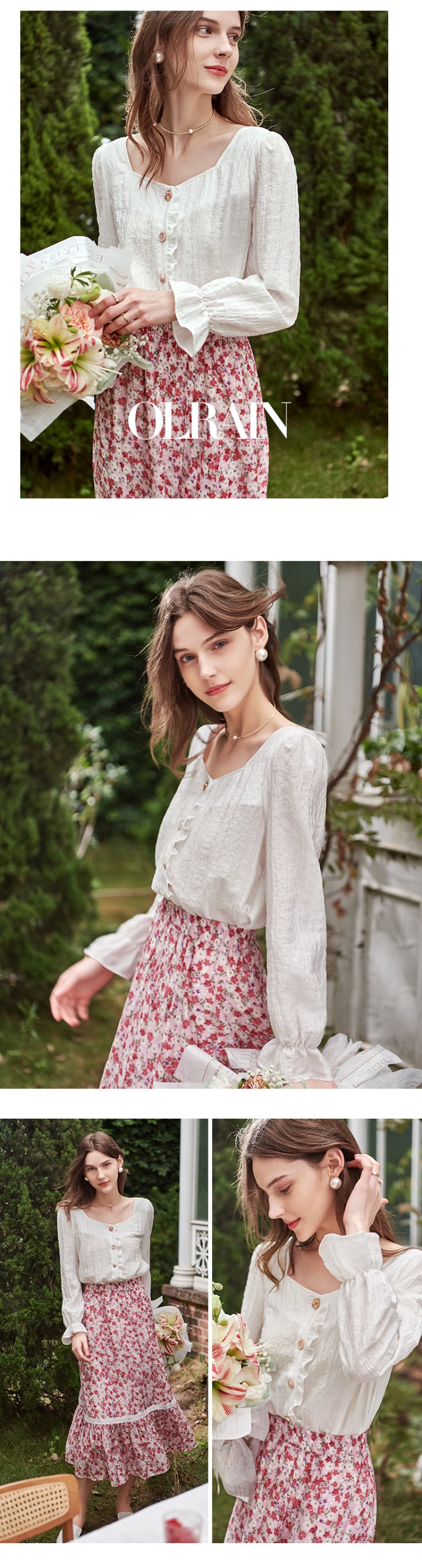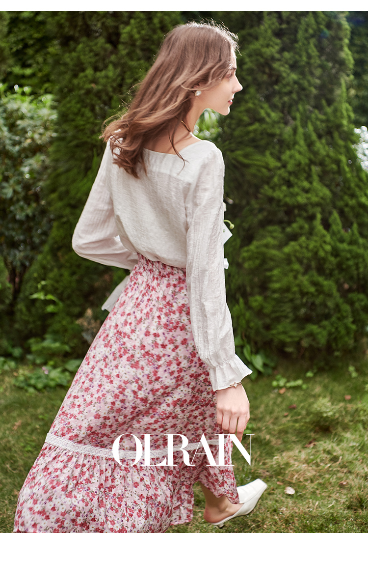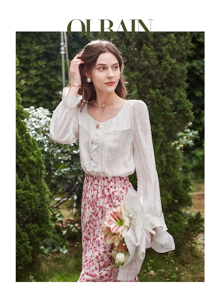 欧芮儿长袖提花衬衫女春新款荷叶边气质优雅简约时髦白色衬衣