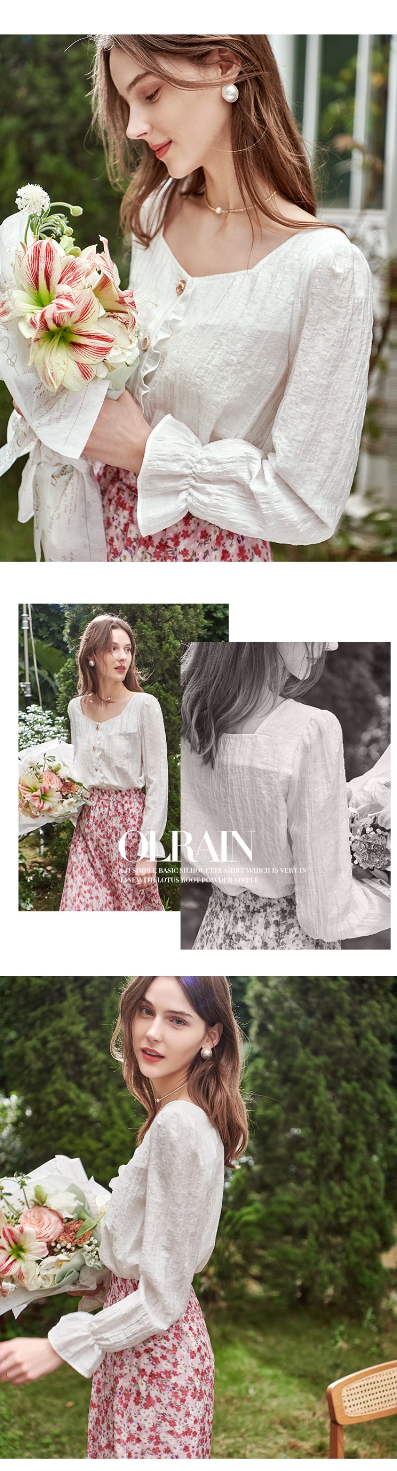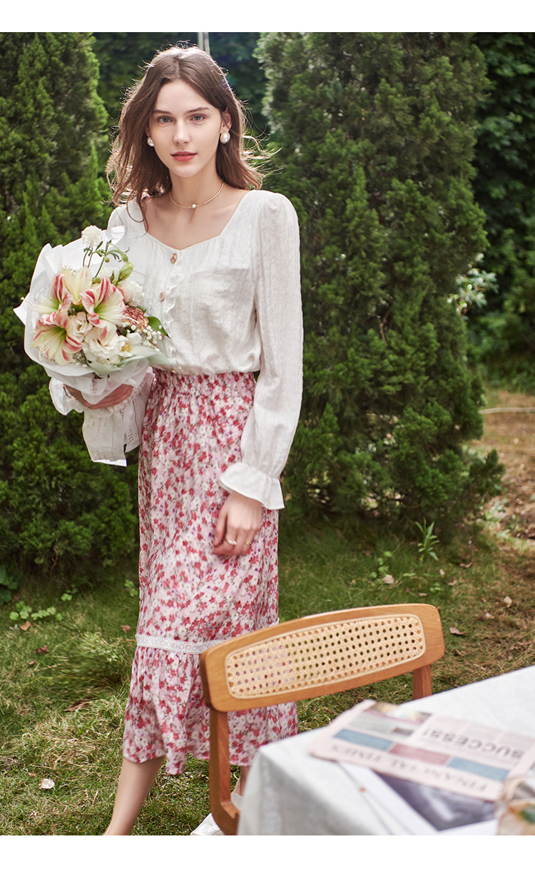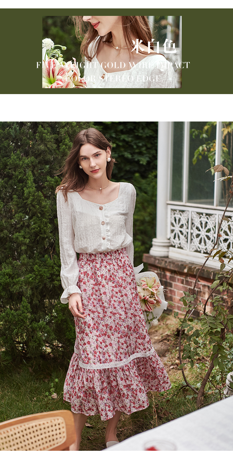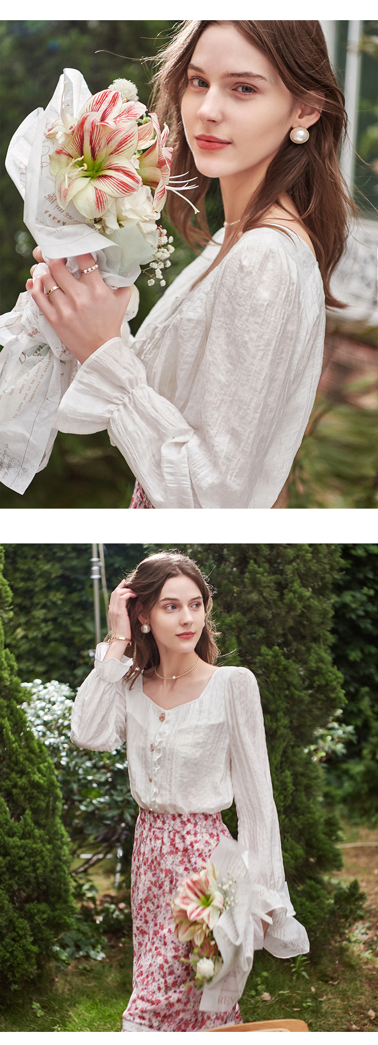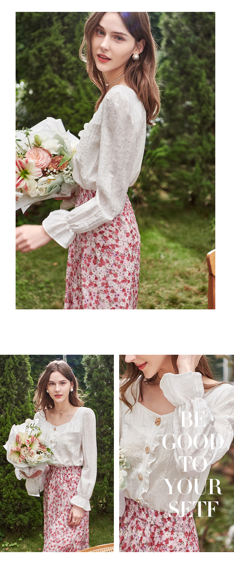 欧芮儿长袖提花衬衫女春新款荷叶边气质优雅简约时髦白色衬衣
