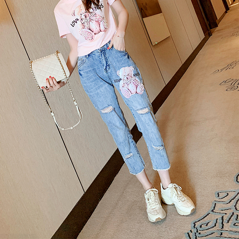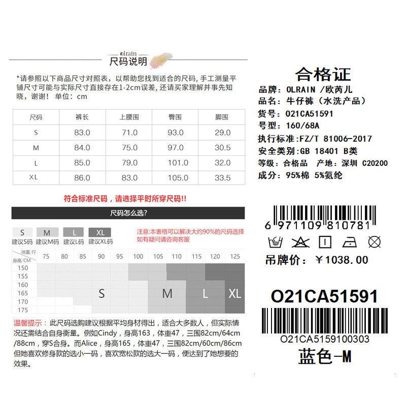 欧芮儿2021年蓝色九分牛仔裤