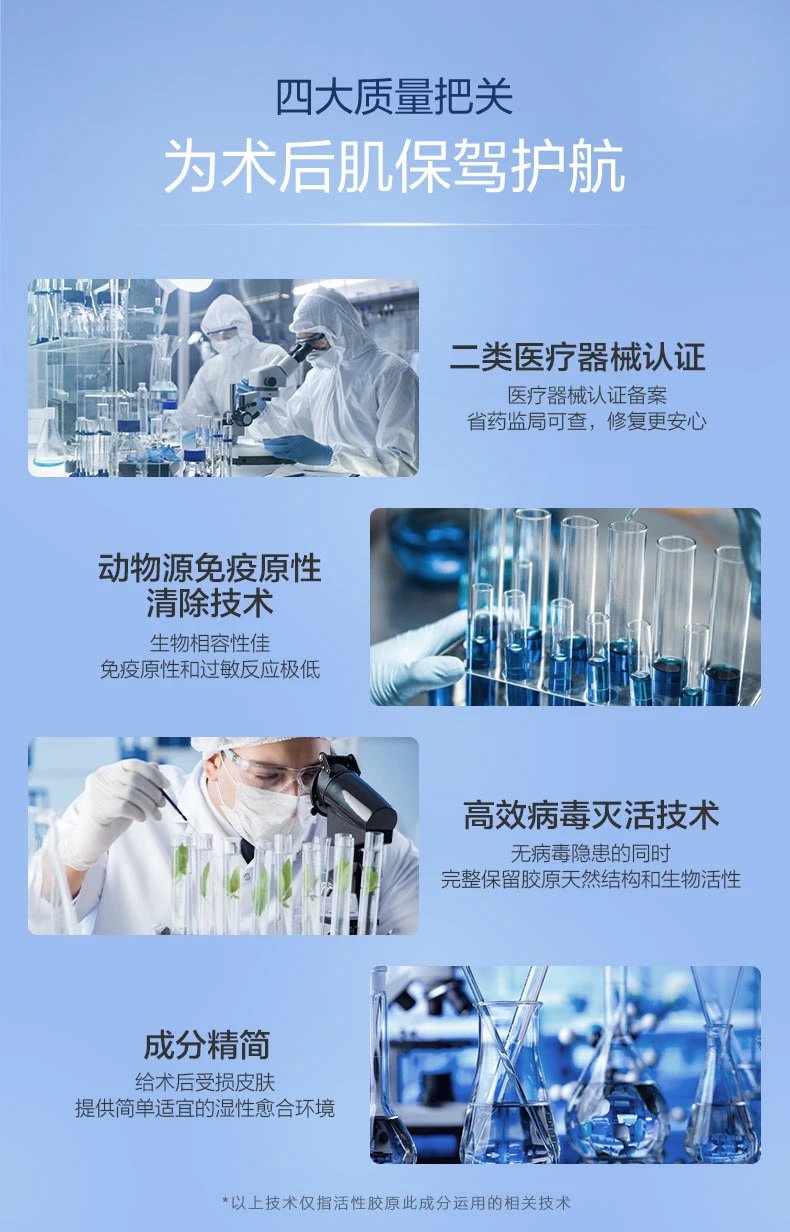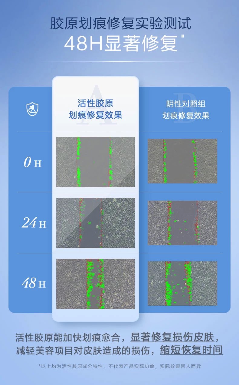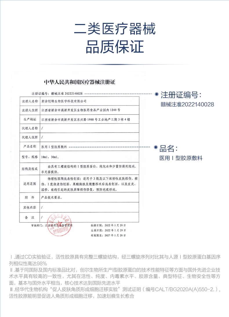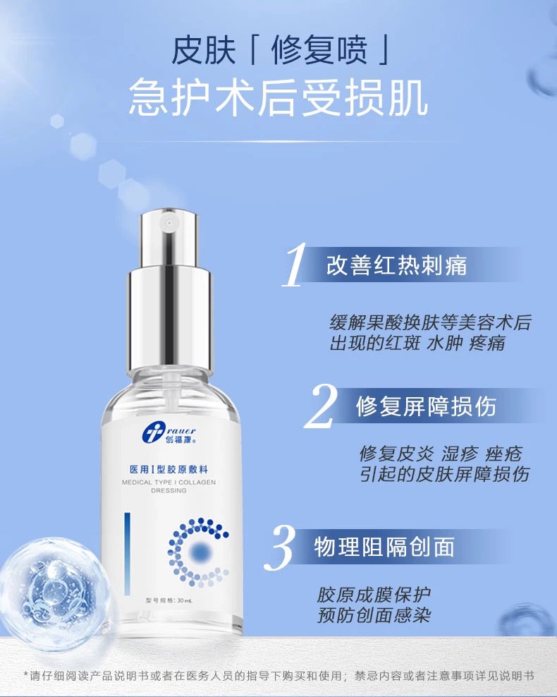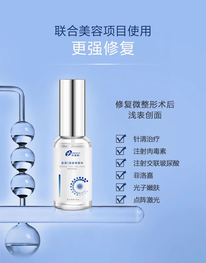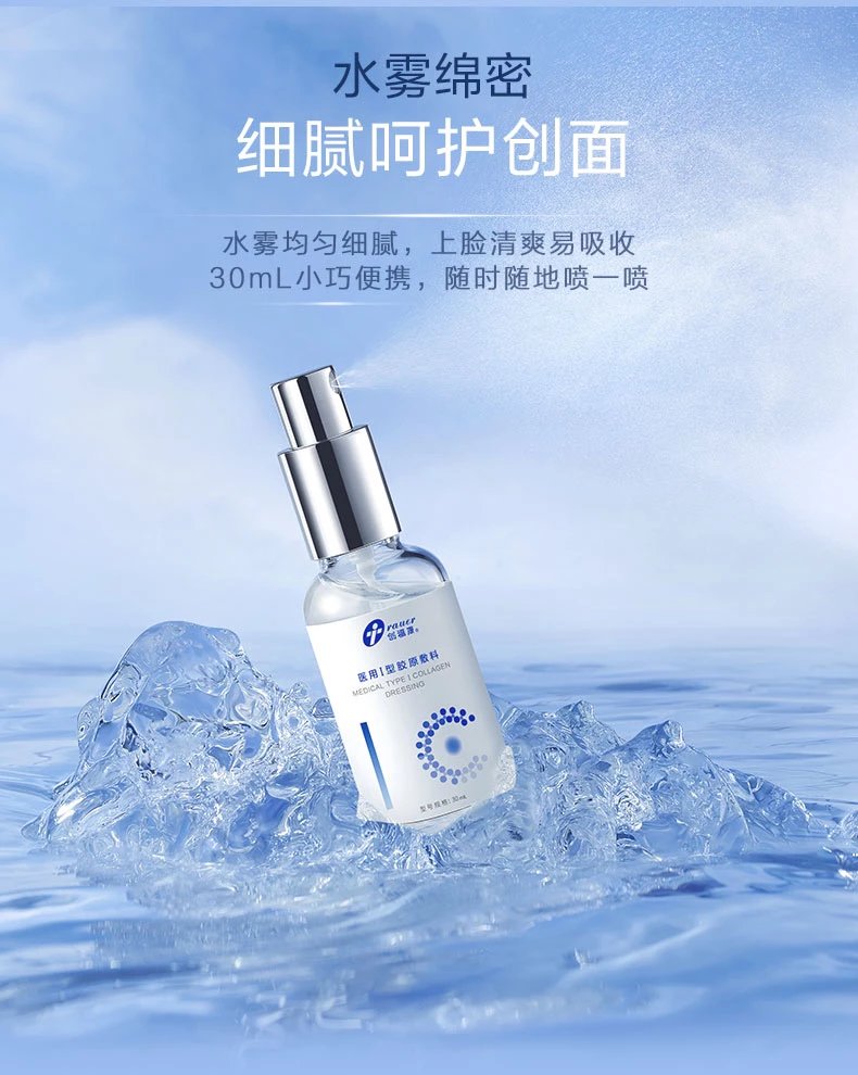 由具有三螺旋结构的Ⅰ型胶原蛋白、纯化水、少量防腐剂组成。更易容被人体肤肌吸收,修复面创问题!