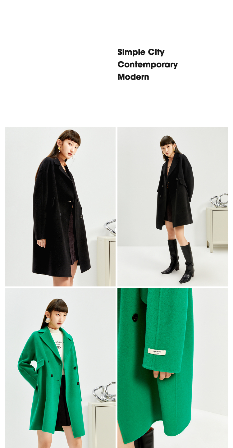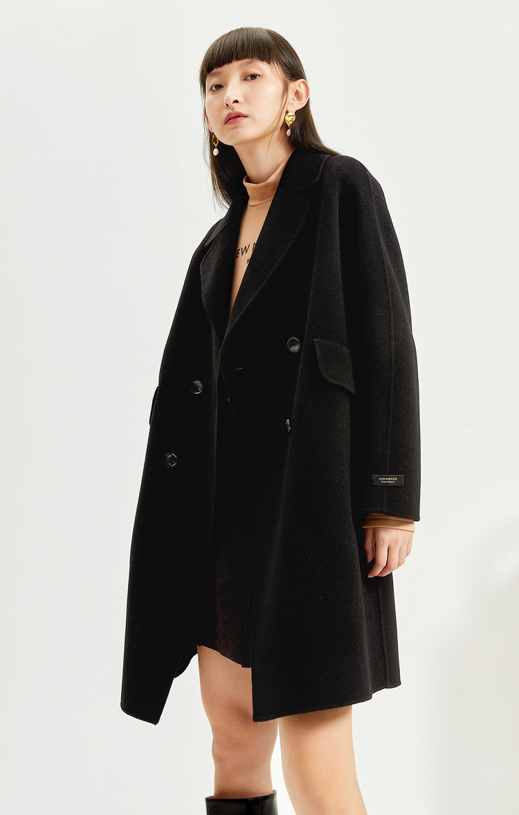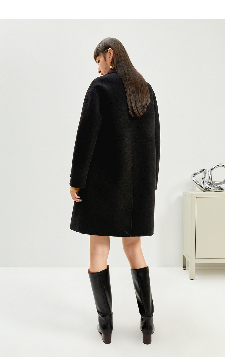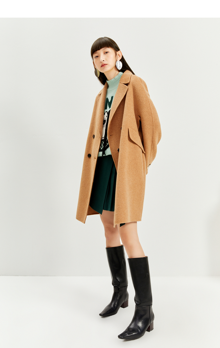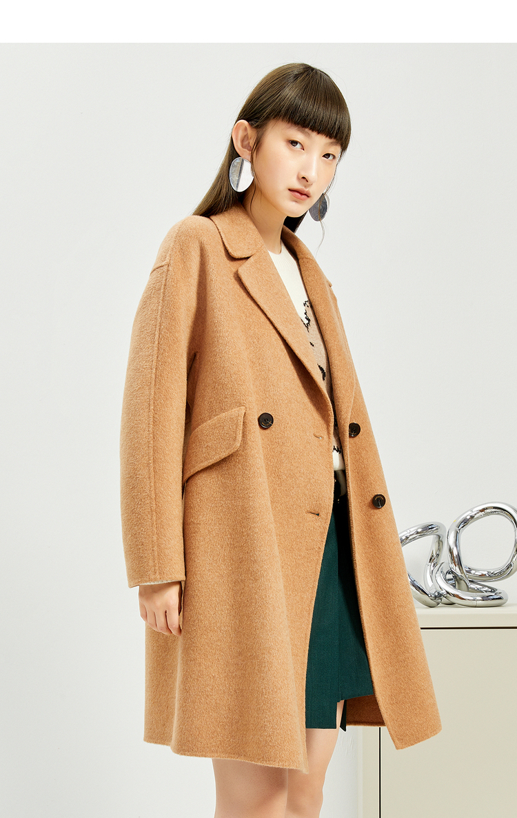 NEELLY纳俪商场同款外套女2021年新款双面呢大衣羊毛双排扣中长款