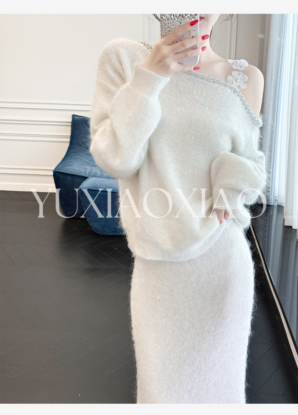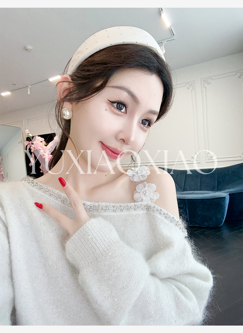 余潇潇【花肩美梦】马海毛羊毛混纺立体花朵斜肩毛衣&鱼尾半裙套装