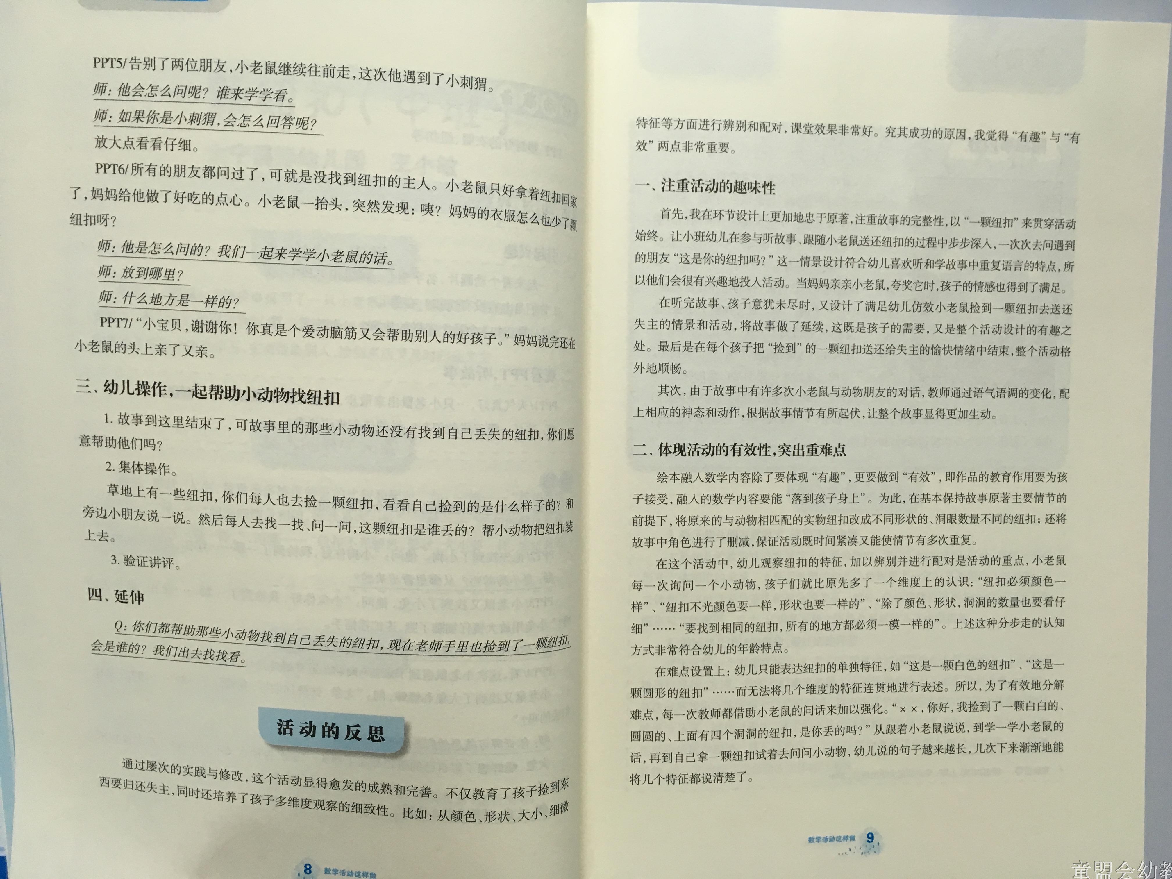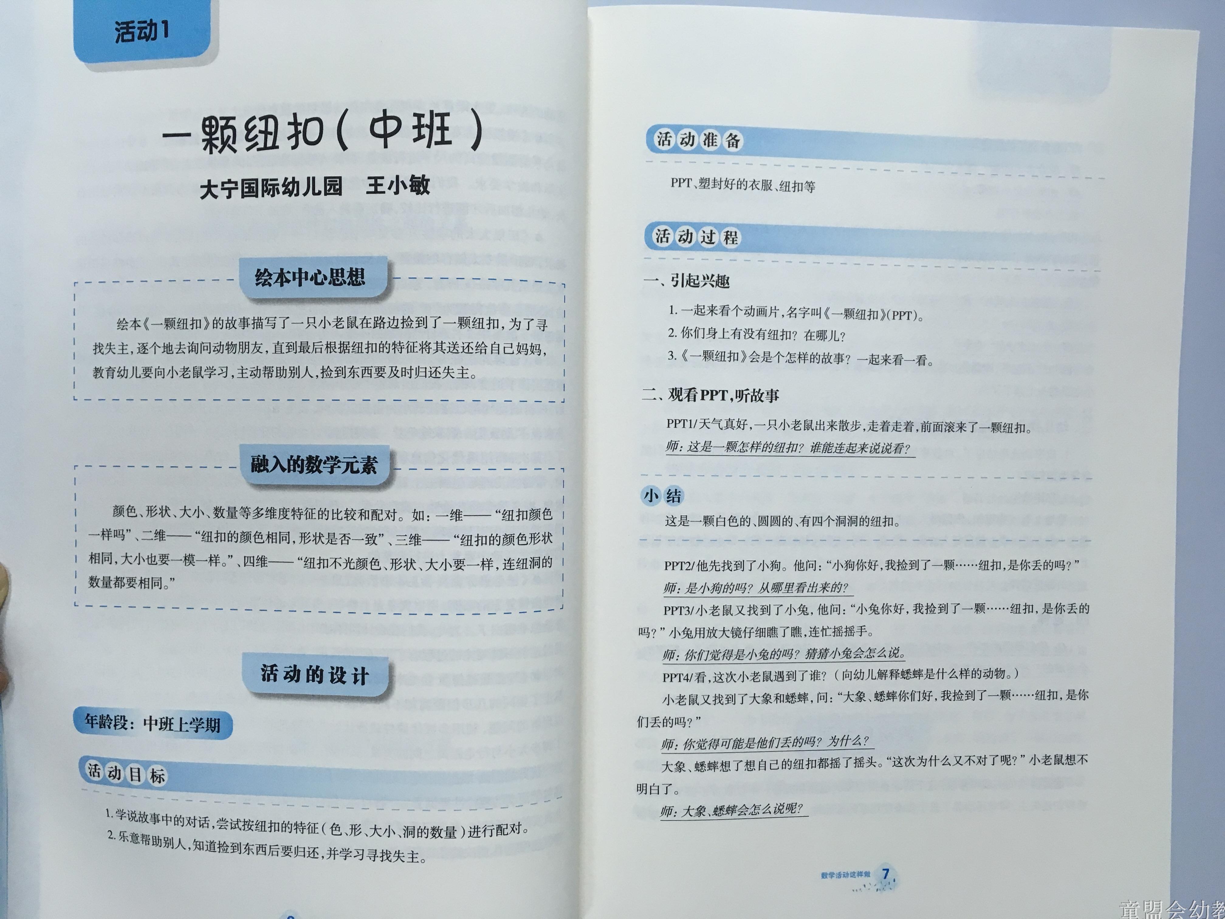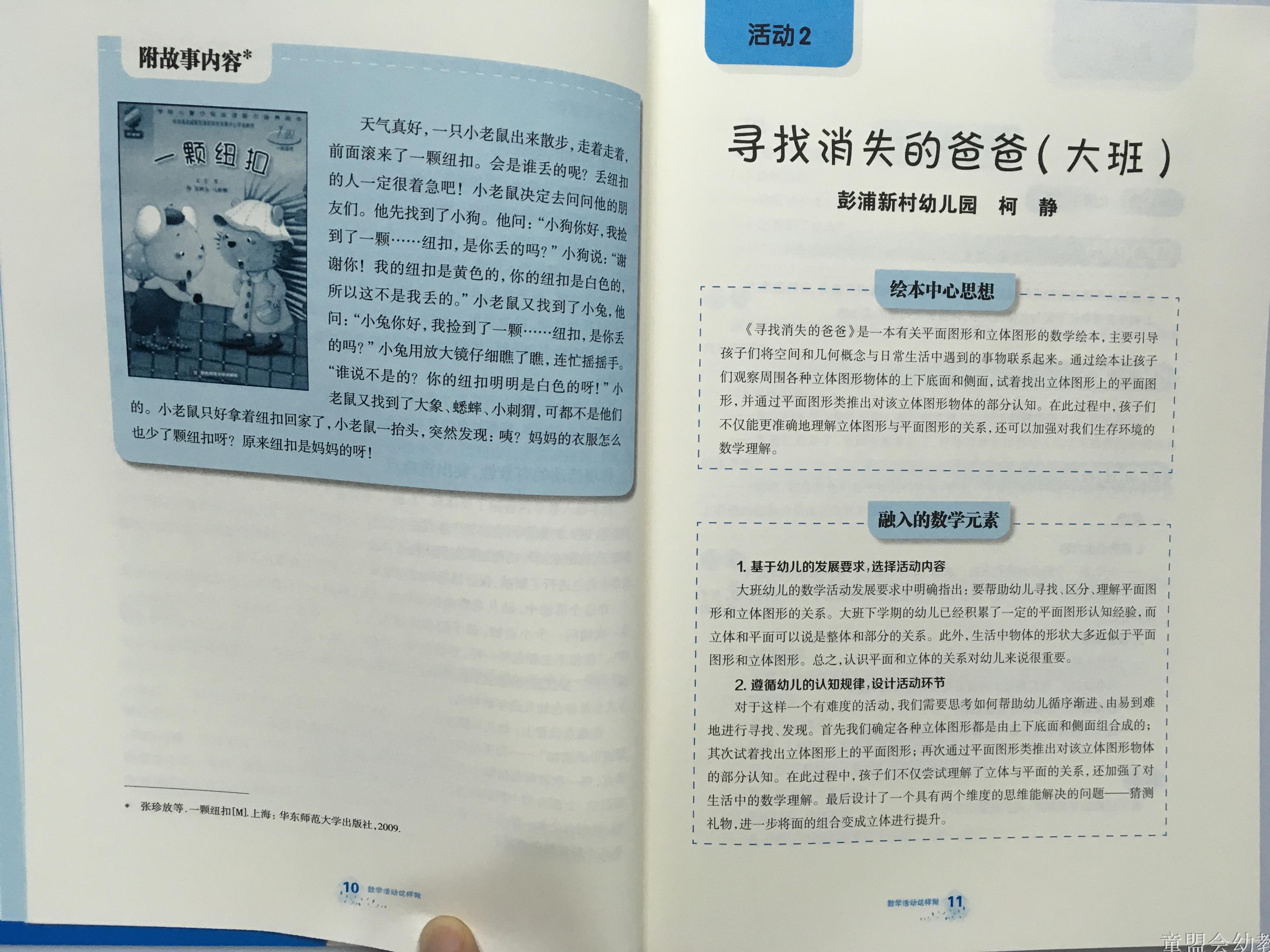 由徐苗郎主编的《幼儿园数学活动这样做》按上述内容分为两个板块依序展开:第一板块以导引性专题文章“用图画书进行幼儿数学”为切入点,精选12个活动案例,围绕这一主题分别从“绘本中心思想”、“融人的数学元素”、“活动的设计”及“活动的反思”等方面来具体阐述;第二板块内容由两部分构成:以3篇专题文章作为导论,强调学具对幼儿数学教育的重要性,以及分享在学具材料投放方面的心得;接着,详细介绍了运用包括“5只猴子”、“几何图形片”等在内的7种学具开展数学活动的使用策略,并配以实践案例来呈现具体的实施方法。