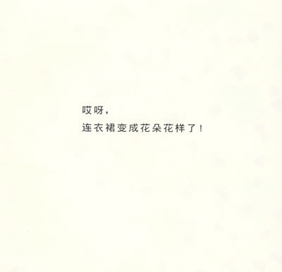 你发现没有?这是一本以三拍子节奏展开的图画书。什么叫三拍子呢,就是它有一个不断重复的结构——画面“1·2·3”、“1·2·3”地一遍又一遍地重复着,类似音乐里的节拍。你看,小兔子穿上雪白的连衣裙这张画,是不是和后面的小兔子穿上花朵、雨点、草籽、小鸟花样的连衣裙的画面几乎一样?小兔子走进花田这张画,是不是和下雨了、走进草丛、飞来一群小鸟的画面差不多?小兔子的连衣裙变成花朵花样这张画,是不是和连衣裙变成雨点、草籽、小鸟花样的画面差不多?如果我们把小兔子穿上连衣裙这张画叫做1,走进花田这张叫做2,连衣裙变成了花朵花样这张叫做3,那么,后边就又“1·2·3”、“1·2·3”、“1·2·3”地重复了三遍。这是一种连一个两三岁幼儿都能明白的重复,他们喜欢这种重复,期盼这种重复。这虽然是一种无声的节拍,但伴随着翻页的动作,孩子们在心中能够感受得到这种音乐般的旋律。