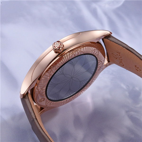 镜面材质 | 蓝宝石水晶玻璃 | 表盘 | Sedna 18K金镶钻表壳 深棕色亮漆表盘,镶贴浮雕Sedna 18K金罗马数字,指针亦采用同种材质制成。表冠由红色液态陶瓷打造,镶饰一颗钻石。 镜面表背饰以“Her Time”图案。 密底 |
