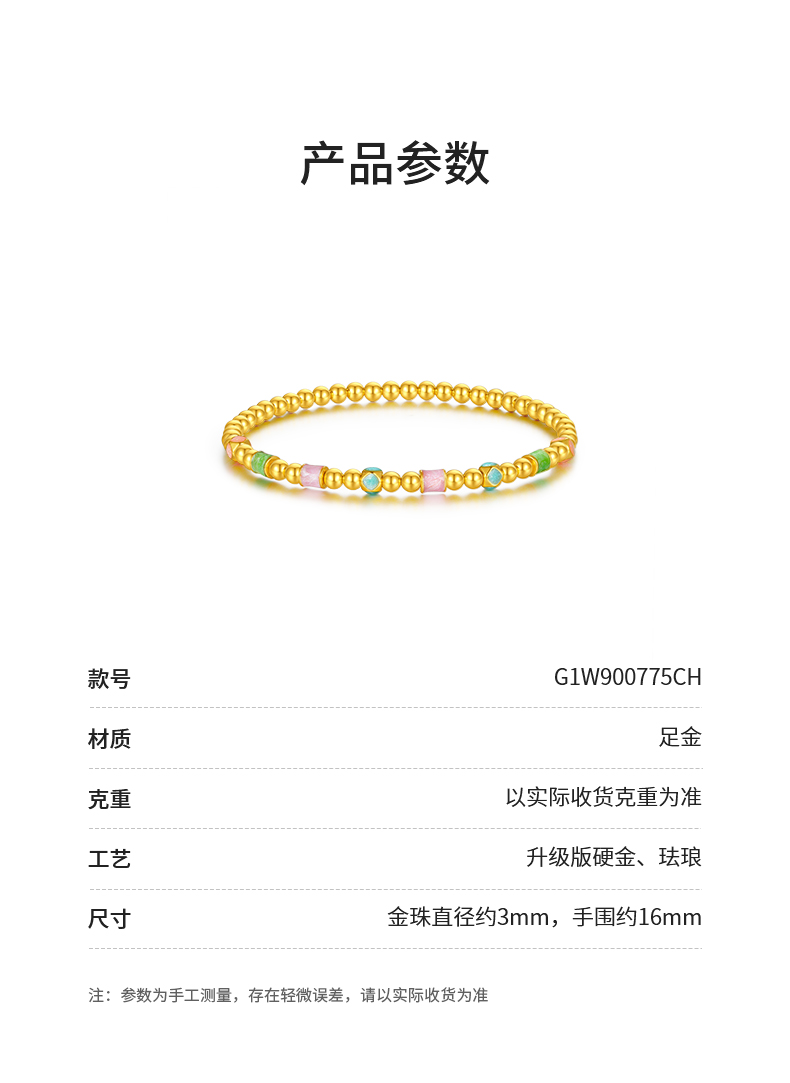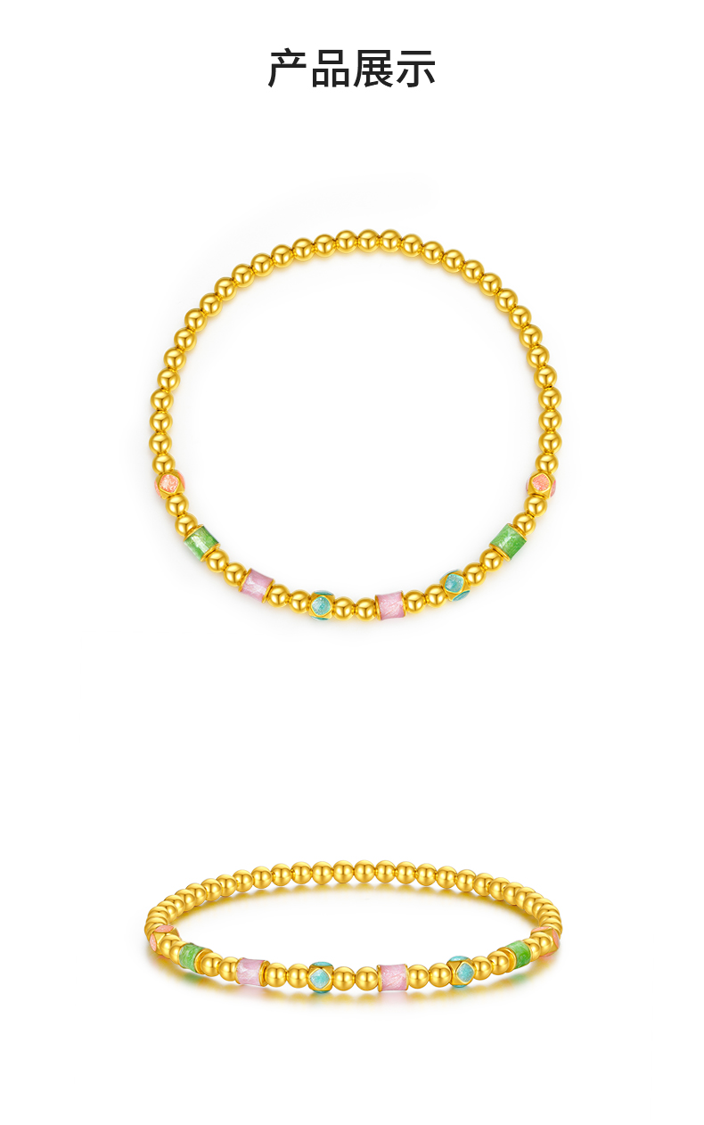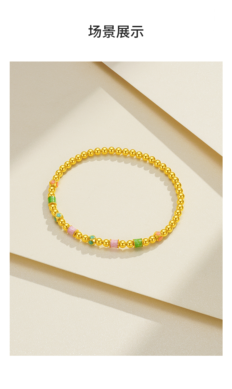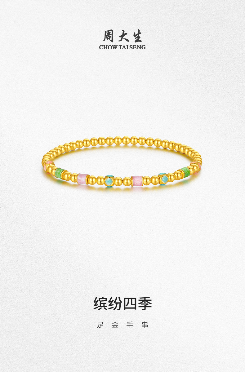 周大生黄金手串女足金硬金珐琅缤纷四季金珠手链送女朋友生日礼物