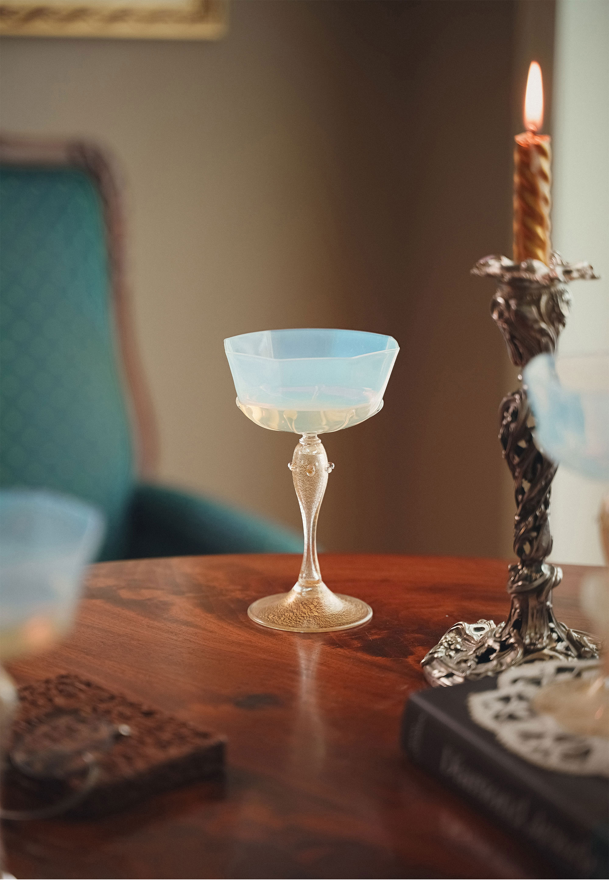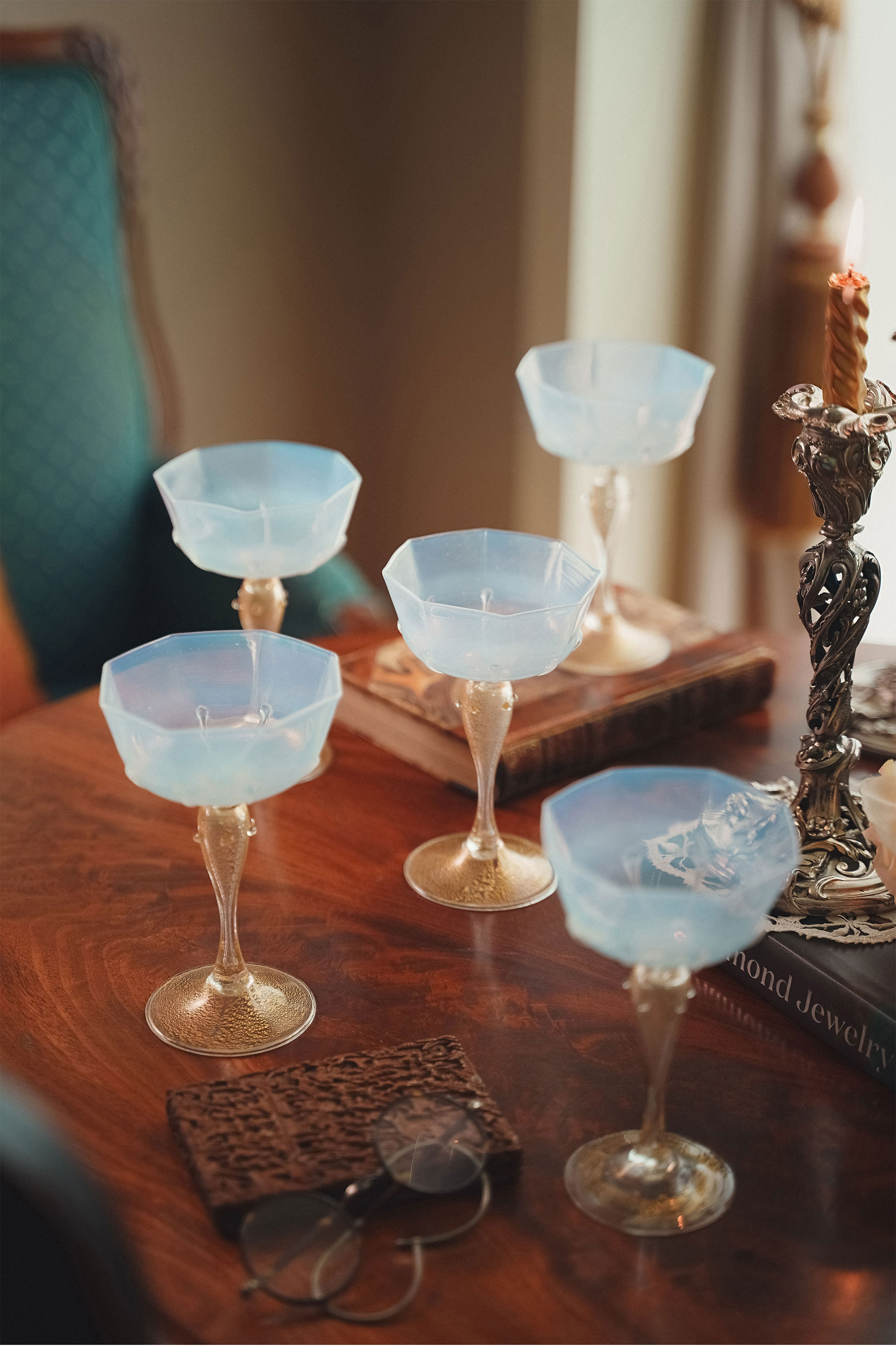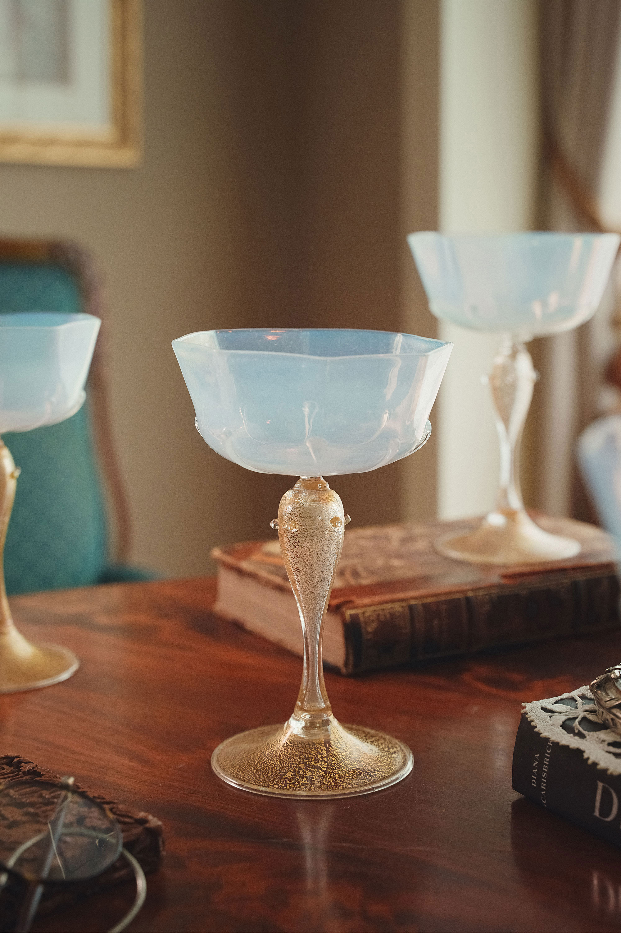 20世纪初意大利顶级玻璃制造商Salviati & Co.出品点金工艺装饰奶白色香槟杯(5件)