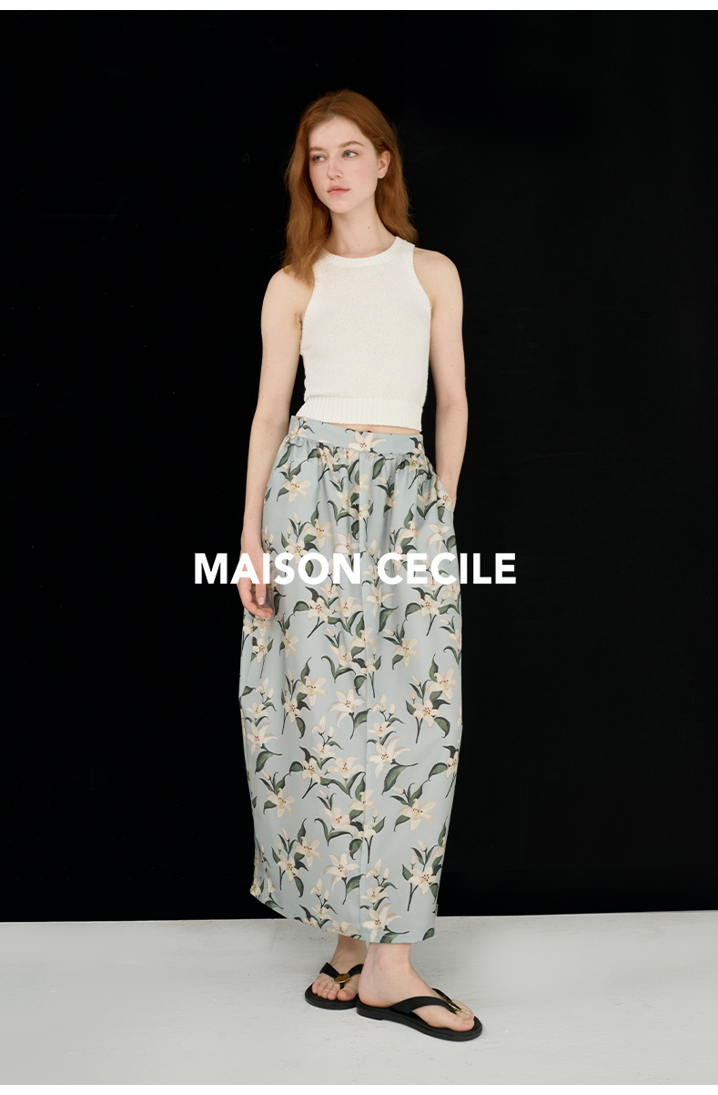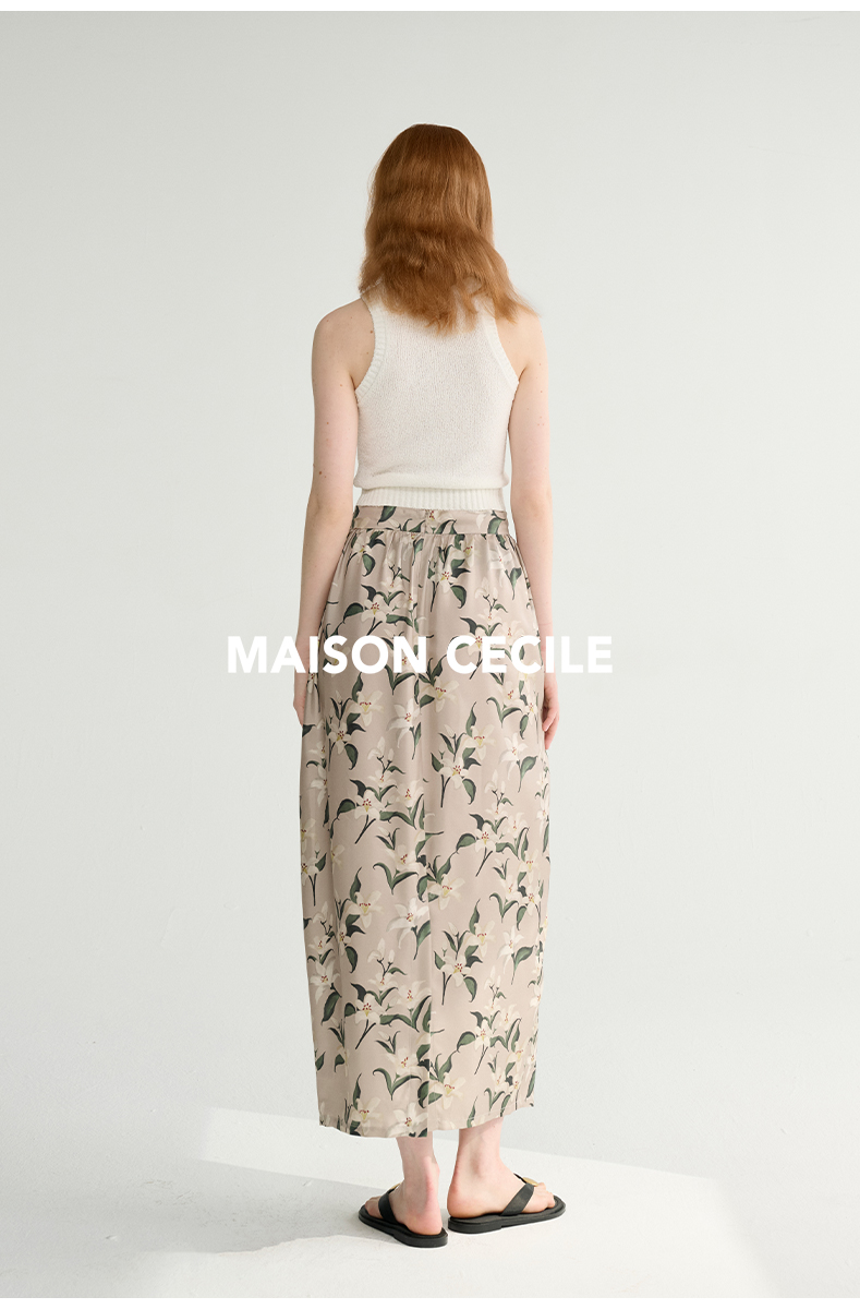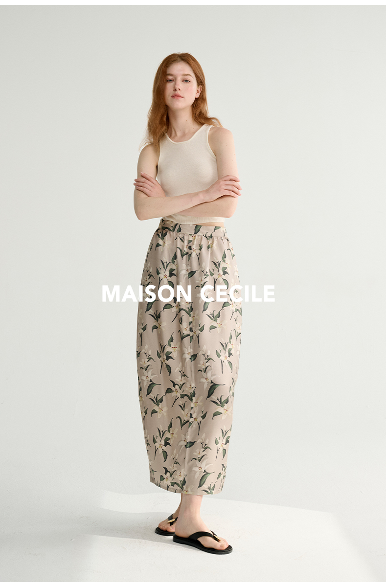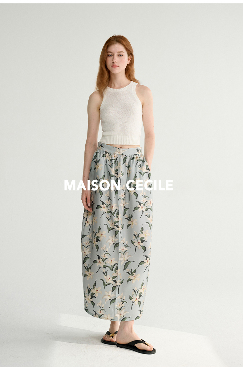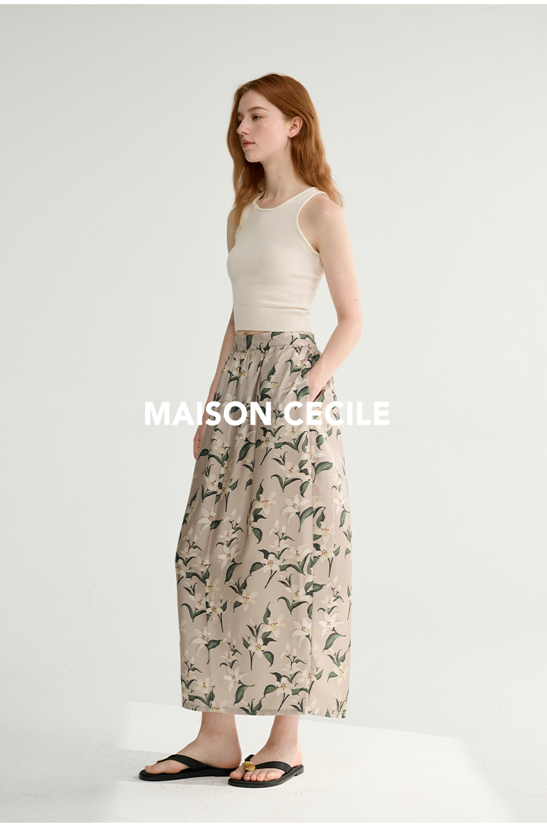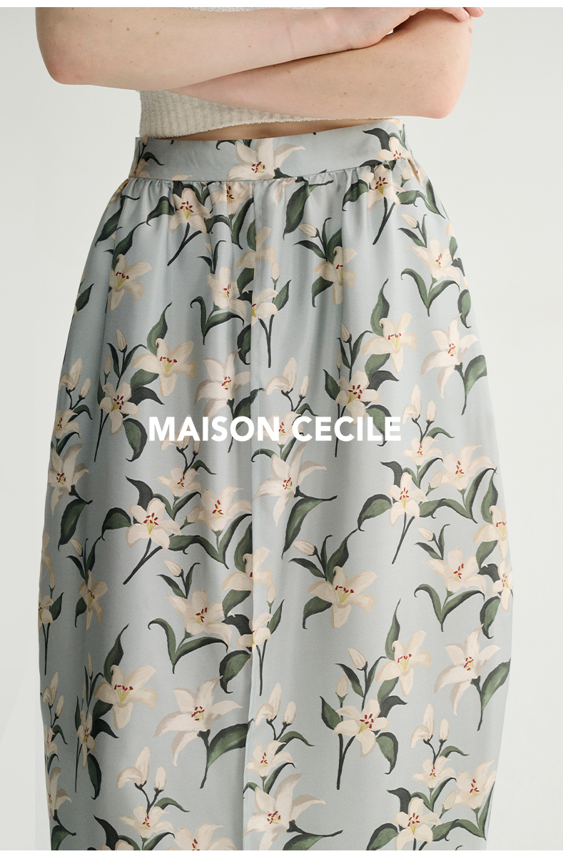 MAISON CECILE设计师印花/桑蚕丝优雅手绘百合蓬松立体感花苞半裙
