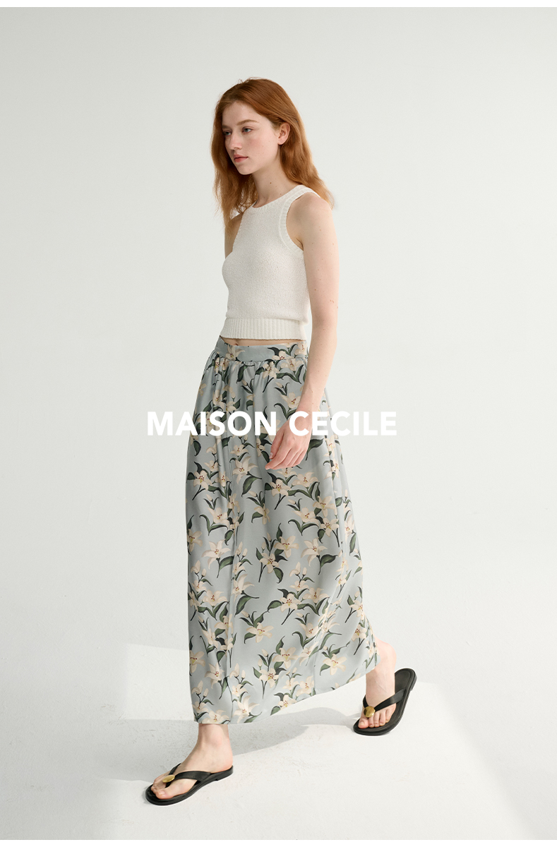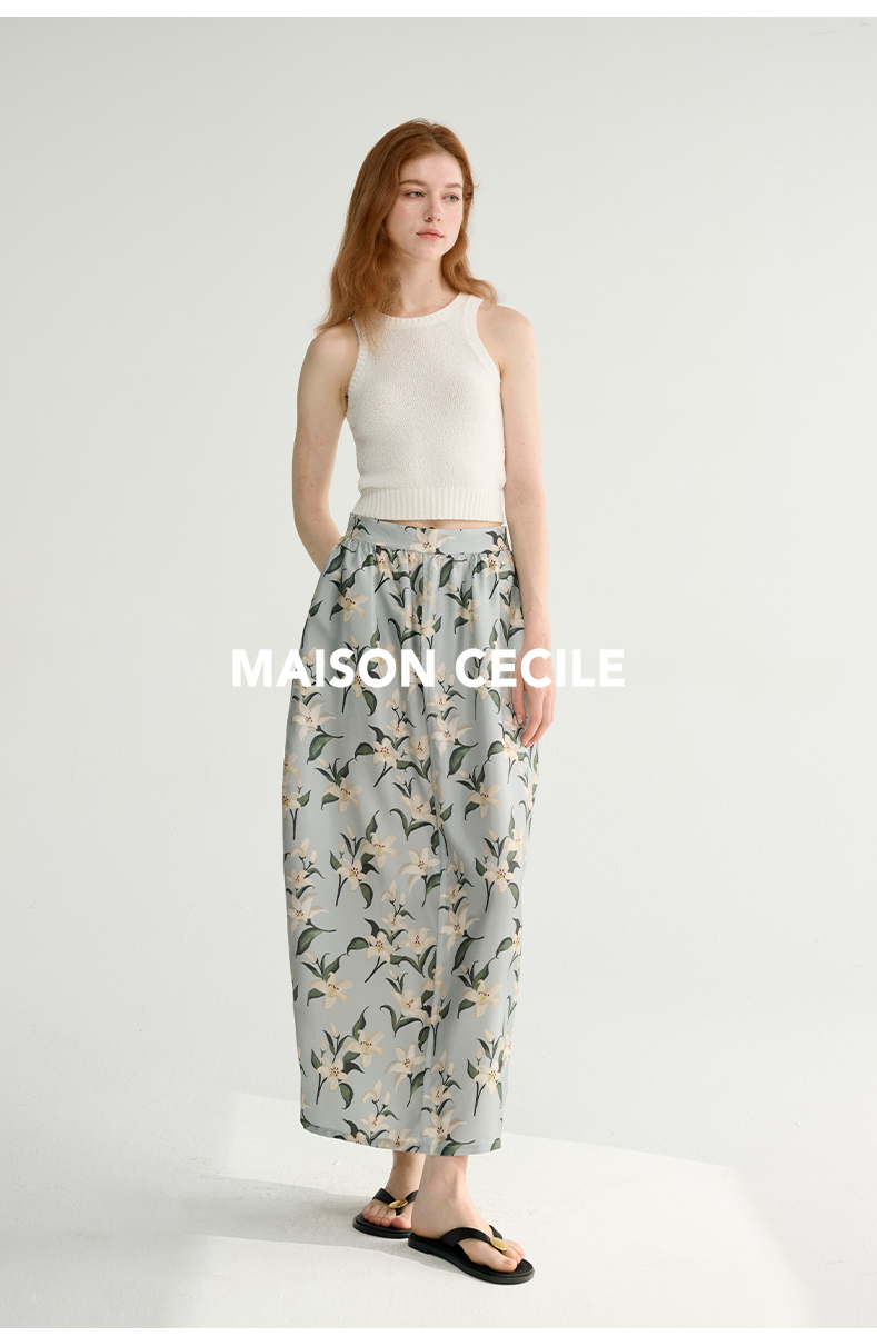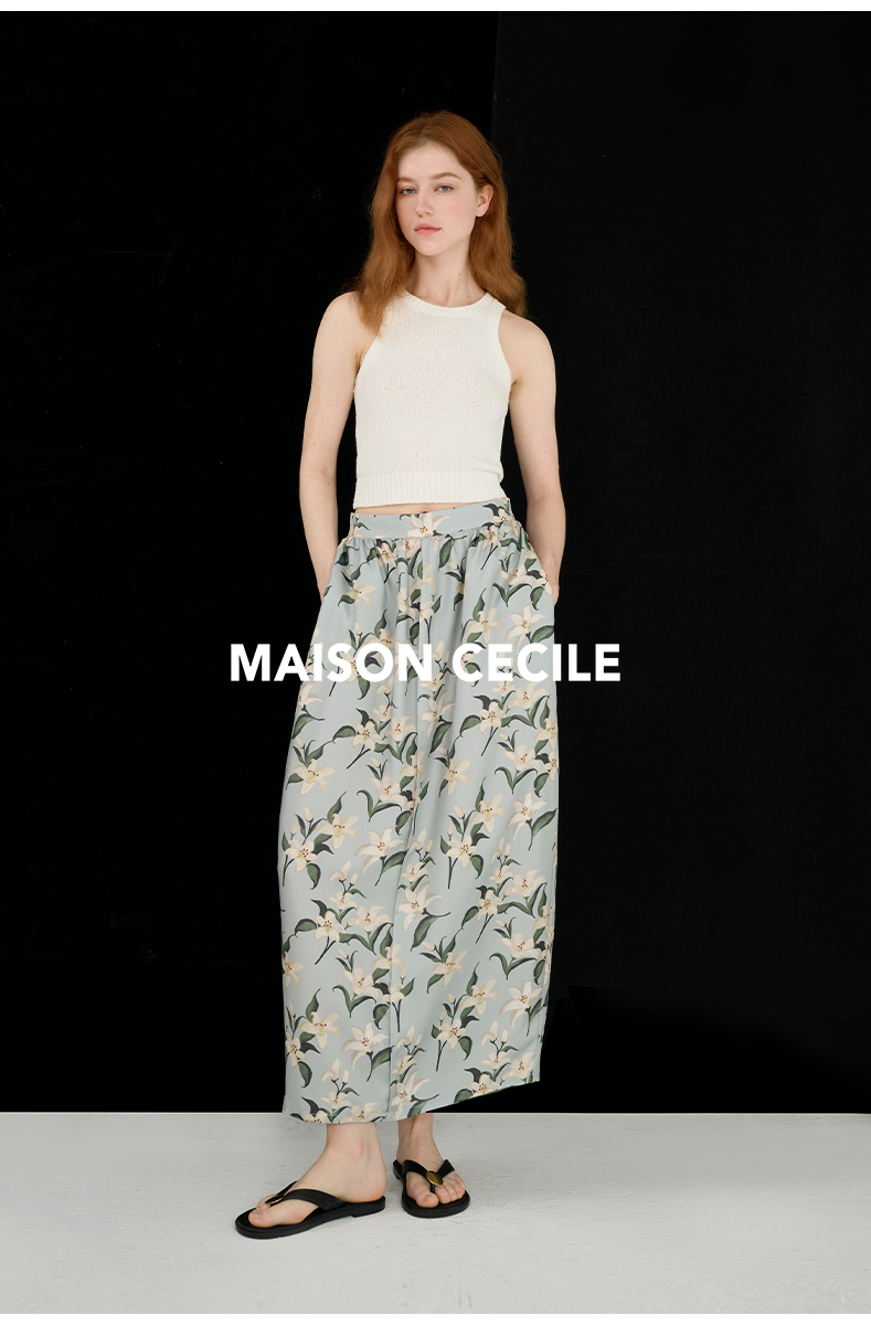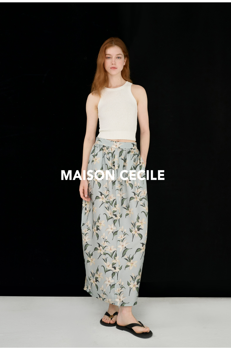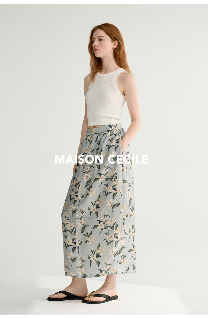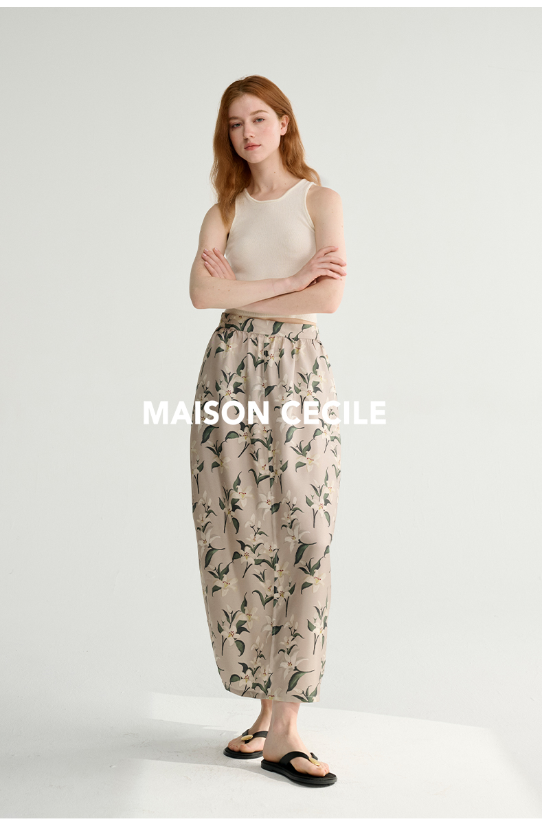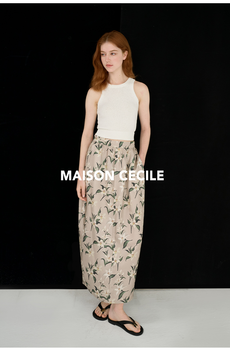 MAISON CECILE设计师印花/桑蚕丝优雅手绘百合蓬松立体感花苞半裙
