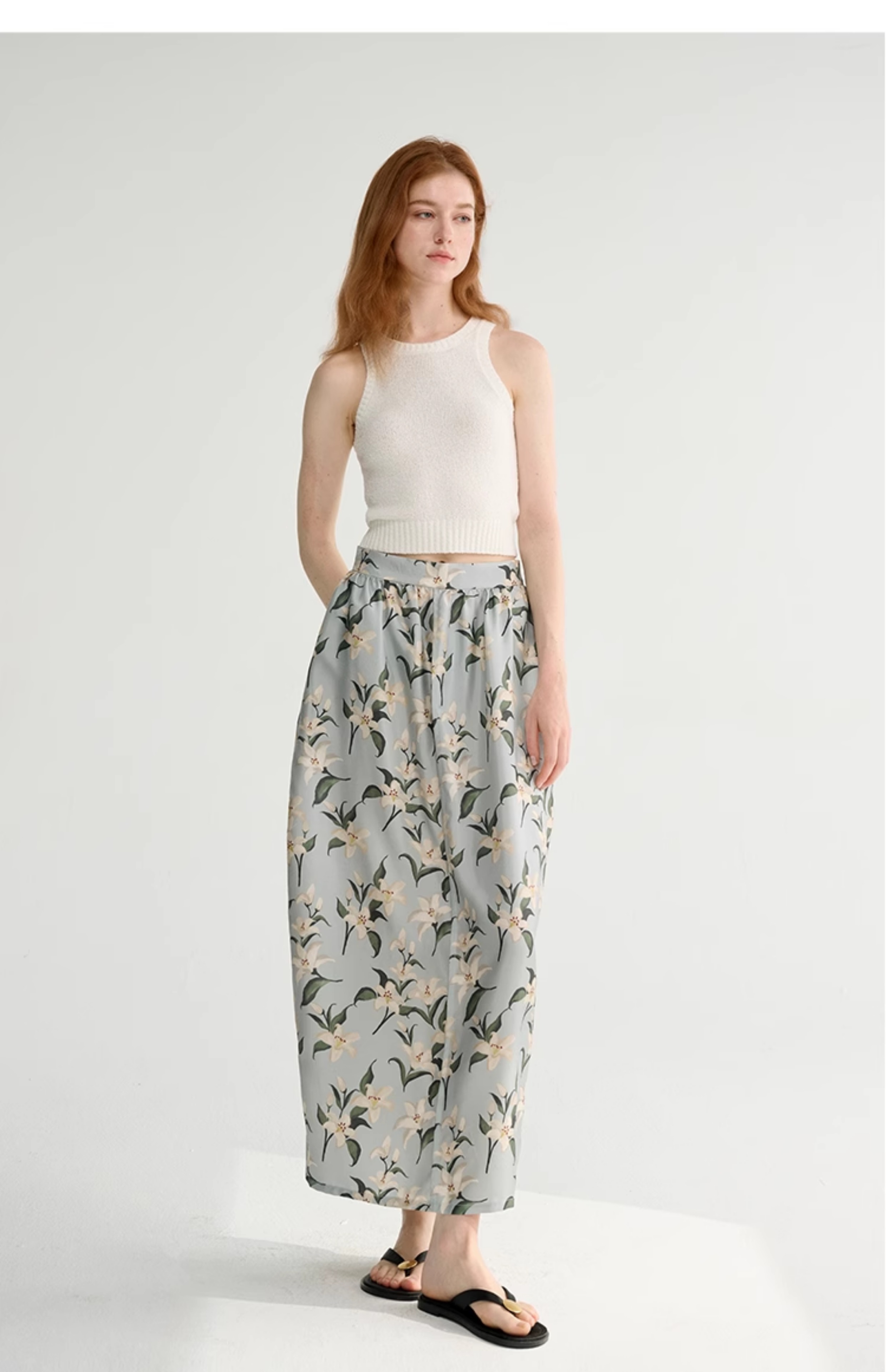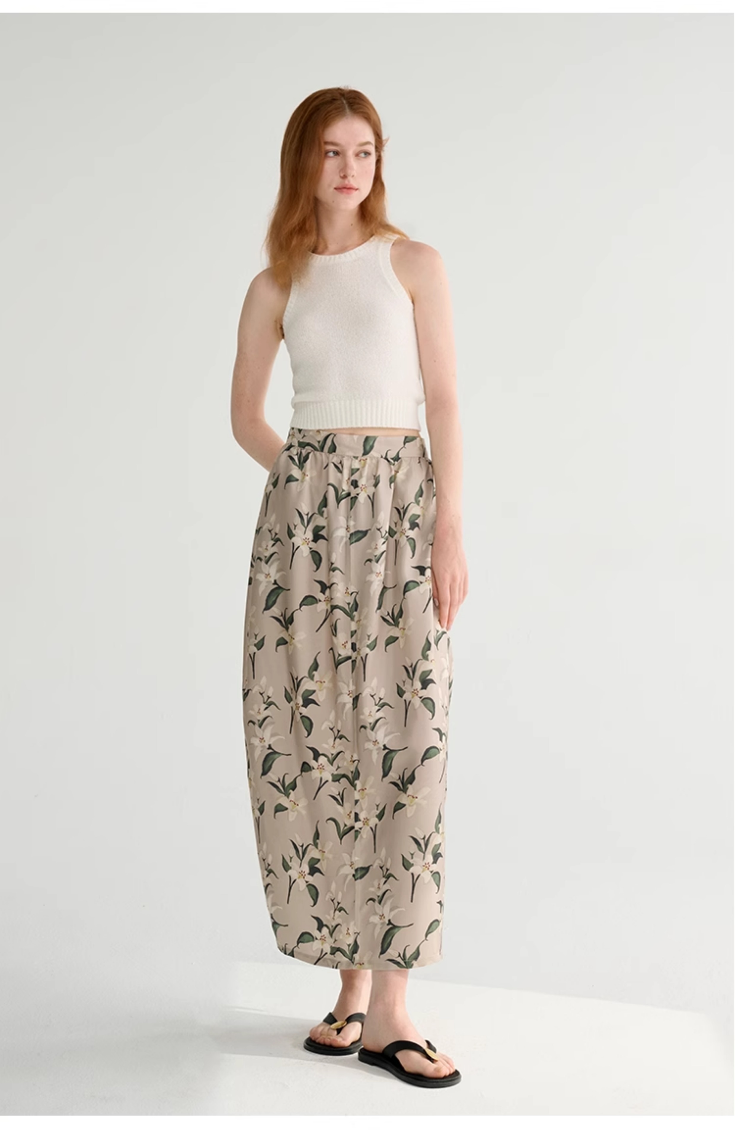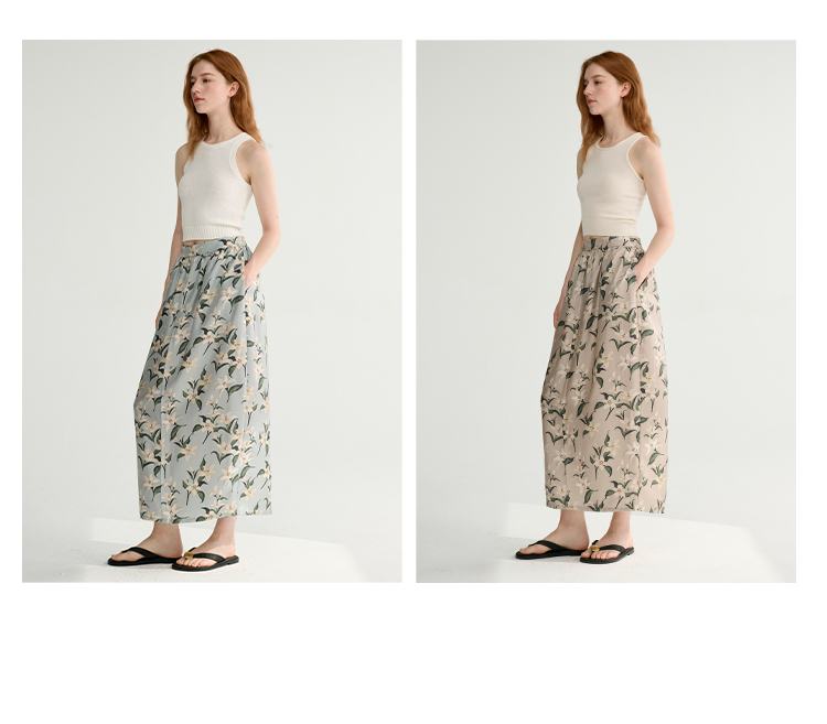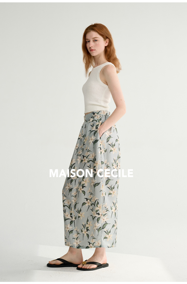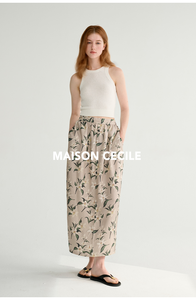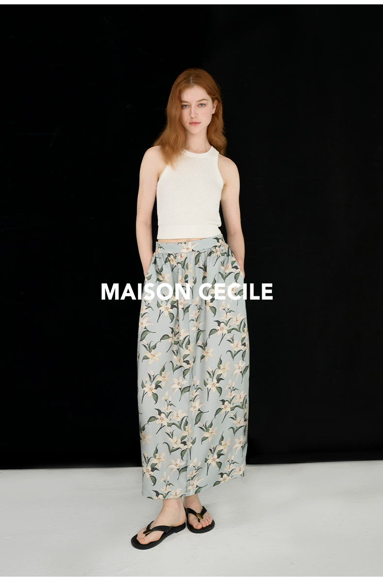 MAISON CECILE设计师印花/桑蚕丝优雅手绘百合蓬松立体感花苞半裙