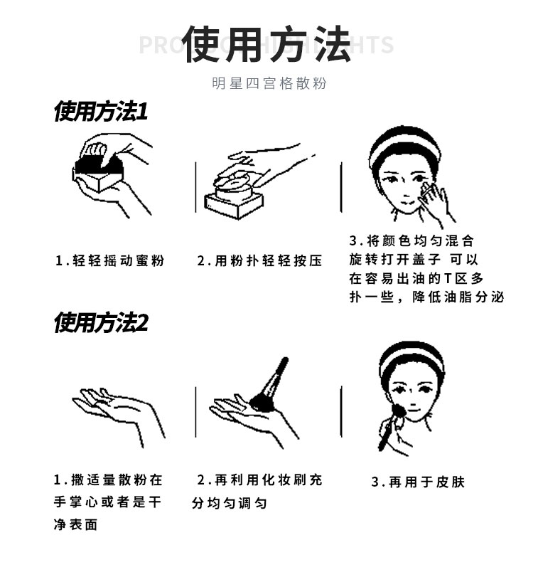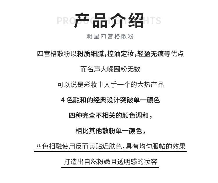 1、独特的四宫格设计,世界上第一款同时有四个颜色的散粉,每种颜色都能对皮肤产生不同的美肤功能——其中2个颜色用来修饰瑕疵(紫色、绿色),另外2个颜色可以提亮肤色(蓝色、白色)