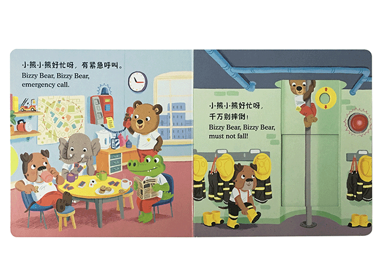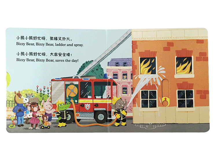 《小熊很忙(升级版):小小消防员》为全新超厚白卡纸升级版,有趣好玩的故事配上丰富的互动机关,宝宝用小手推一推、拉一拉、转一转、滑一滑,就能看到意想不到的惊喜,既锻炼了小手的灵活性,又鼓励宝宝主动探索。扫描封底二维码,即可跟随专业外教磨耳朵、学发音。朗朗上口的中英歌谣,打造浸入式阅读环境,从小培养宝宝的英文语感。这本书让宝宝有机会从“玩”中去探索世界,体验身边不同的生活和职业。