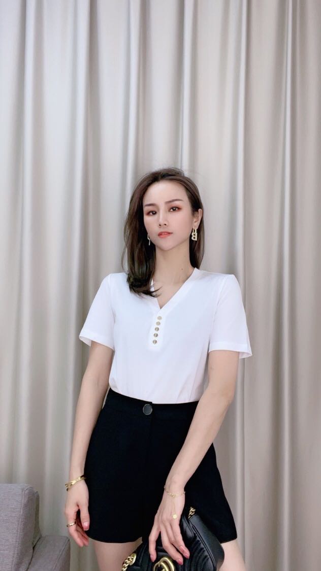 常规简约款,Ⅴ领的T恤时尚又好看,让你脸型装饰得更精致纤细,裸露的锁骨俏皮又撩人,纯色百搭不挑人的款式,微弹双丝光棉+金属钮扣的点缀更显你的品味!