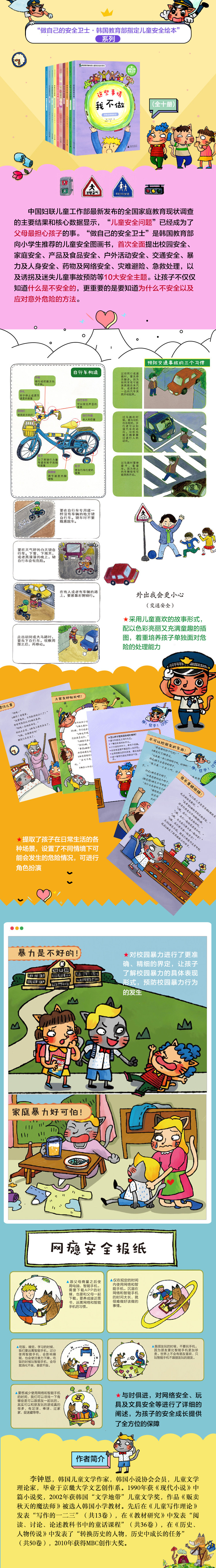 | 中国妇联儿童工作部*发布的全国家庭教育现状调查的主要结果和核心数据显示,“儿童安全问题”已成为父母关心的重点。“做自己的安全卫士”是韩国教育部向韩国小学生指定的安全教育绘本,涵盖了少年儿童在生活中常见的10大安全主题,包括校园安全、家庭安全、食品安全、药品安全、网络安全、交通安全、人身安全等。本书通过一个个有趣的故事,配以色彩亮丽又充满童趣的插图,还原了多种生活场景,讲述了在不同环境下需要重视的安全问题,让读者在阅读本书时,树立安全意识,将安全知识牢记于心,平安成长。 |