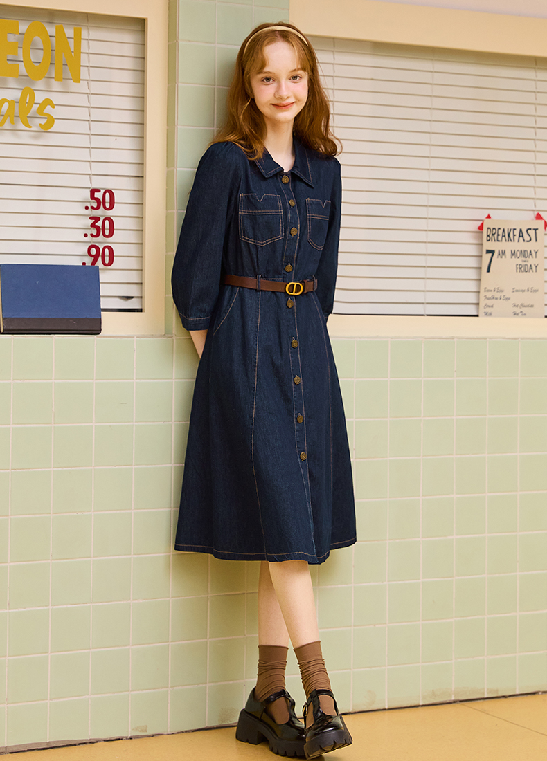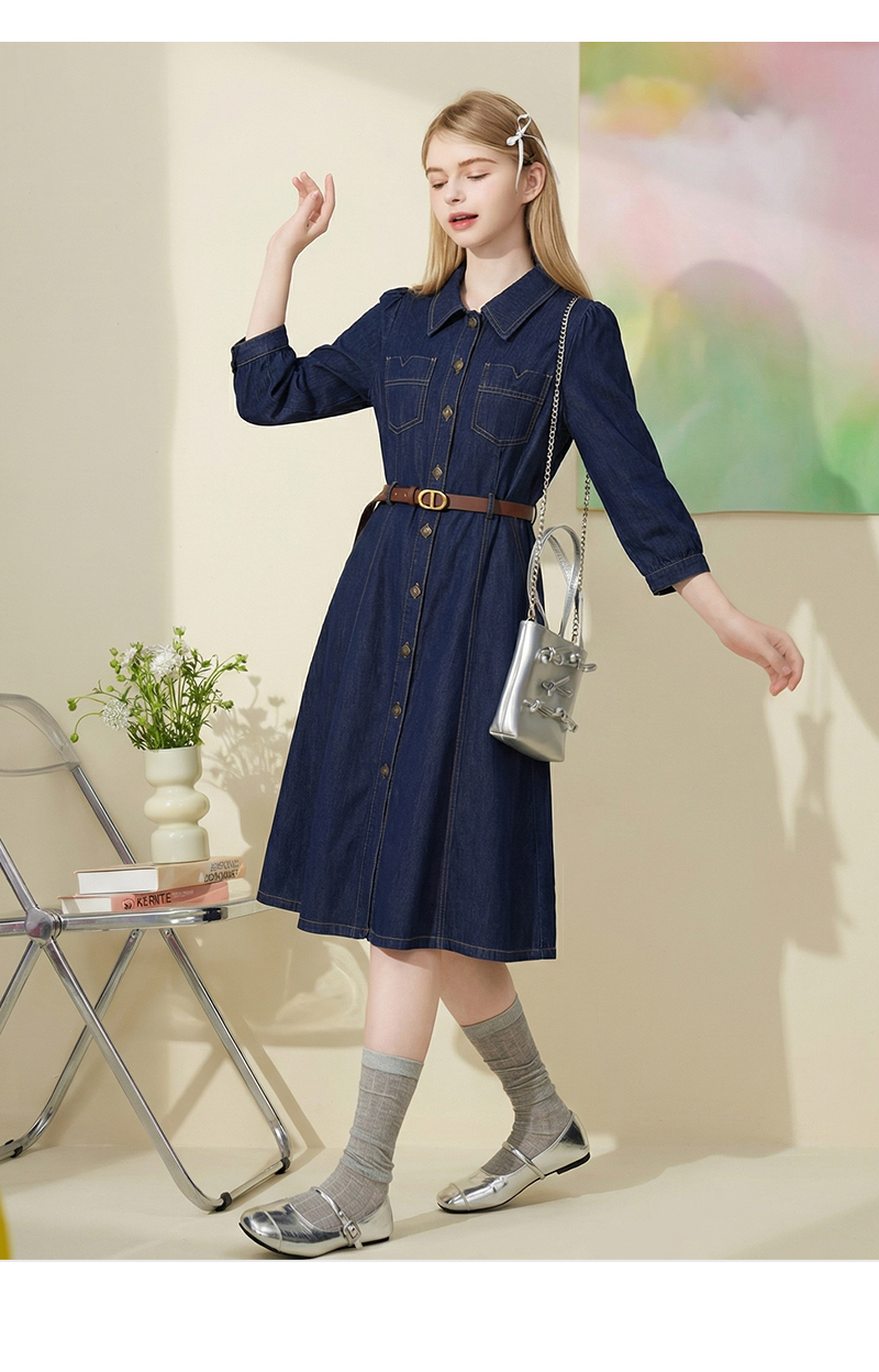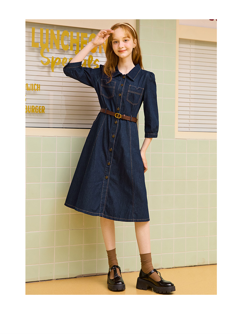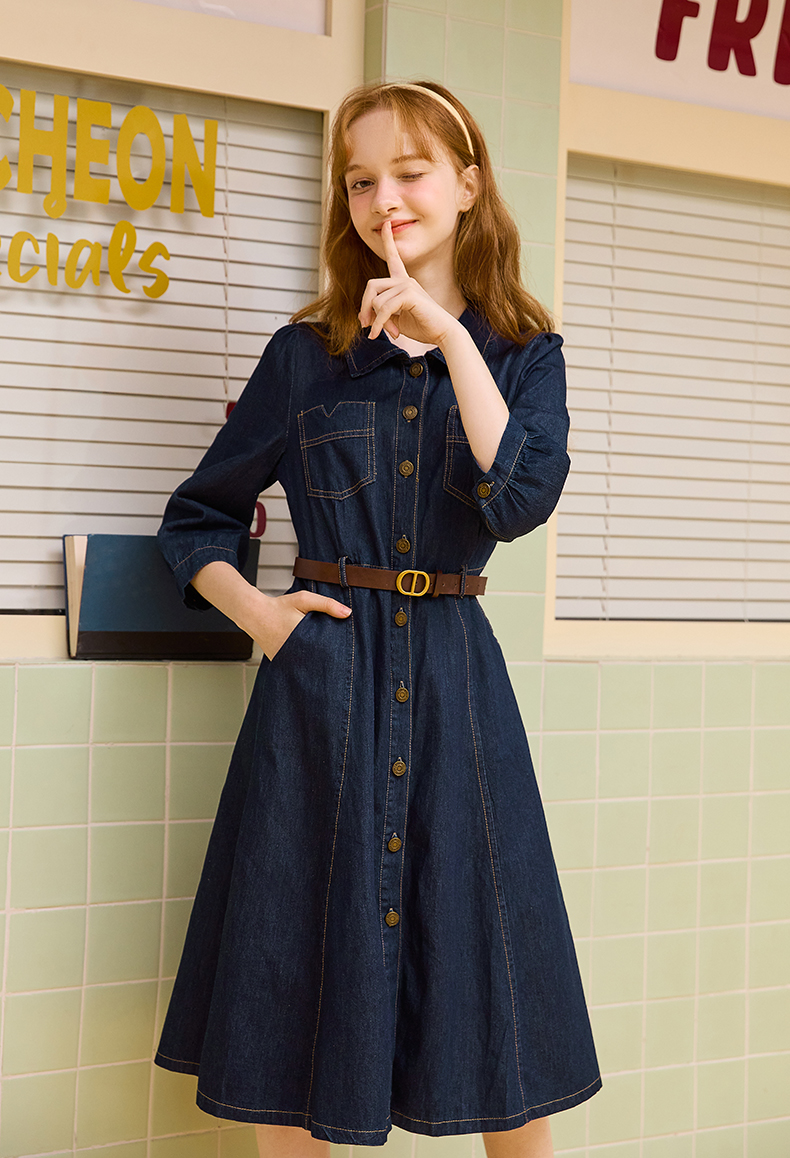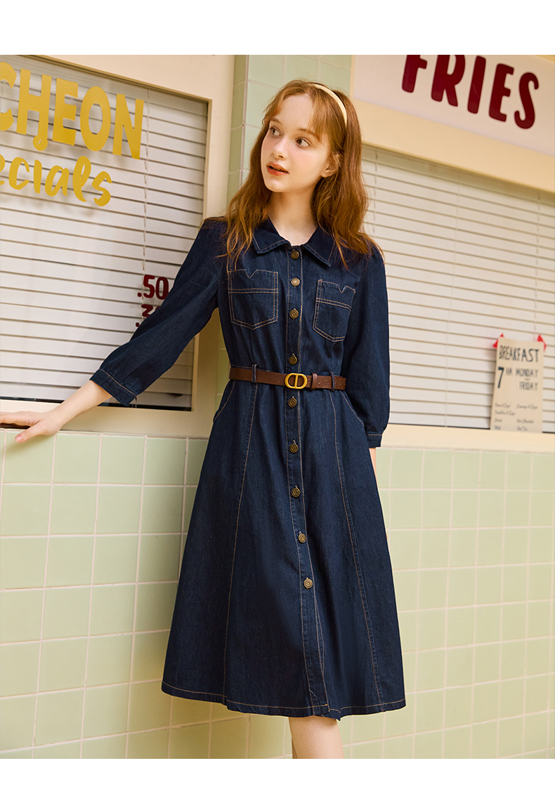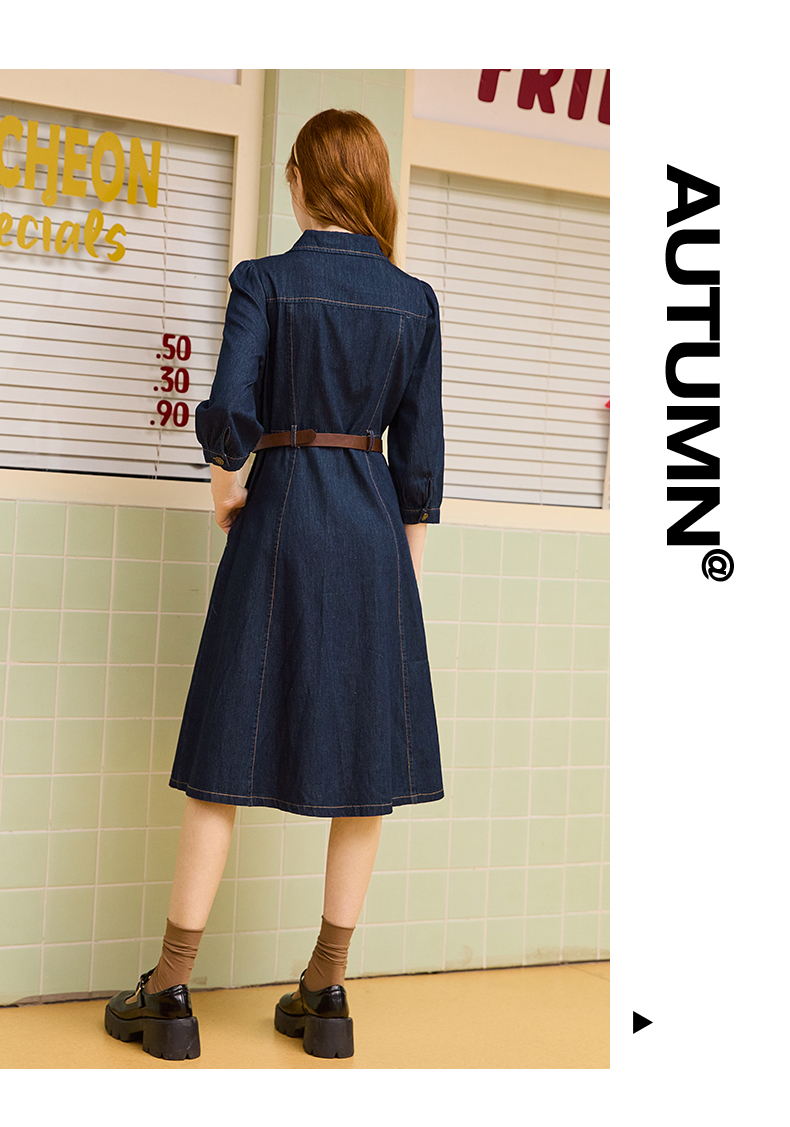 mc2牛仔连衣裙女秋2023年春装新款气质显瘦八分袖a字翻领牛仔裙
