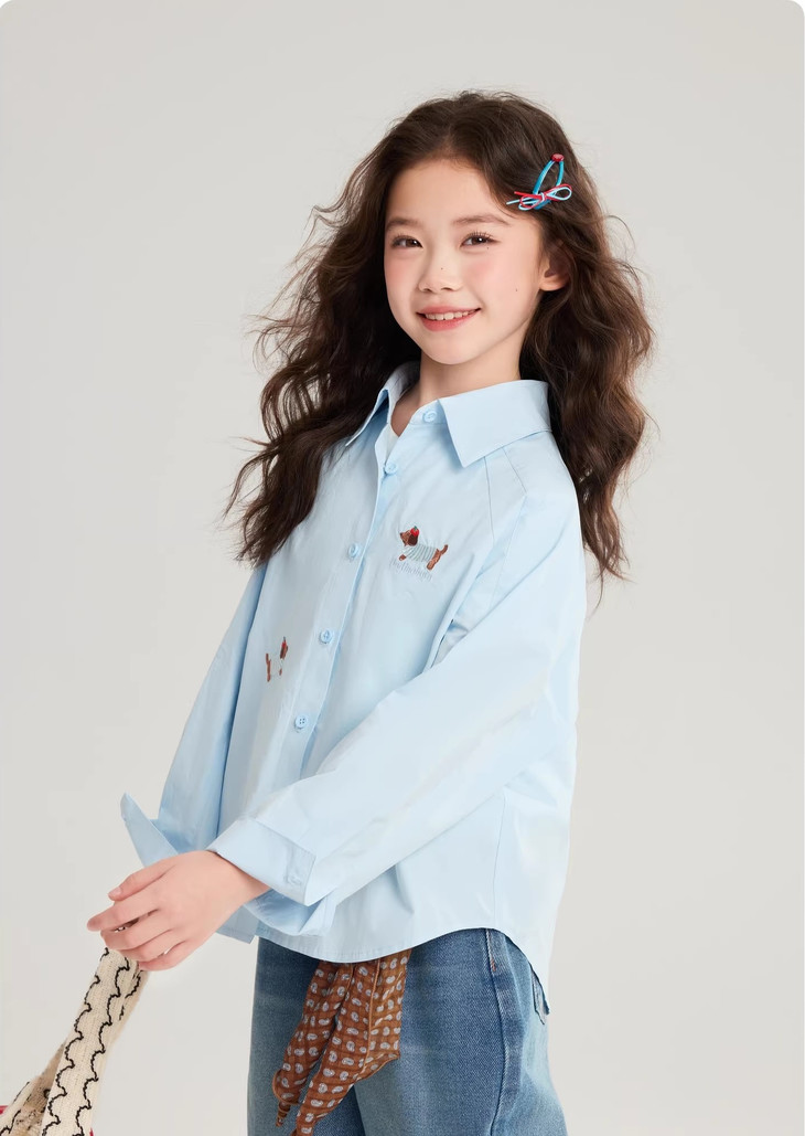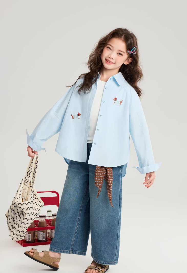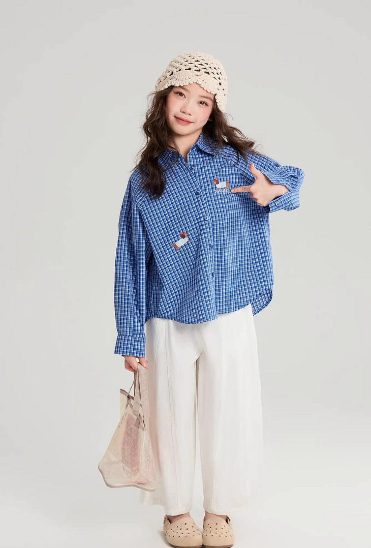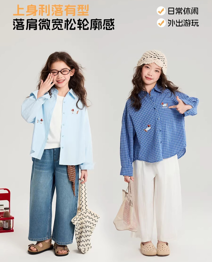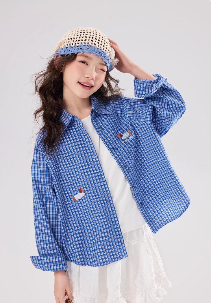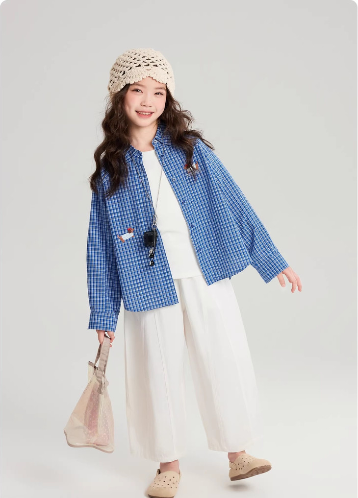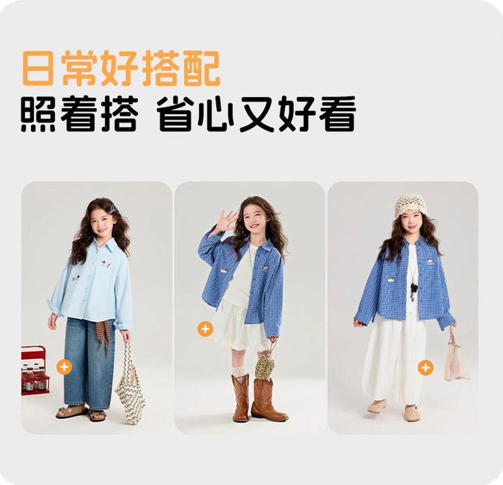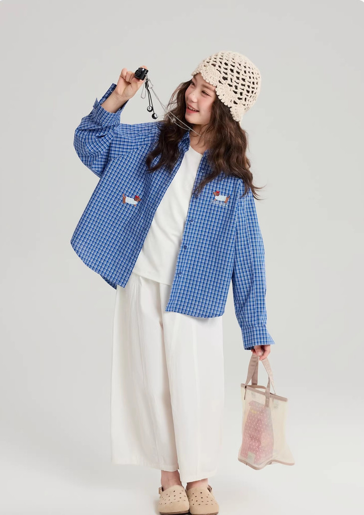 下面再来看这一组超能搭的万能衬衫 20度的天气穿什么衣服❓超喜欢带图案的衬衫 春天的第一件衬衫必须是它🙌 妥妥万金油单品✨时髦拿捏不费力时髦❗ 这款纯色+格纹真的超级超级经典 MiU色系😘 可盐可甜,胖瘦女宝都可以驾驭! 🛑面料采用100%棉,手感厚实柔软亲肤,超级好穿! 软fufu的奶蓝色衬衫,像把春天穿在身上~ 细腻的棉感透气不闷,宽松版型对各种身材都超友好。 小面积的刺绣点缀,让基础款多了几分俏皮可爱,单穿叠穿都好看。 搭配短裙,休闲裤,慵懒氛围感直接拉满! 跑跳玩耍都无束缚,给整套穿搭注入满满的活力感。