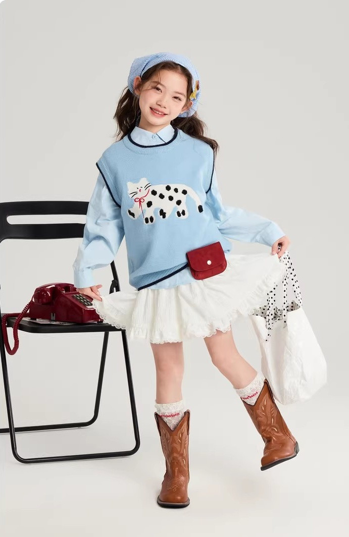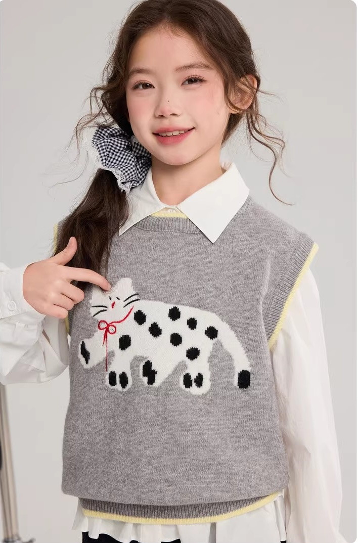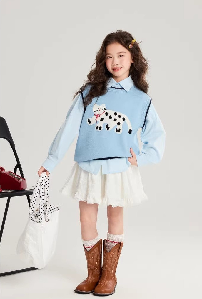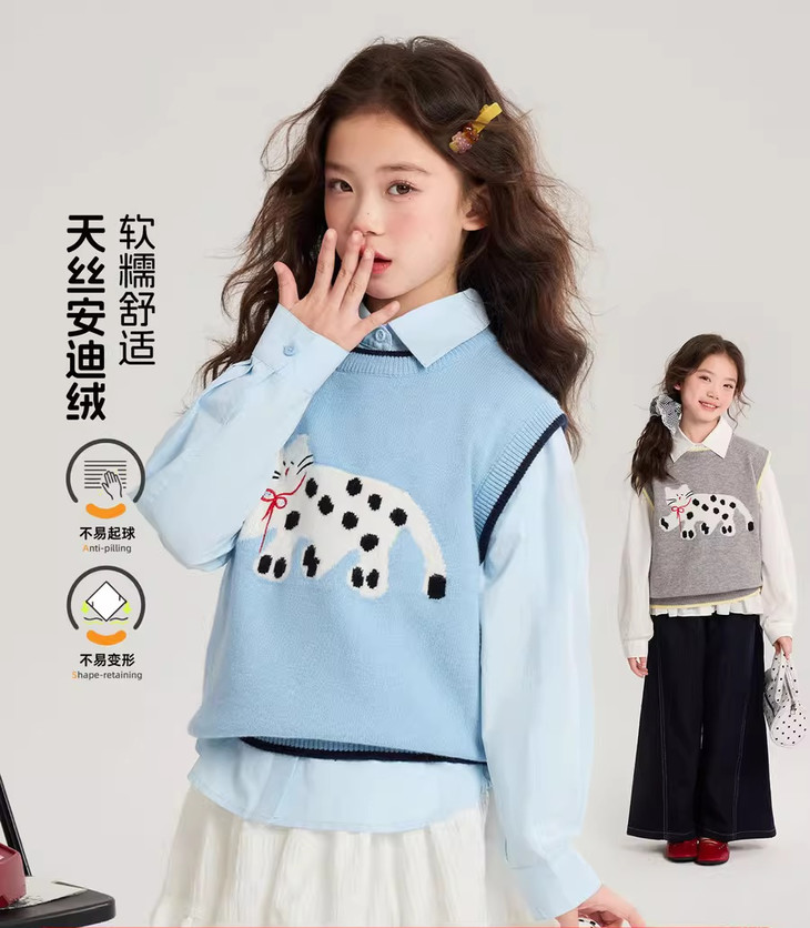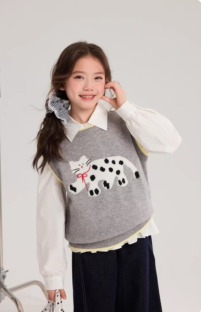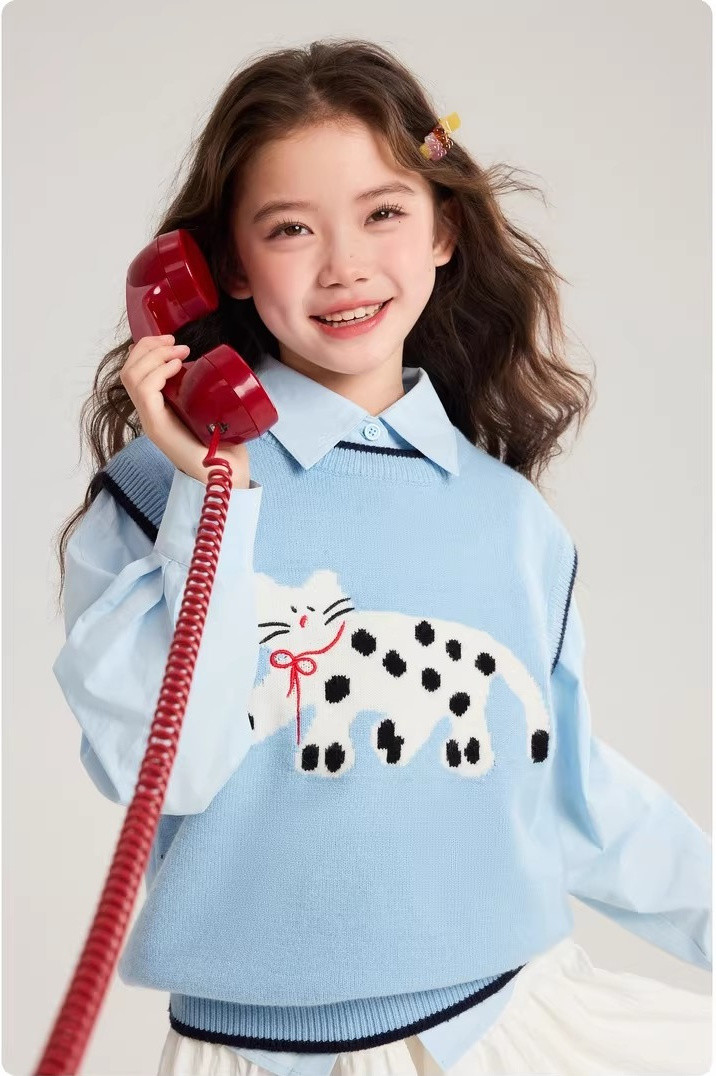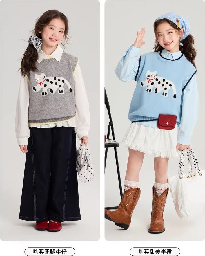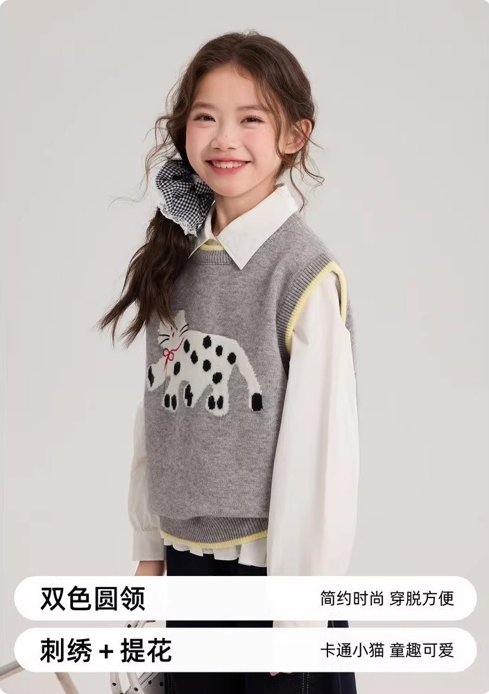 马甲的设计超点睛,宽松版型,搭牛仔裤或小裙子,随性又时尚。 款式非常洋气时尚,买回去可以套装穿 也可以另外搭配,非常实穿,性价比很高👍 拍照、庆生、踏青都穿的着👍 120-170 码全搞定 从幼儿园到小学都能找到本命 size👧 一键解锁春日限定童话感!👇 猫咪背心采用绵羊绒材质,柔软细腻 经典的圆领设计,简约大方 蓝色/灰色大身搭配卡通猫咪图案的设计 使这件背心简约又特别 领口袖口和下摆撞色设计,增添童趣与温馨 可爱的猫咪图案不仅为整体造型增添了一抹童趣 它憨态可掬的状态还能带来温暖和快乐。 搭配半裙或者长裤, dou能让穿搭出彩,可爱又阳光