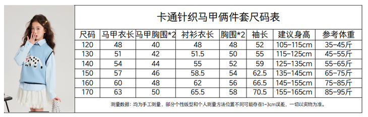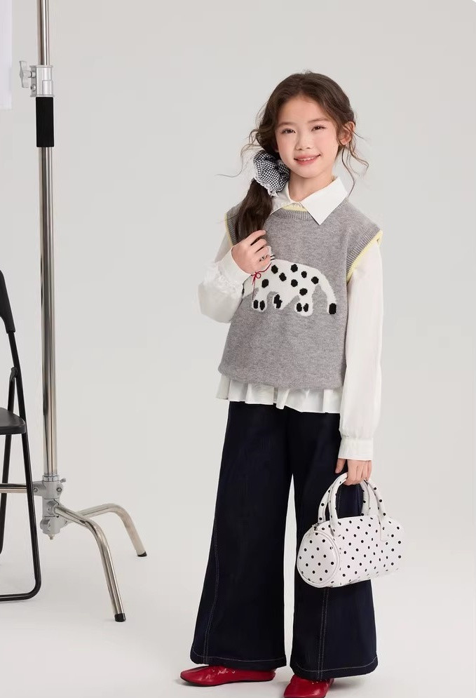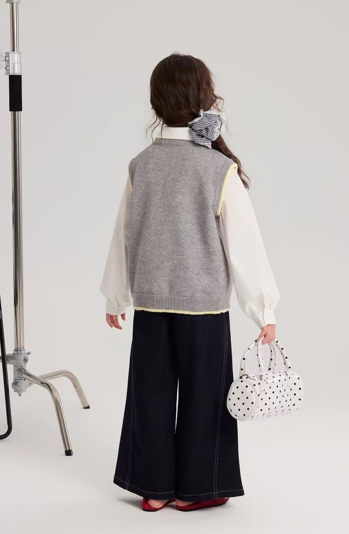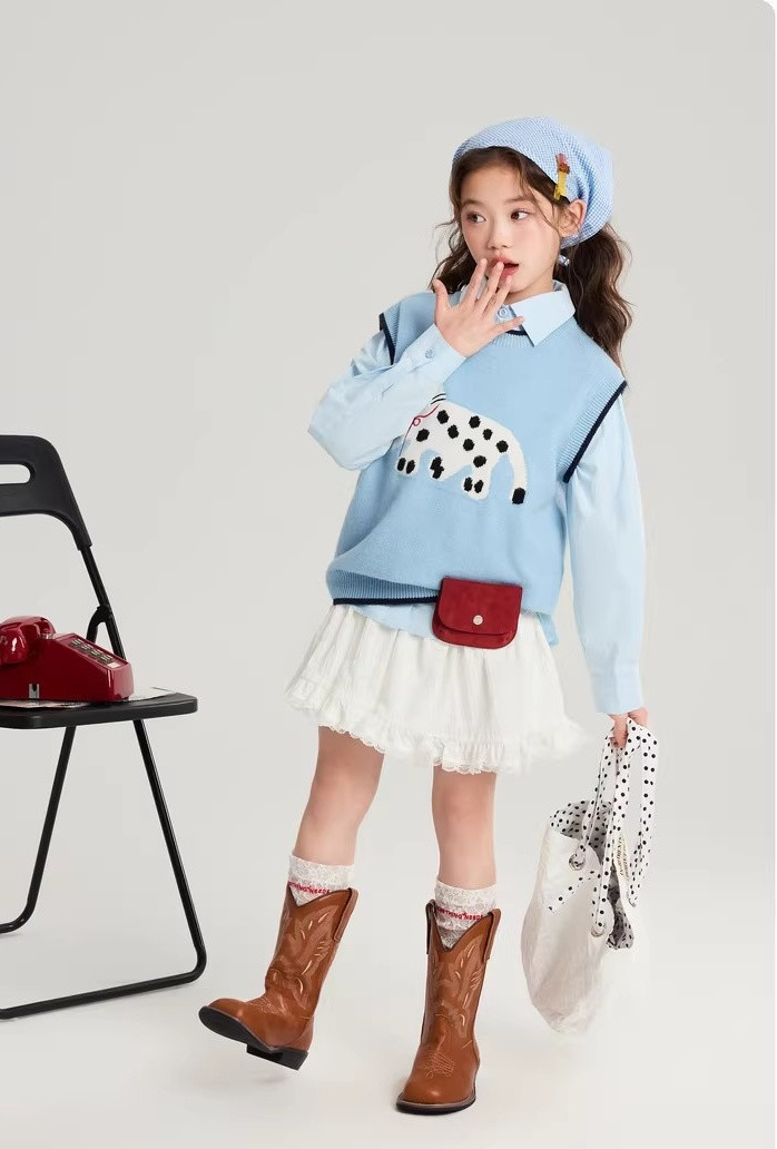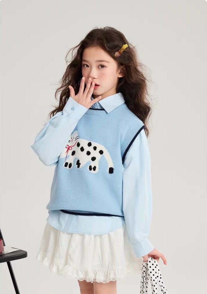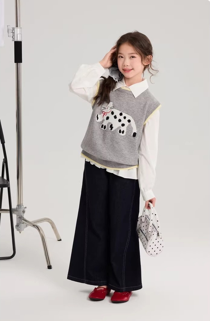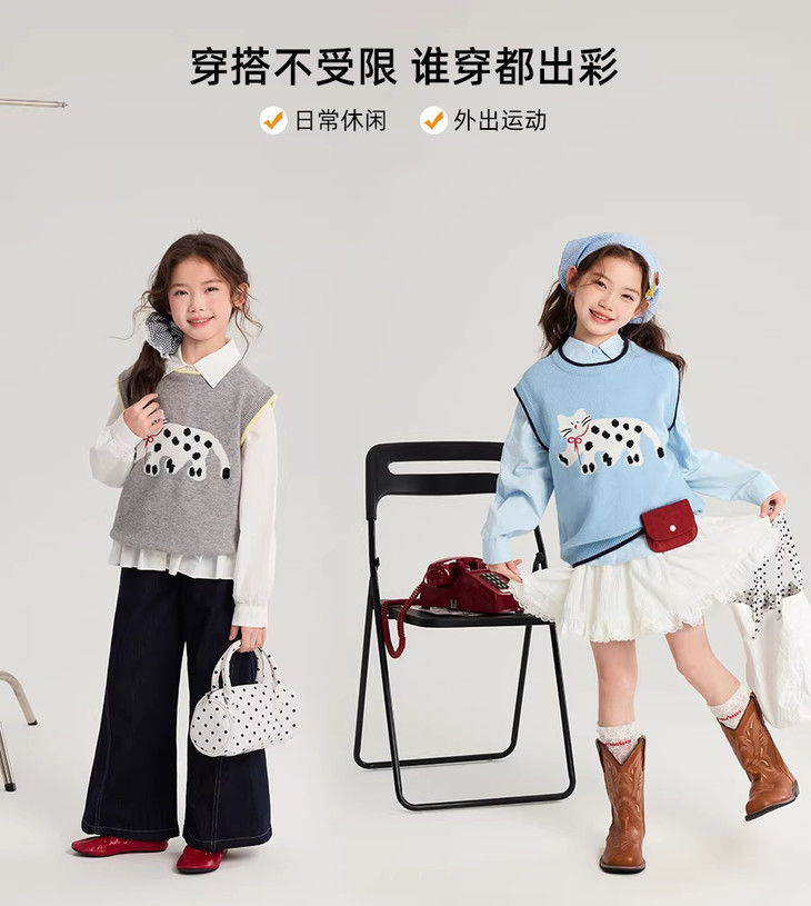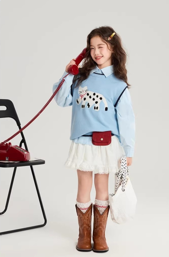 马甲的设计超点睛,宽松版型,搭牛仔裤或小裙子,随性又时尚。 款式非常洋气时尚,买回去可以套装穿 也可以另外搭配,非常实穿,性价比很高👍 拍照、庆生、踏青都穿的着👍 120-170 码全搞定 从幼儿园到小学都能找到本命 size👧 一键解锁春日限定童话感!👇 猫咪背心采用绵羊绒材质,柔软细腻 经典的圆领设计,简约大方 蓝色/灰色大身搭配卡通猫咪图案的设计 使这件背心简约又特别 领口袖口和下摆撞色设计,增添童趣与温馨 可爱的猫咪图案不仅为整体造型增添了一抹童趣 它憨态可掬的状态还能带来温暖和快乐。 搭配半裙或者长裤, dou能让穿搭出彩,可爱又阳光