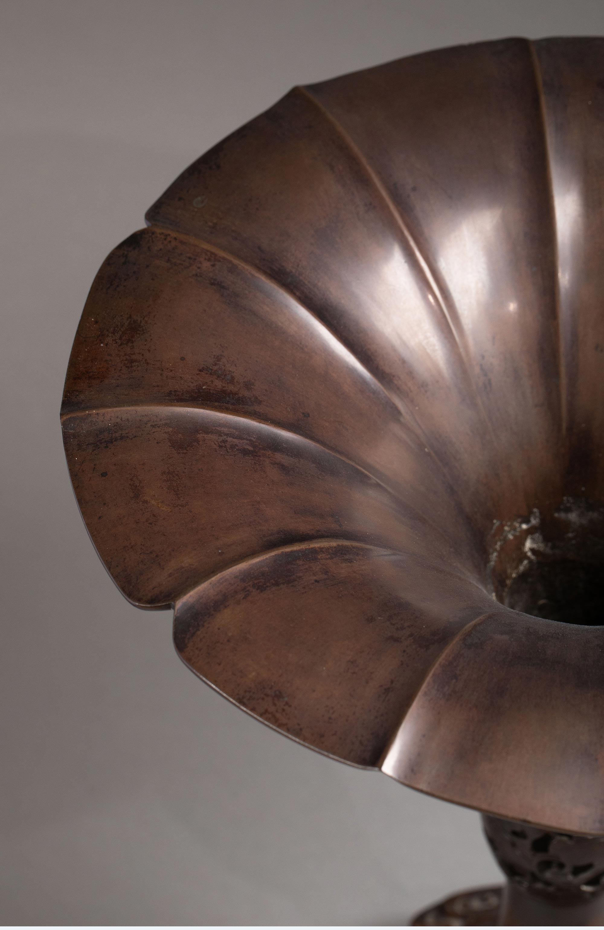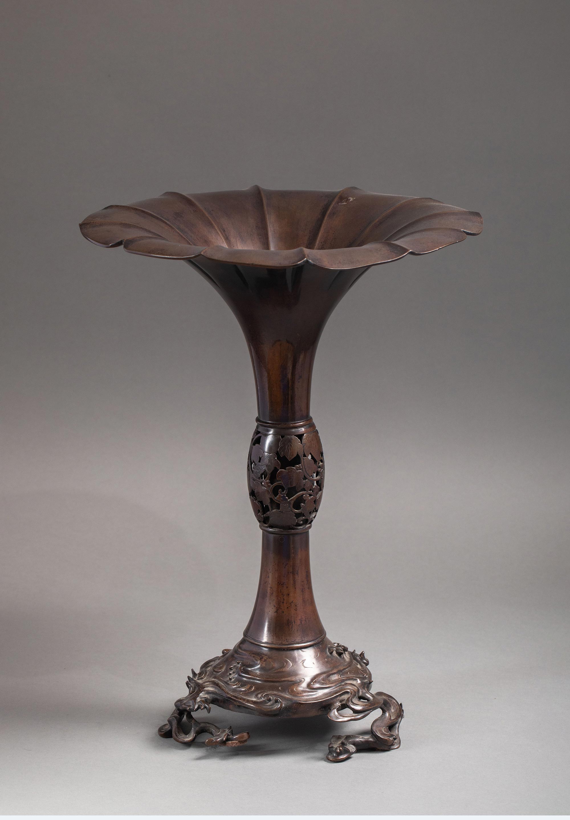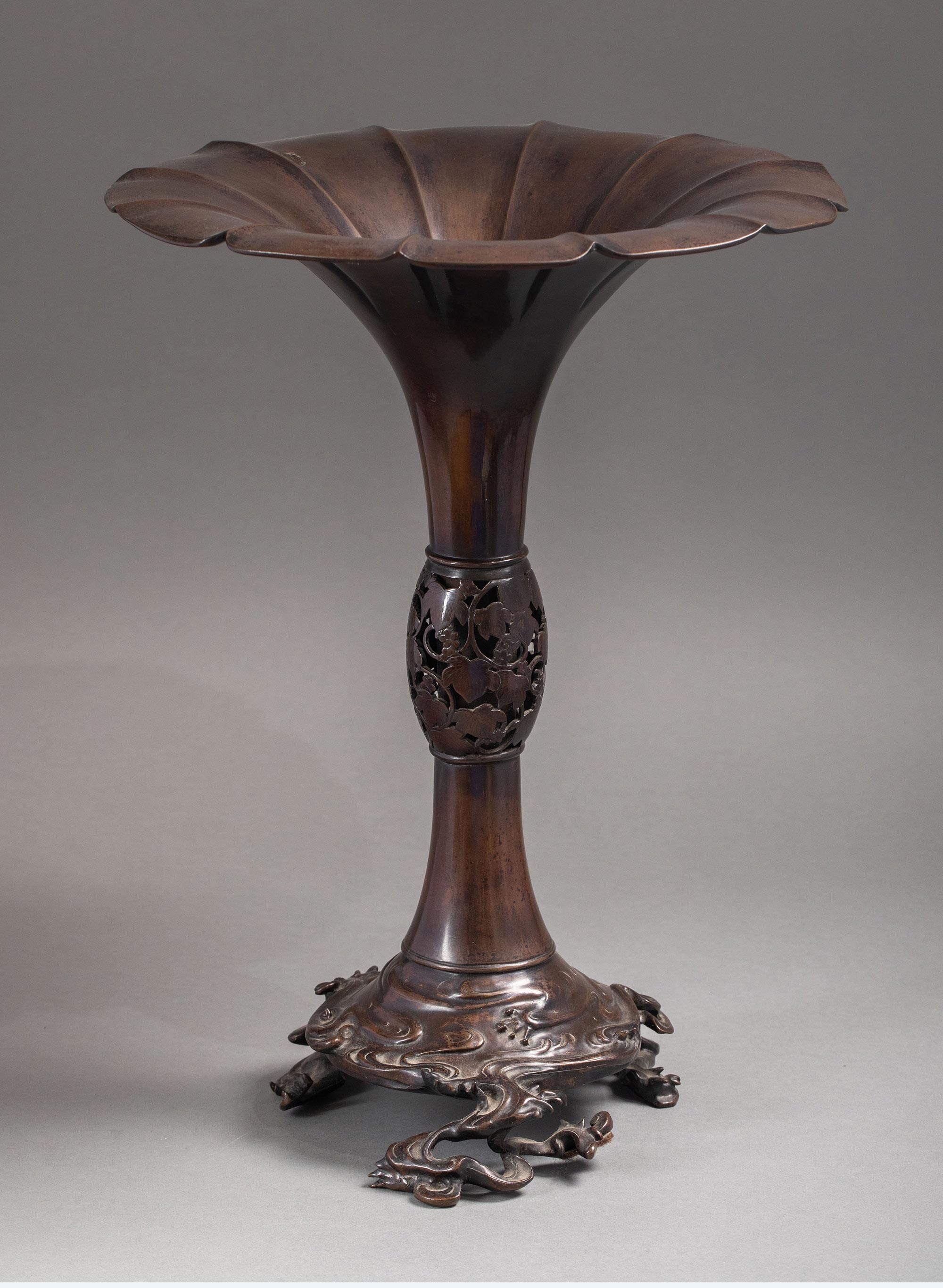 19世纪日本明治时期東都秀光監製签名出品浪涛葡萄主题细颈敞口赤铜精雕花瓶