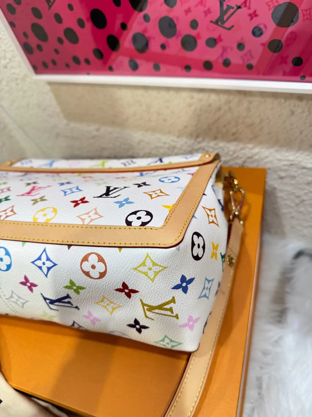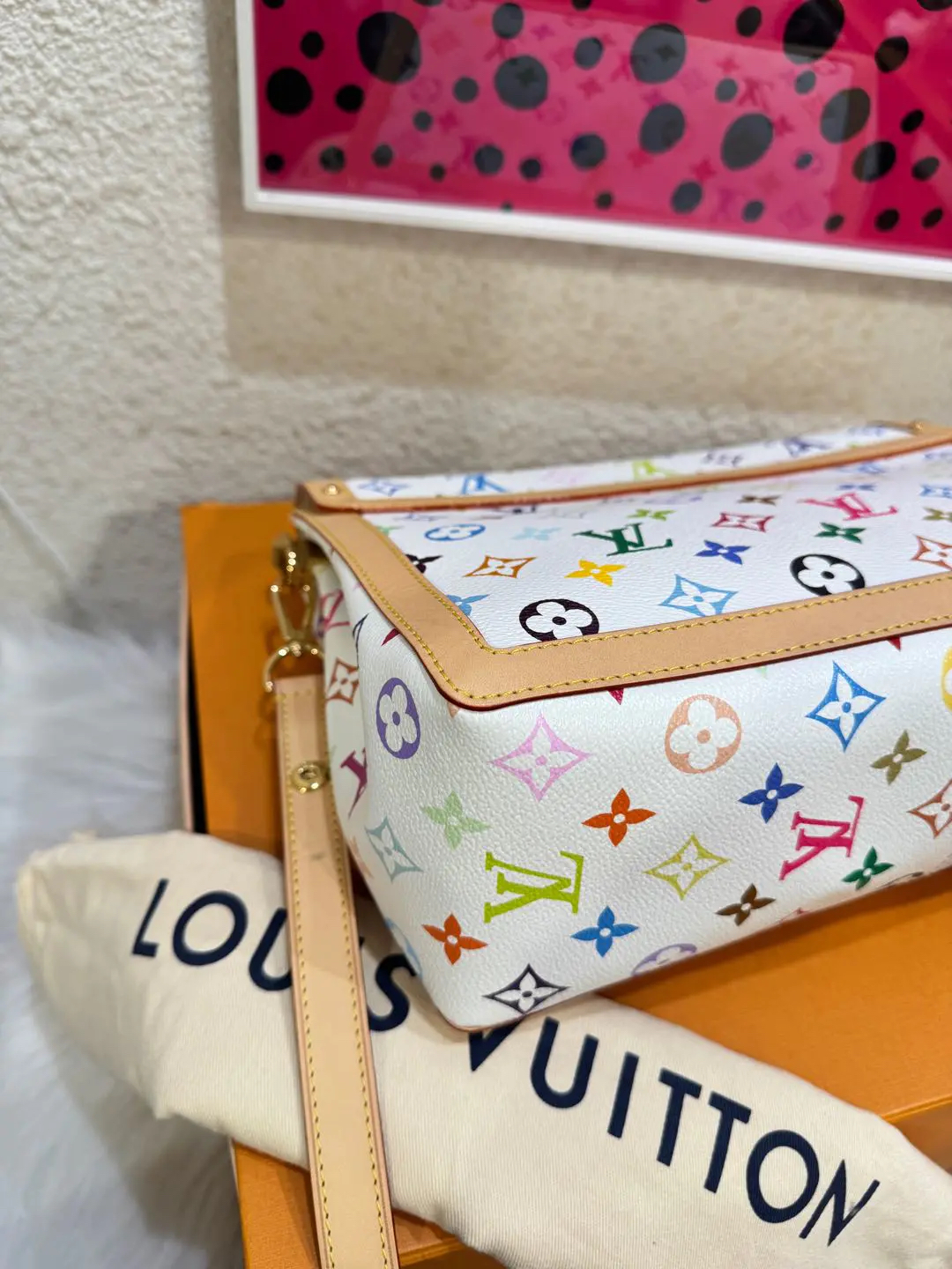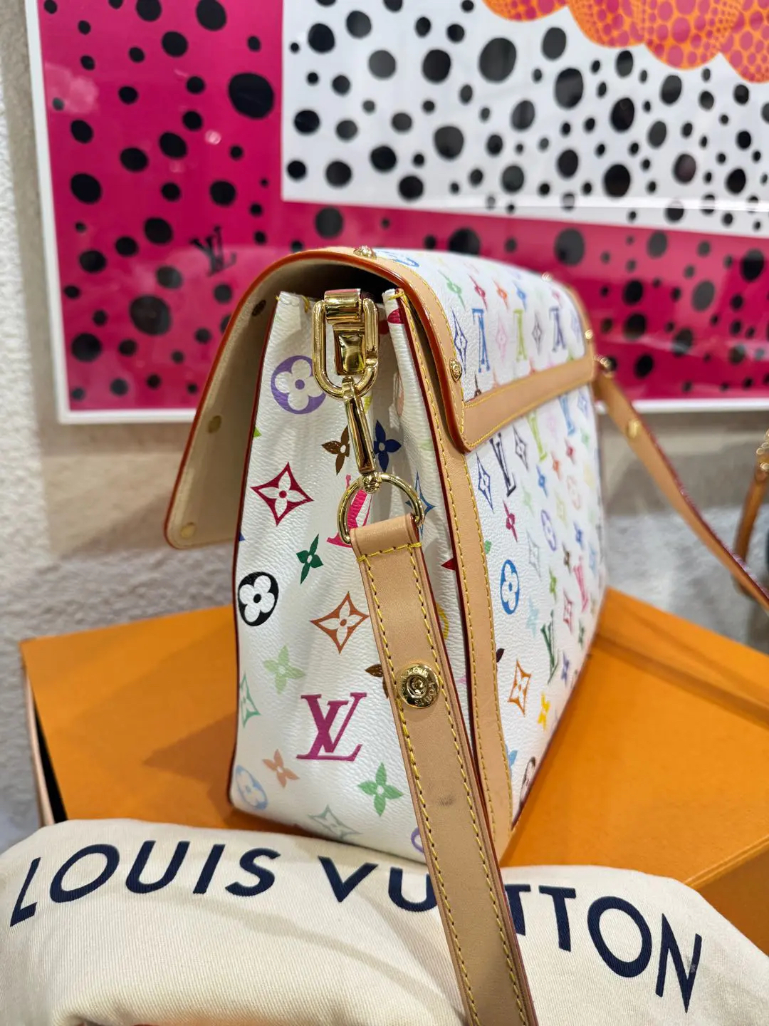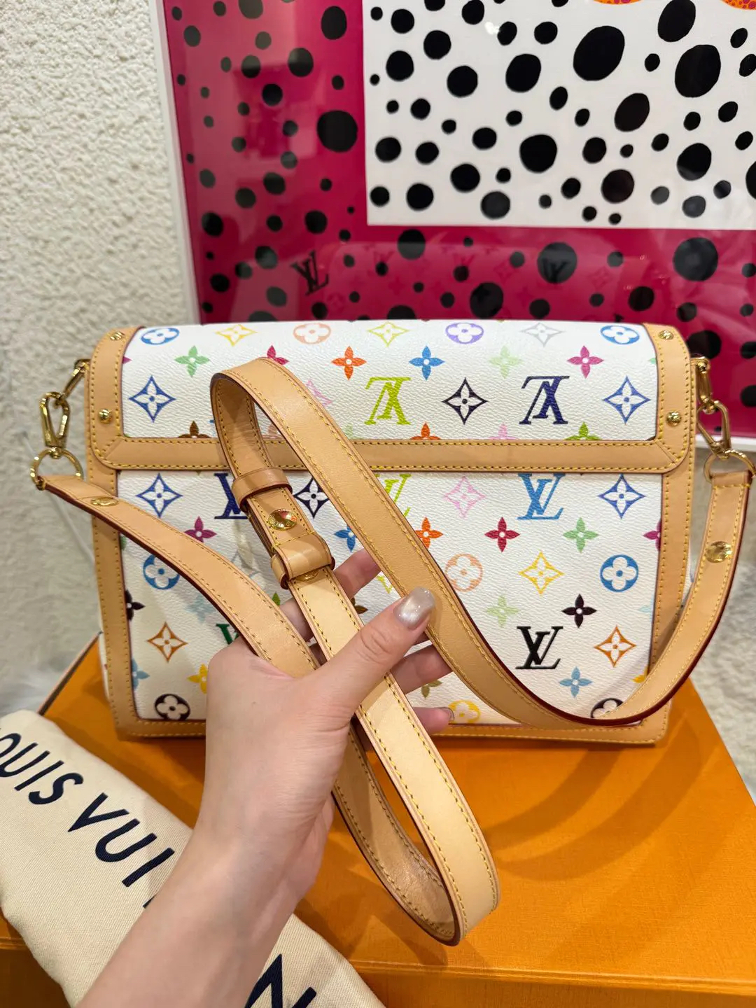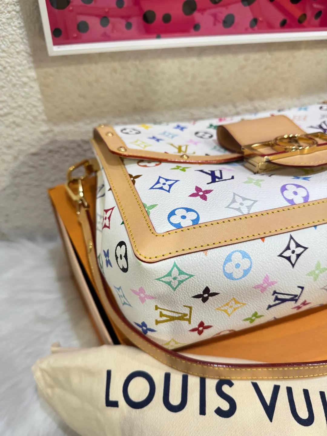 【商品详情】正品二手 LV 达芙妮 大号 白三彩 村上隆联名 斜挎包💗98新 30×22 芯片款 配件:肩带 链条 票 防尘袋 盒子。26年新款 村上隆时隔二十年合作限量款