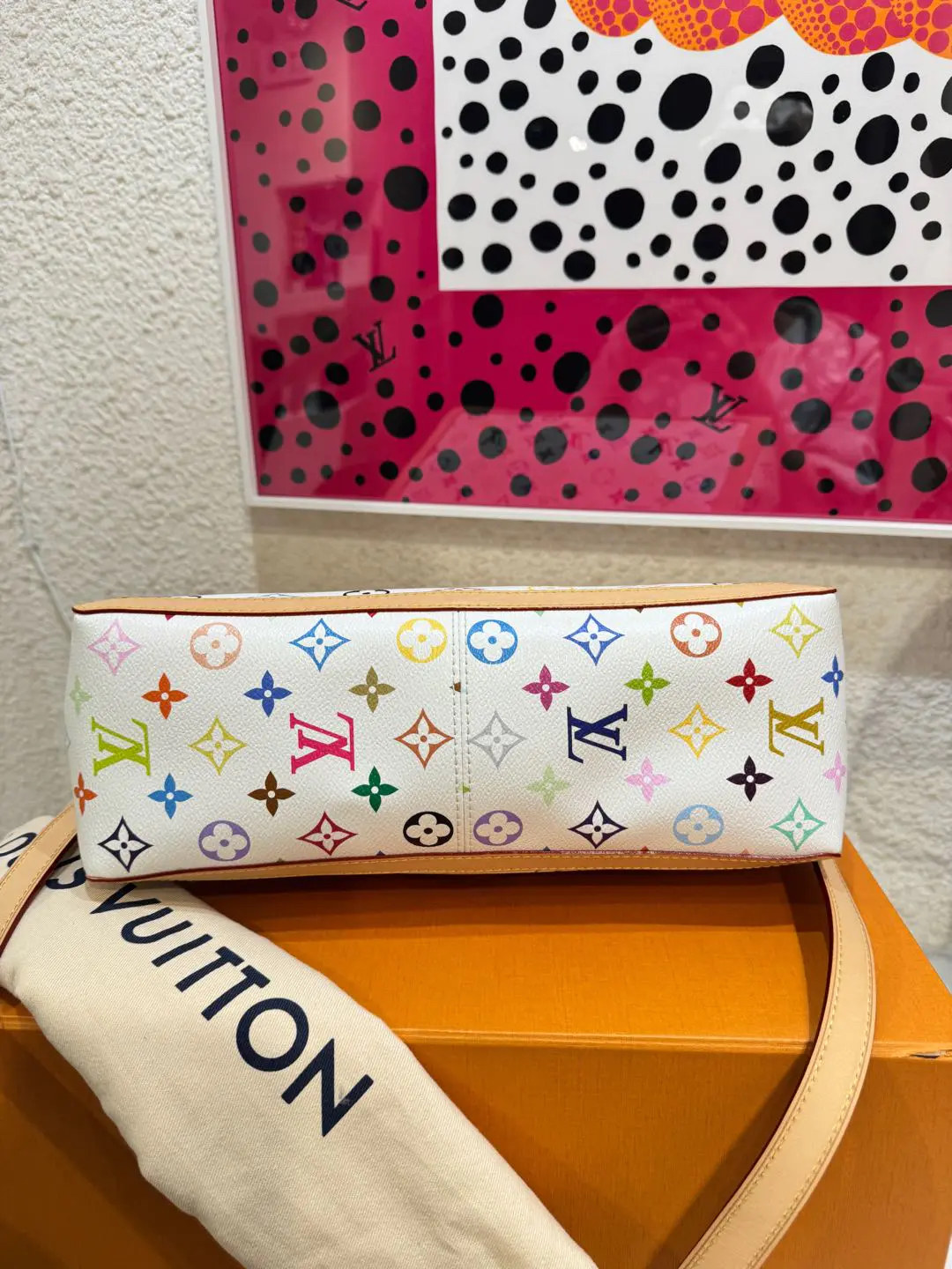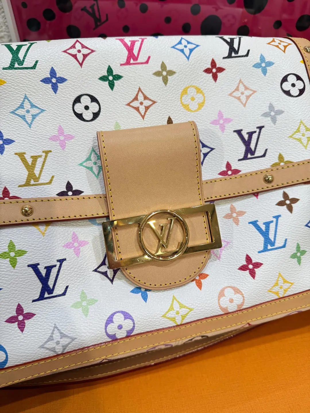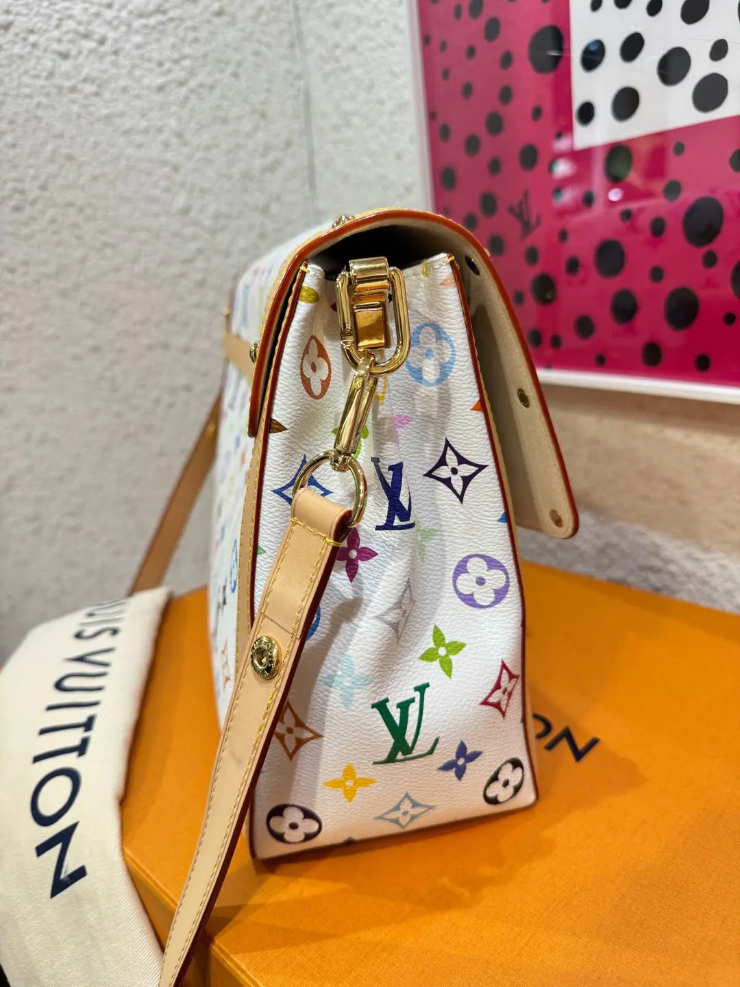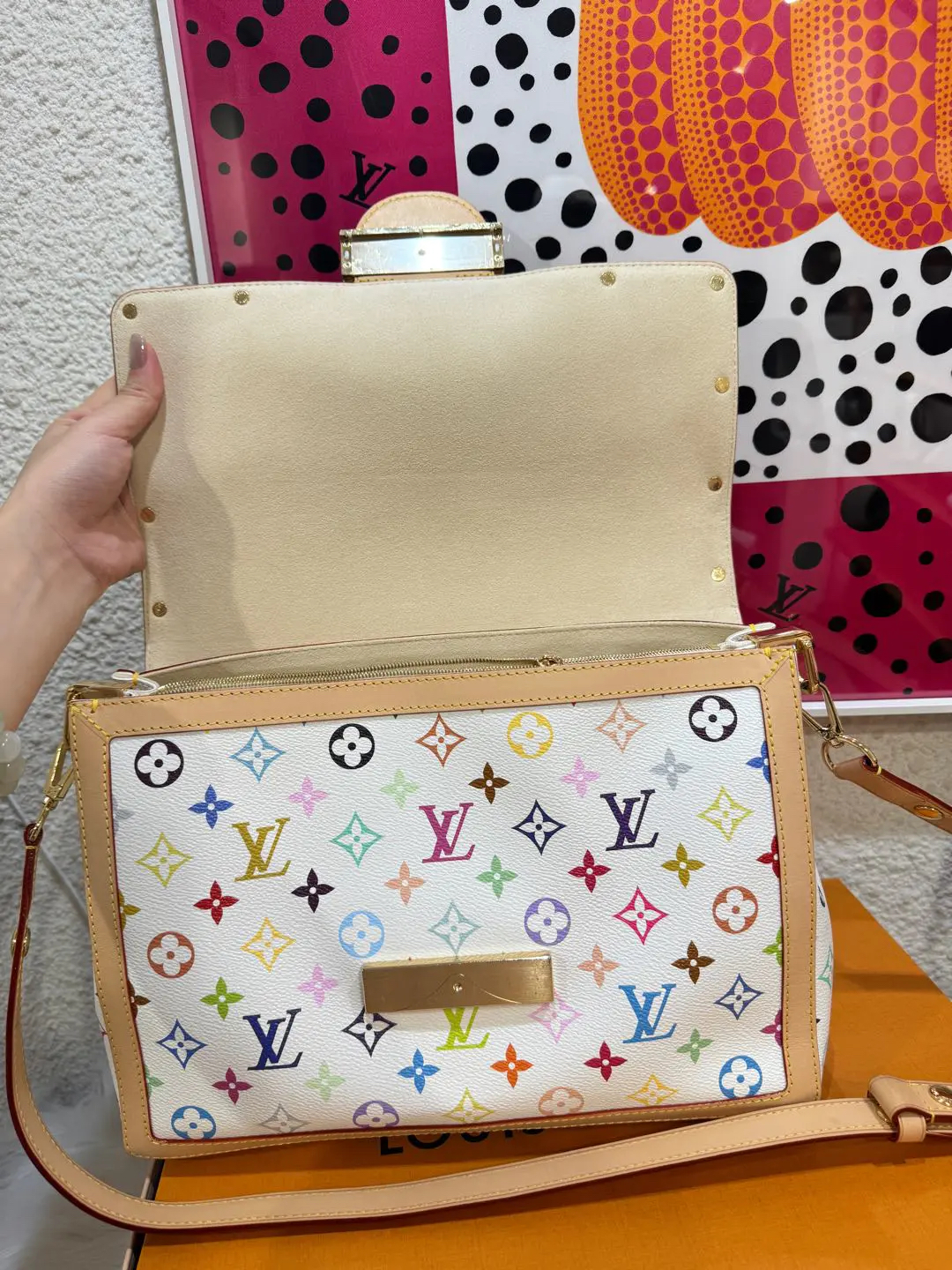 【商品详情】正品二手 LV 达芙妮 大号 白三彩 村上隆联名 斜挎包💗98新 30×22 芯片款 配件:肩带 链条 票 防尘袋 盒子。26年新款 村上隆时隔二十年合作限量款