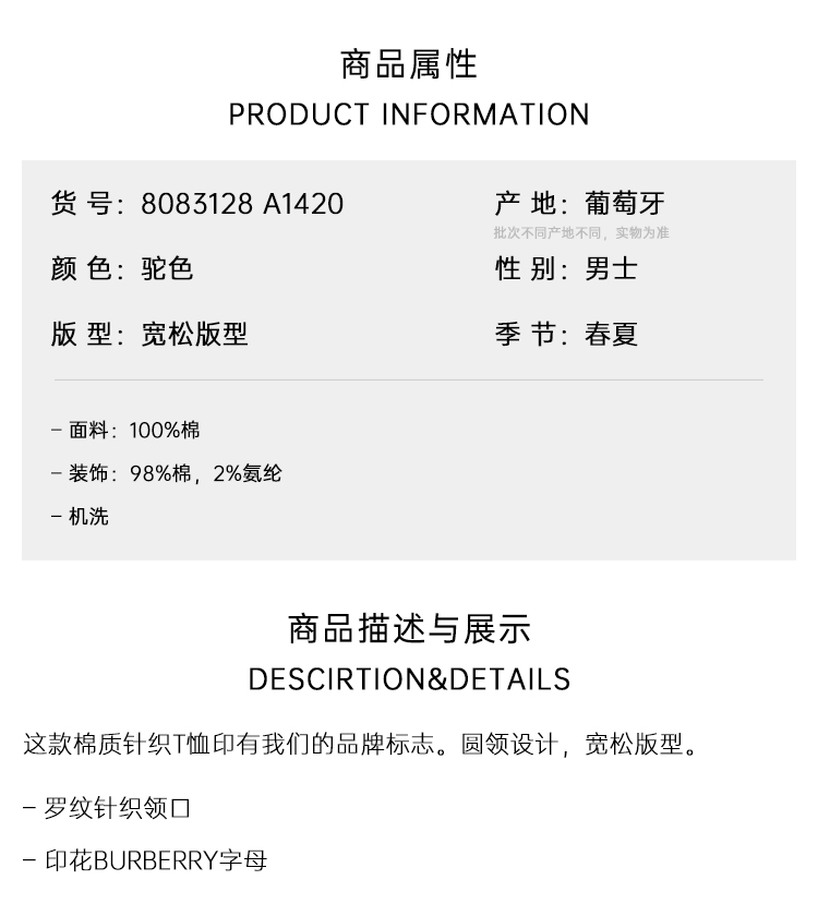 BURBERRY 巴宝莉 男士字母徽标印花棉质圆领短袖T恤 驼色 8083128 A1420