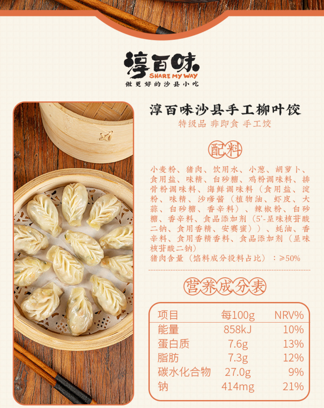 淳百味沙县手工猪肉柳叶蒸饺(240g±15g/盒 12枚)
